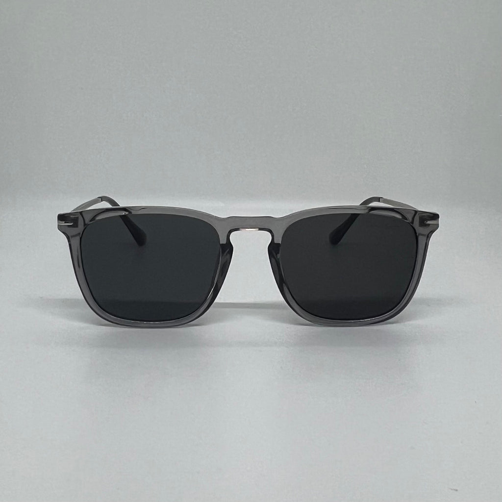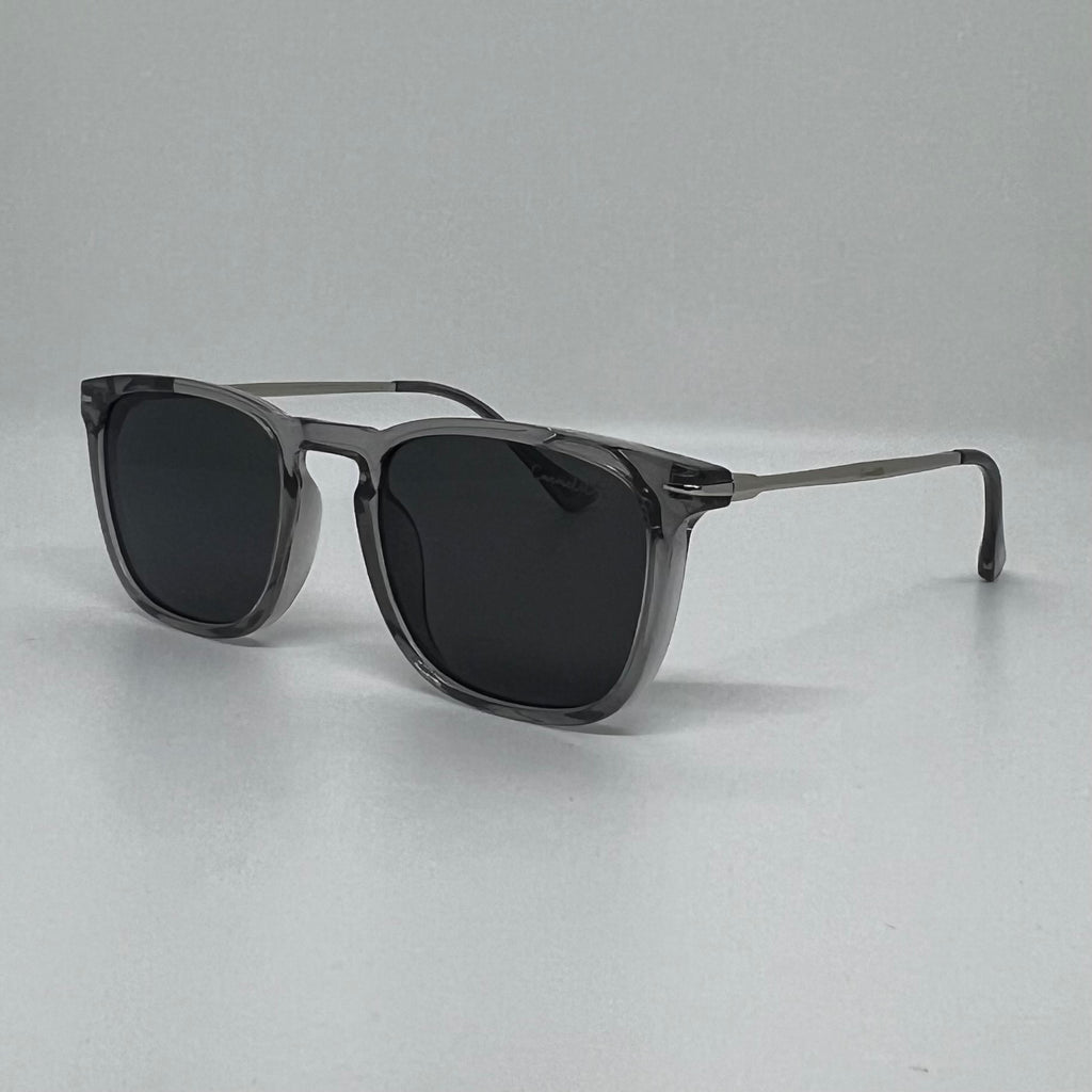 Óculos com hastes em metal, frente em acetato translúcido cinza e lente preta.