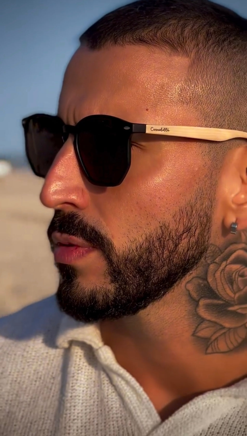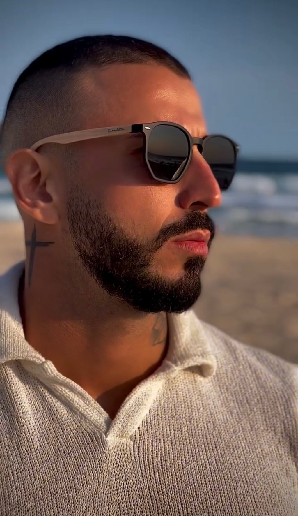 Óculos com hastes de bambu, frente em acetato italiano preto com lente preta.