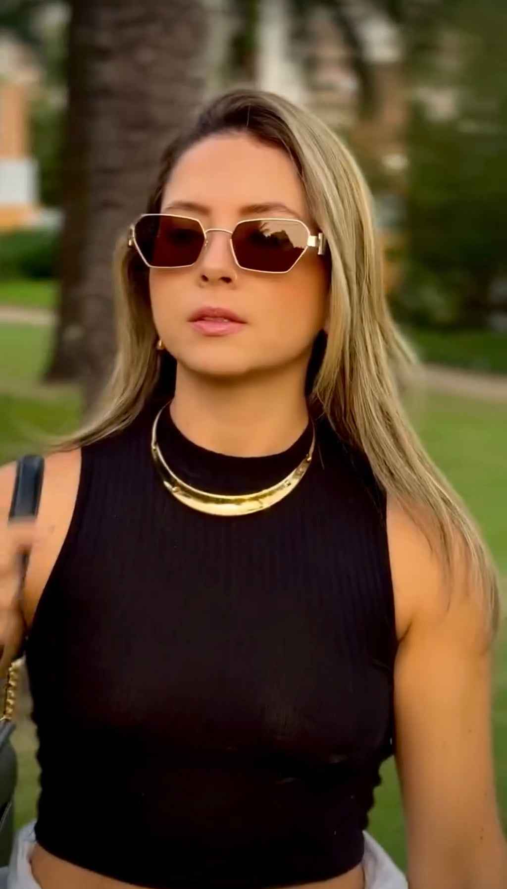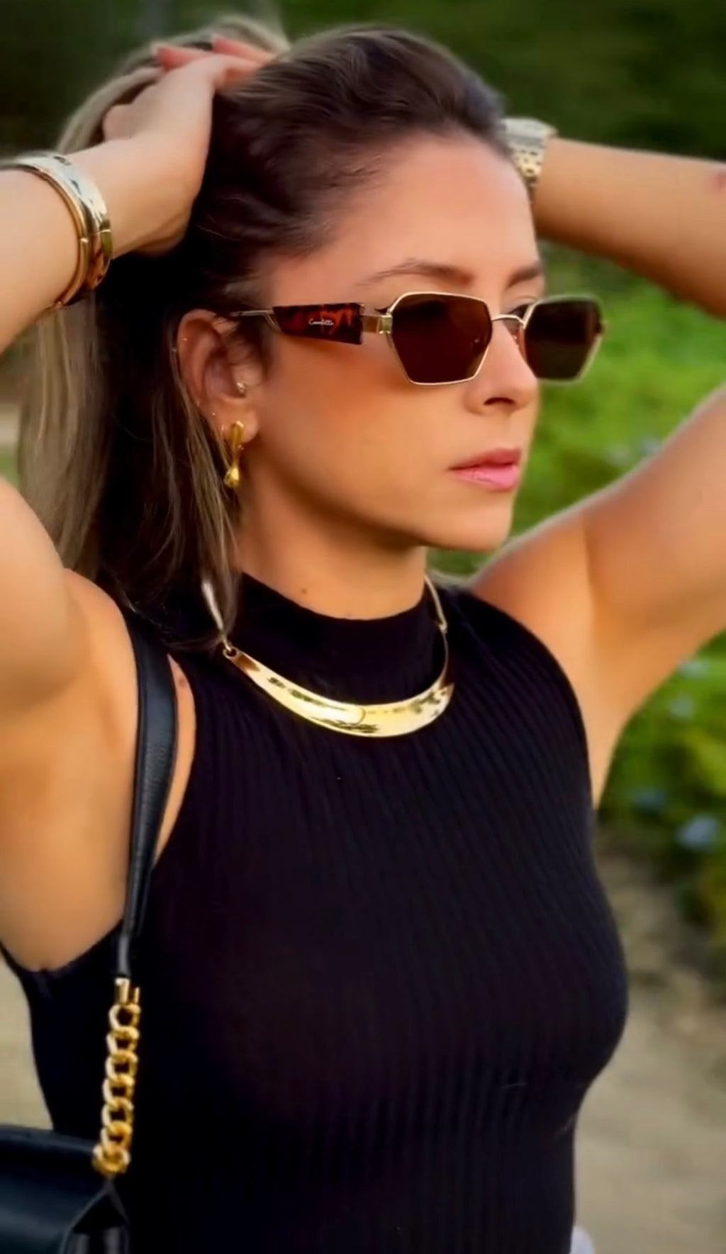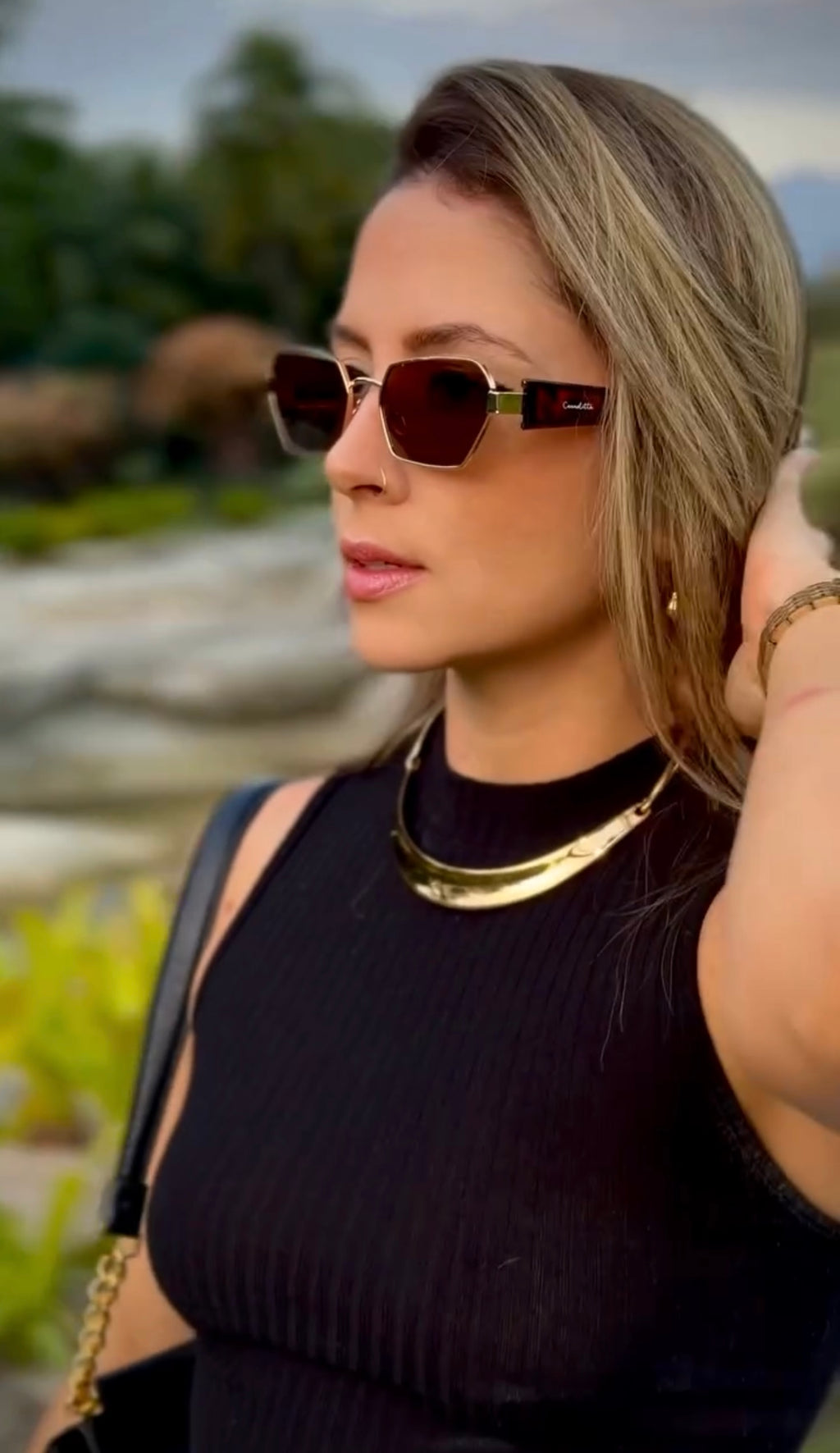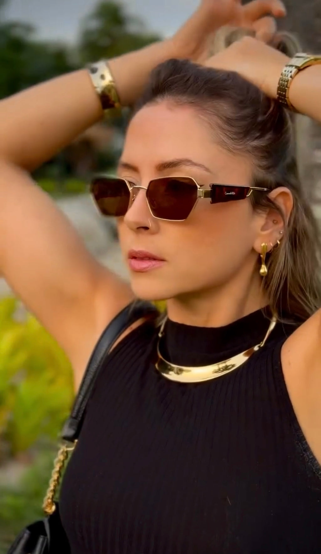 Óculos com hastes em metal dourado, detalhes em acetato tartaruga com lente marrom.