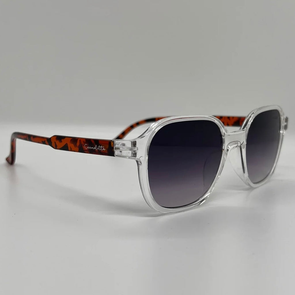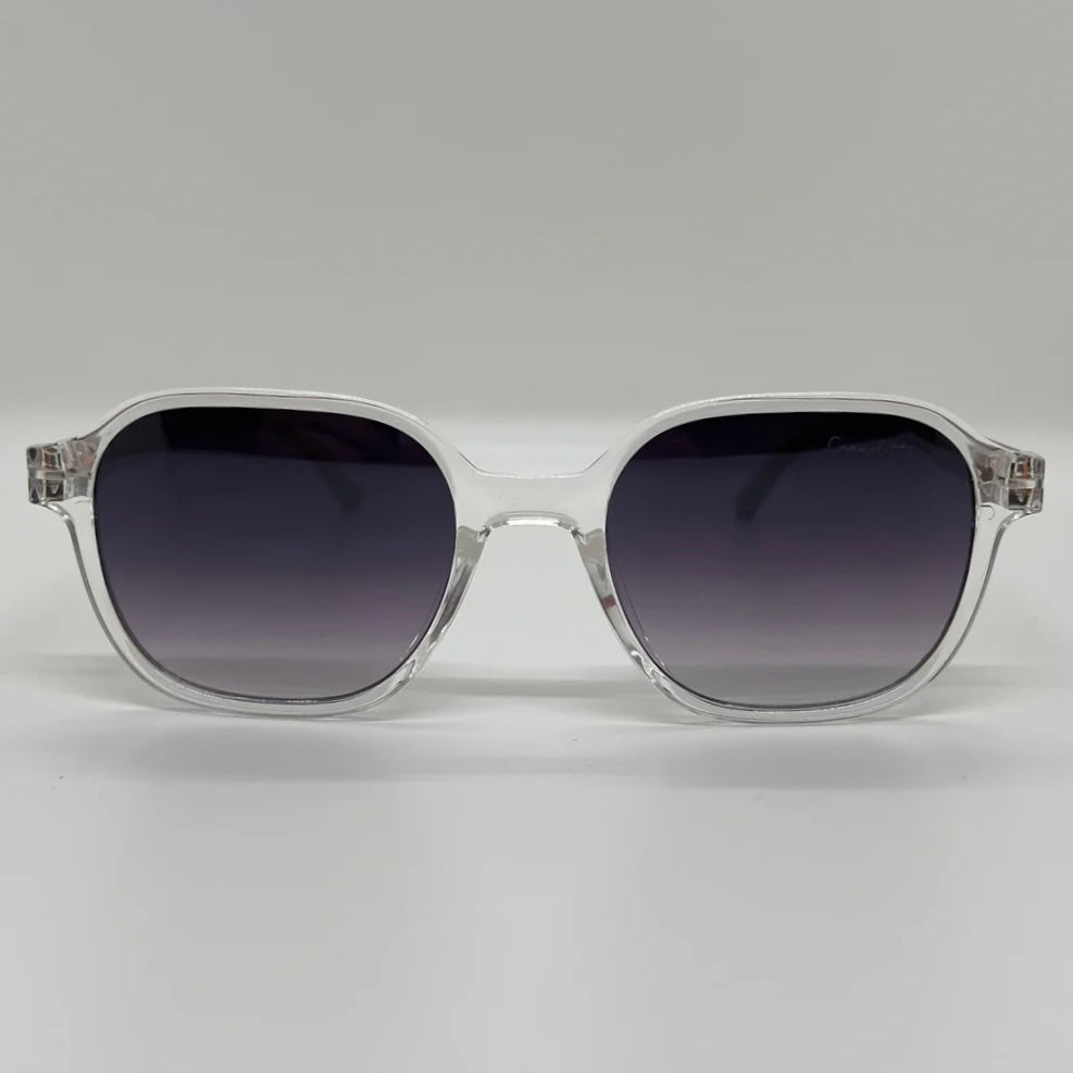 Óculos com hastes em acetato jaguar, com frente transparente e lente roxa degrade.