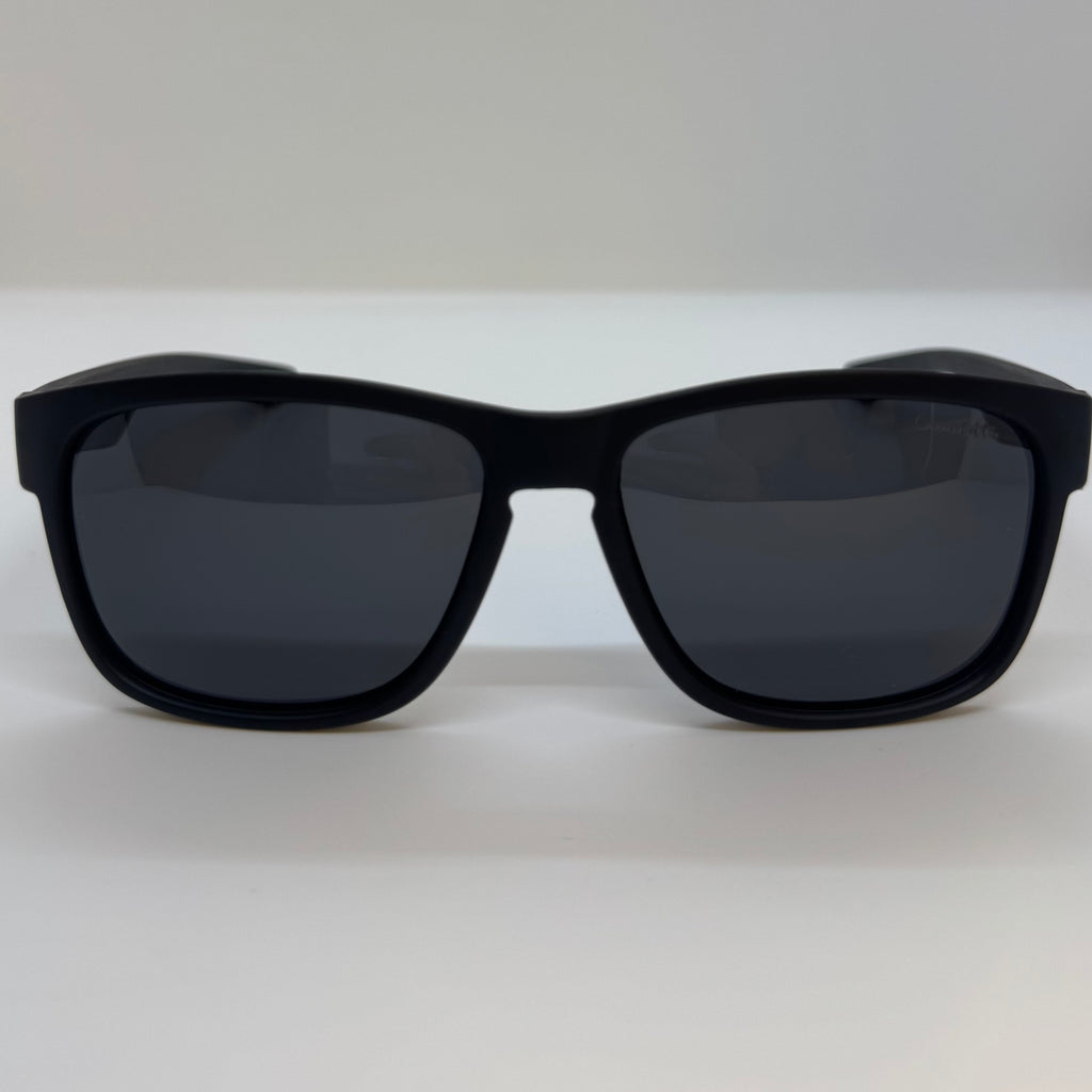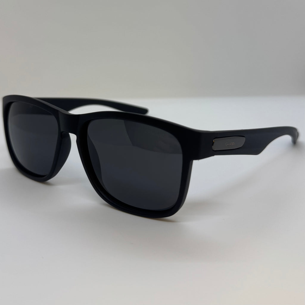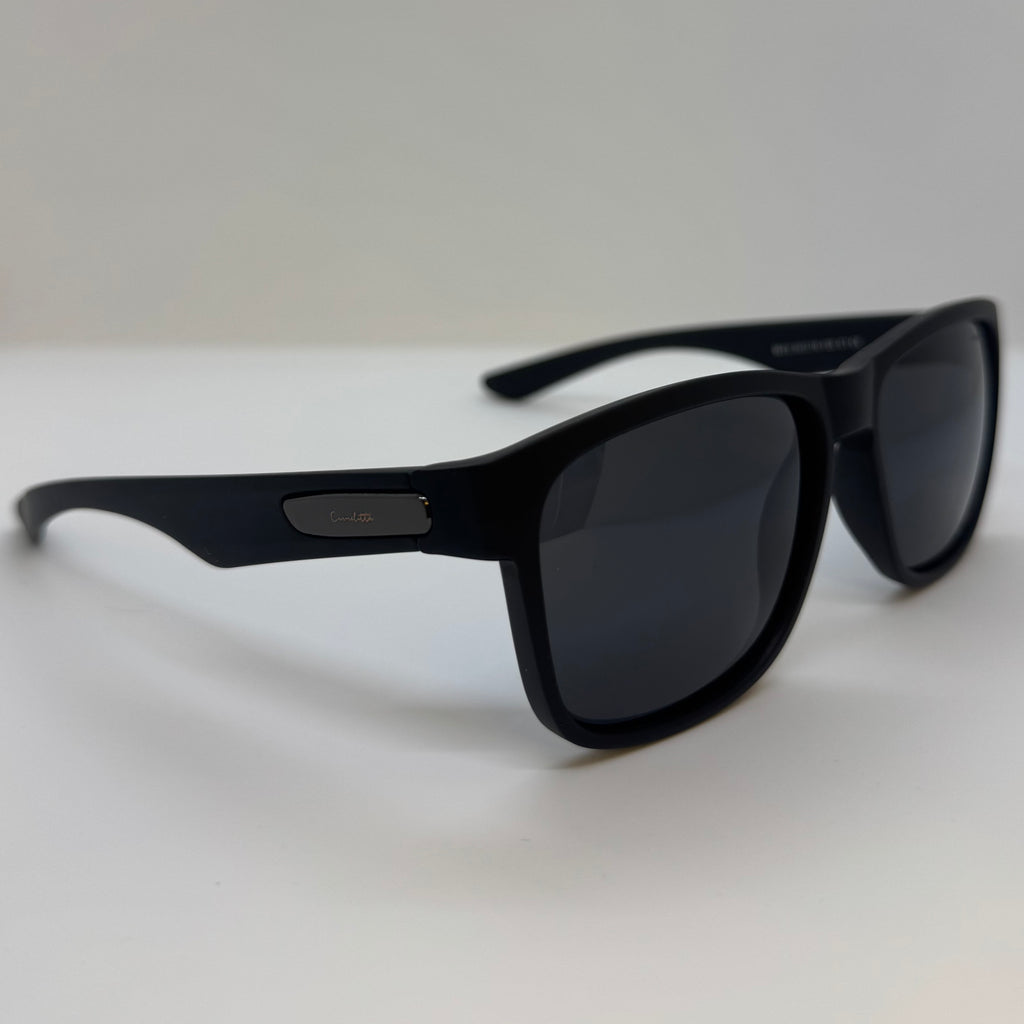 Óculos com hastes em acetato preto com lente preta polarizada.