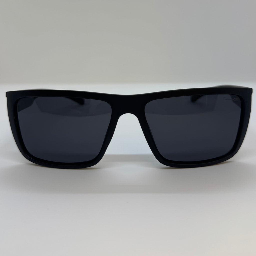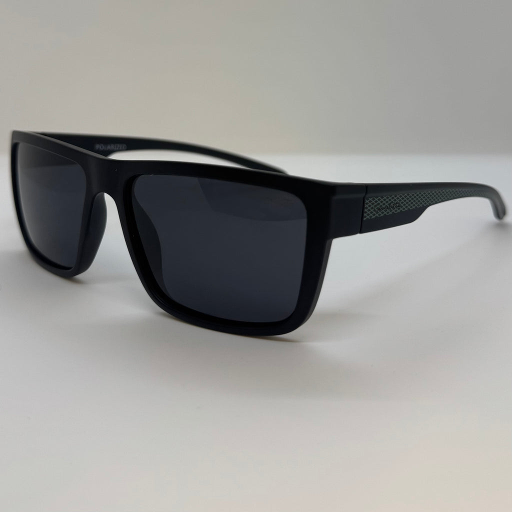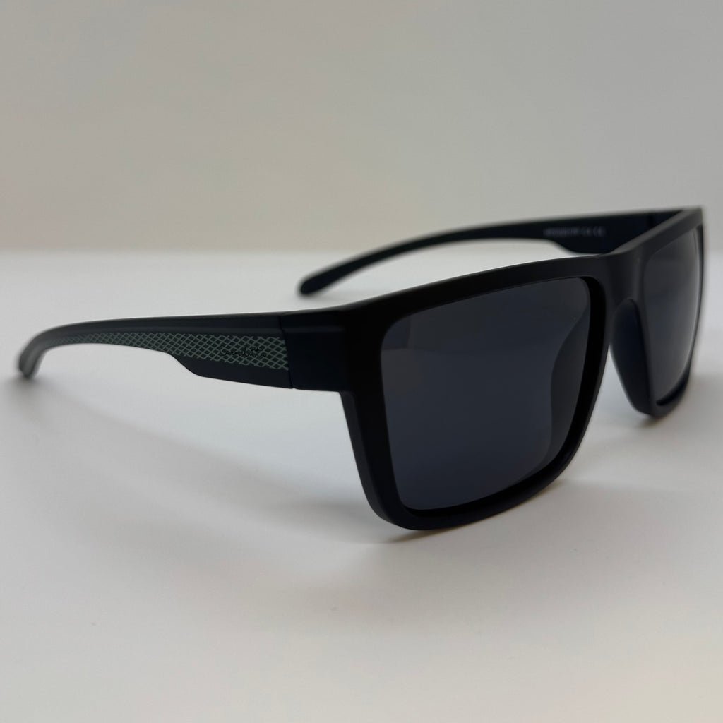 Óculos com hastes em acetato preto com lente preta polarizada.