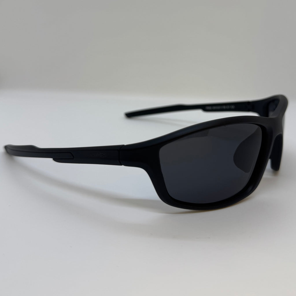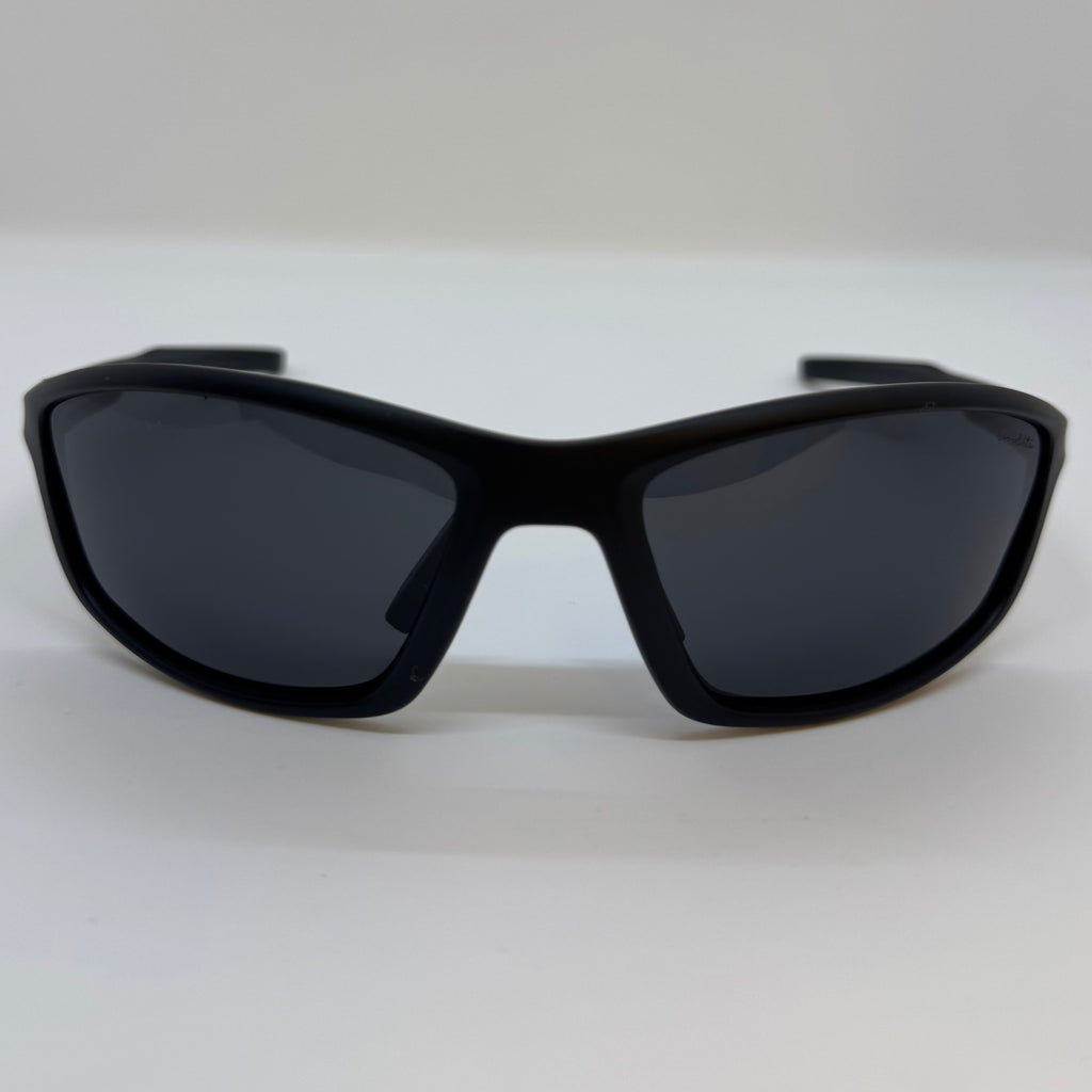 Óculos com hastes em acetato preto com lente preta polarizada.