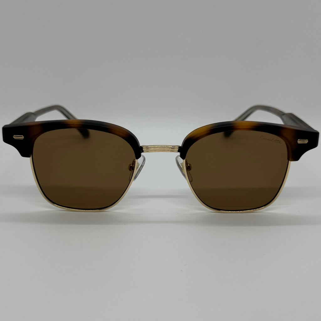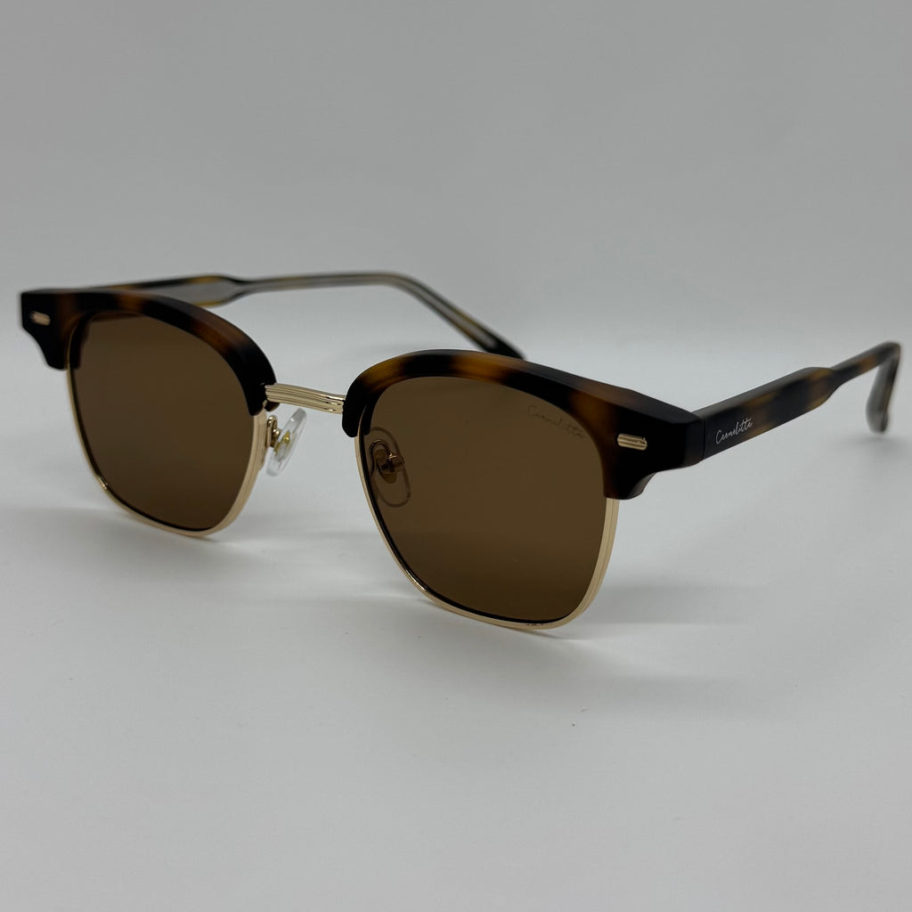 Oculos com haste em acetato tartaruga fosco com metal dourado e lente marrom.