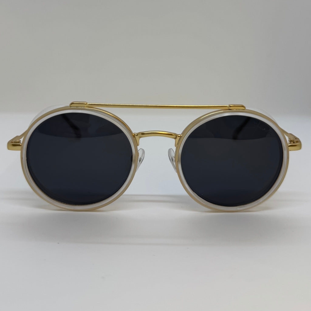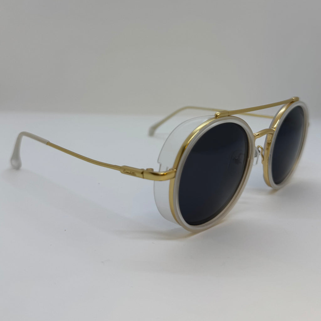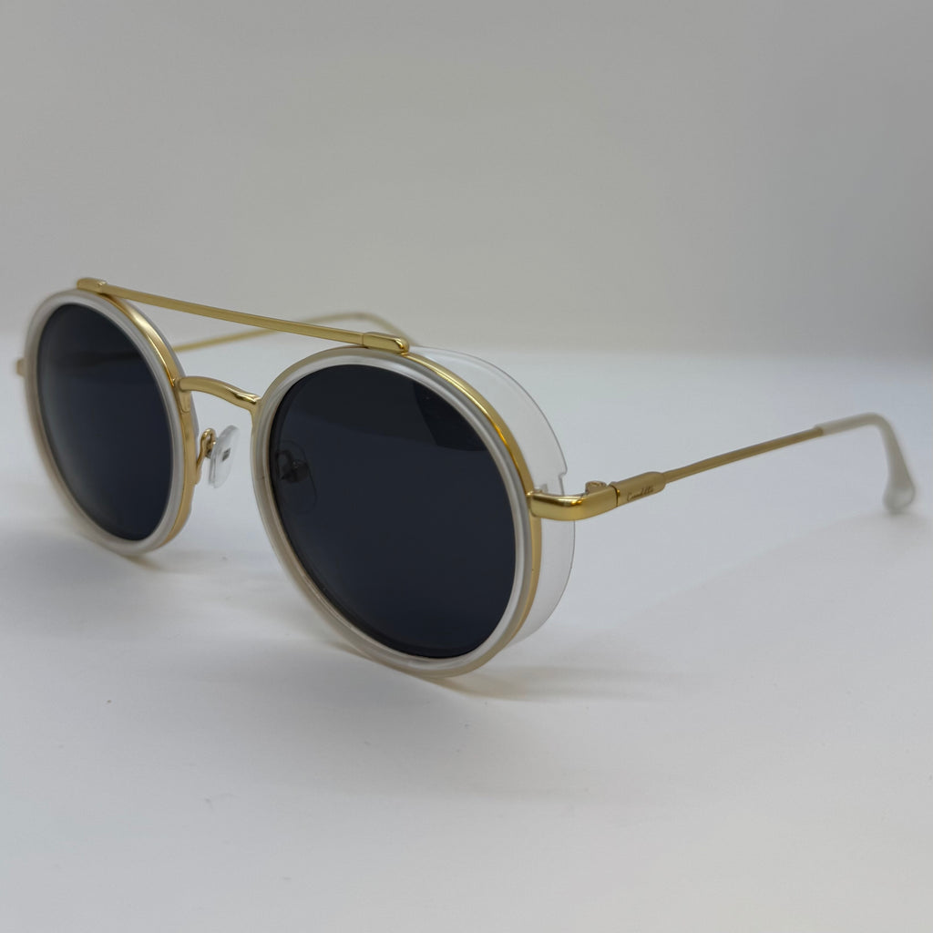 Óculos com hastes douradas, frente em acetato gelo fosco e lente preta.