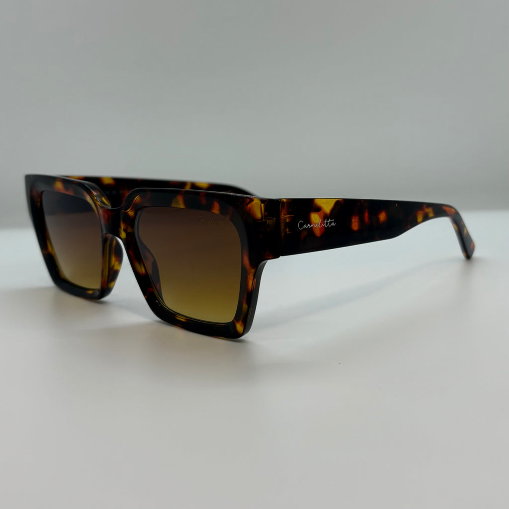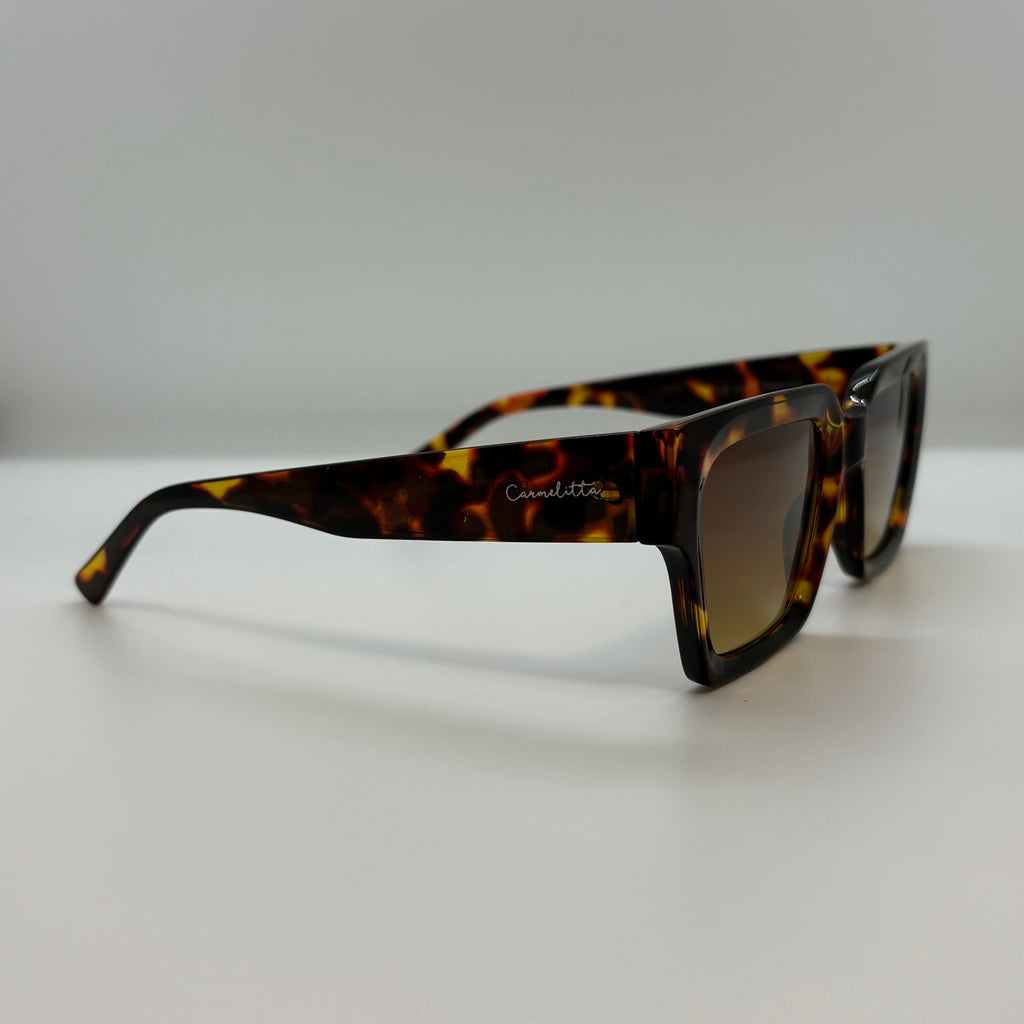 Óculos com armação e hastes em tartaruga( tons de marrom e âmbar) em acetato e lentes marrom degradê.