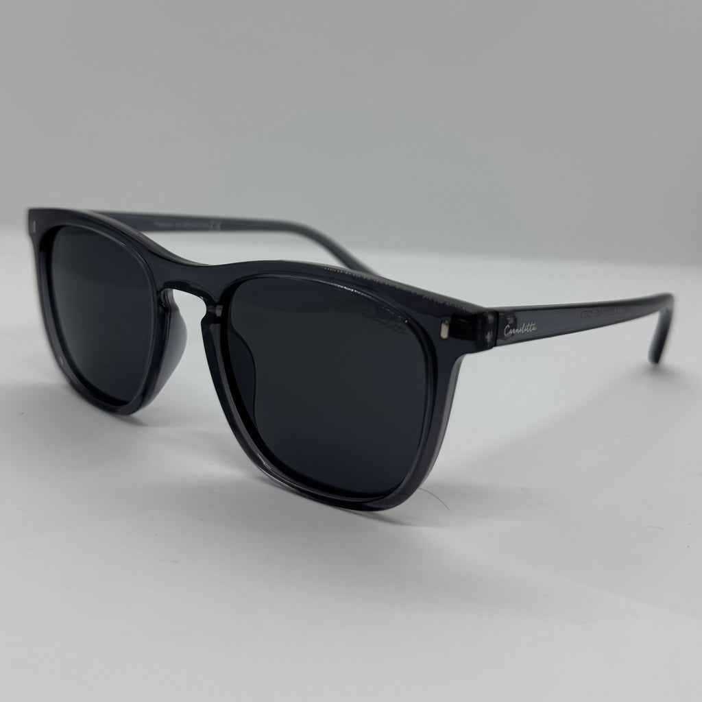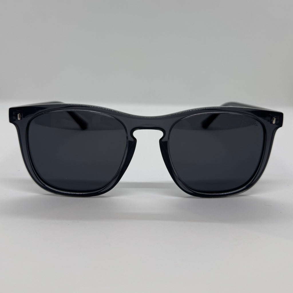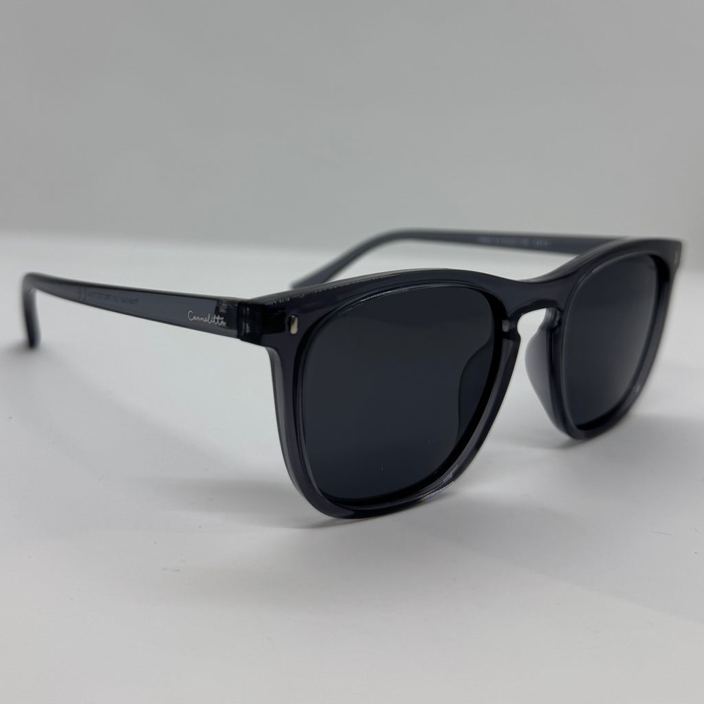 Óculos com hastes cinza translúcido com lente preta.