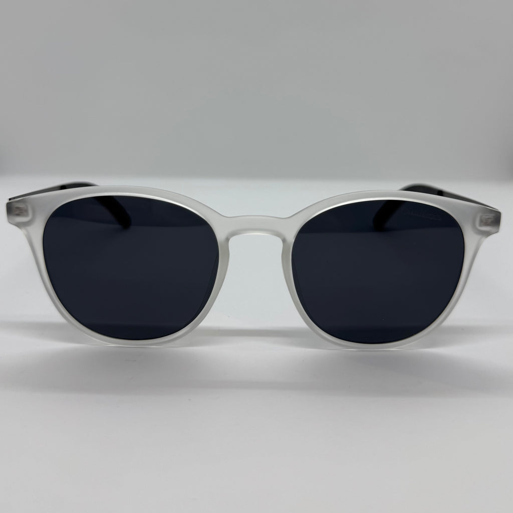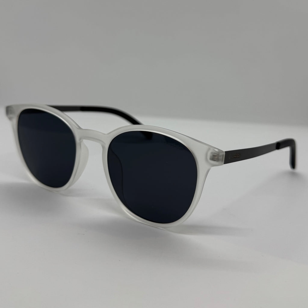 Óculos com metal grafite com frente em acetato gelo fosco e lente preta.
