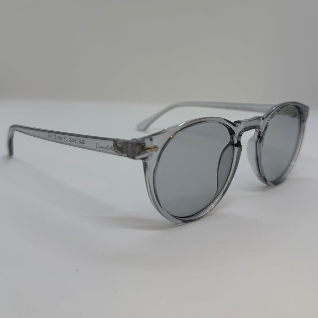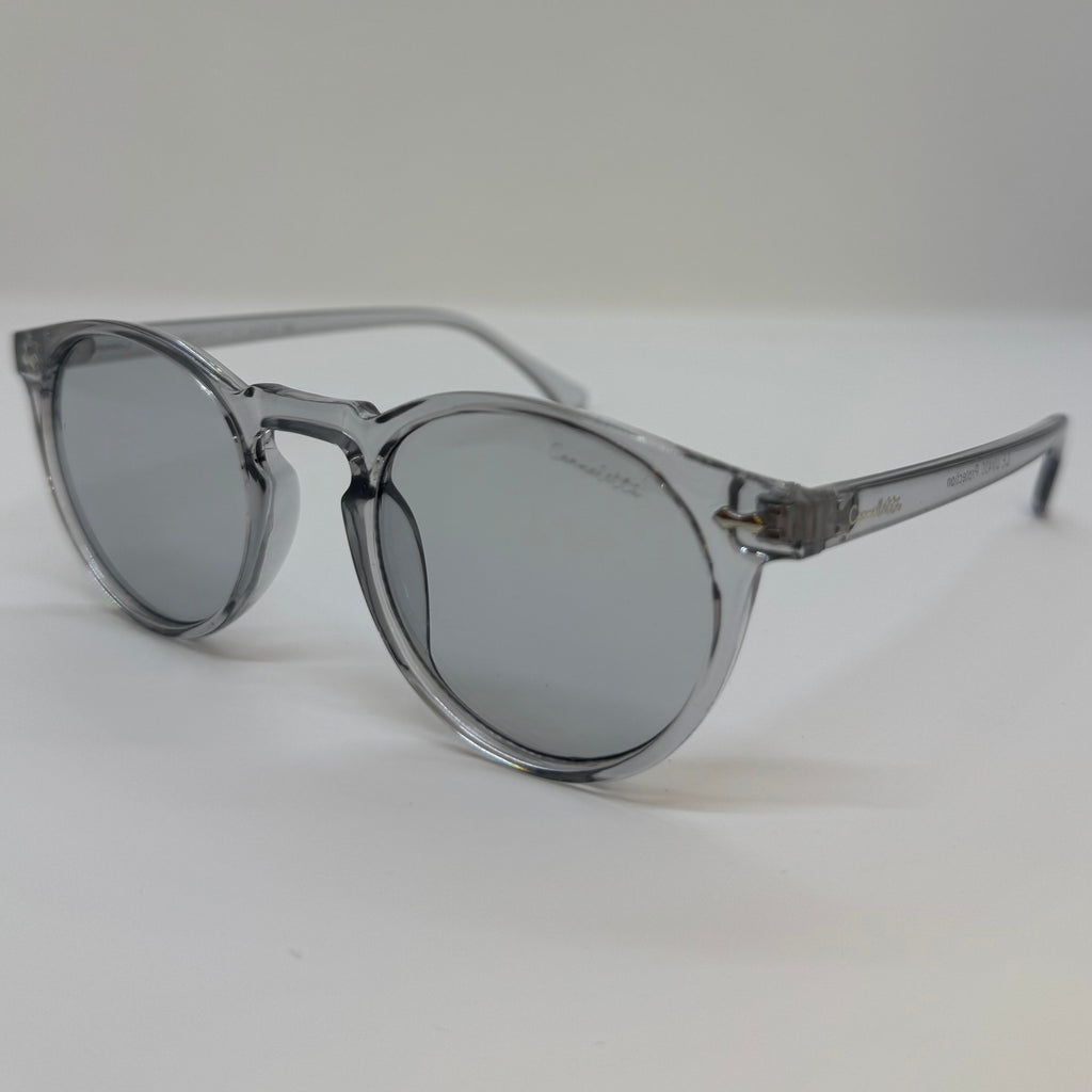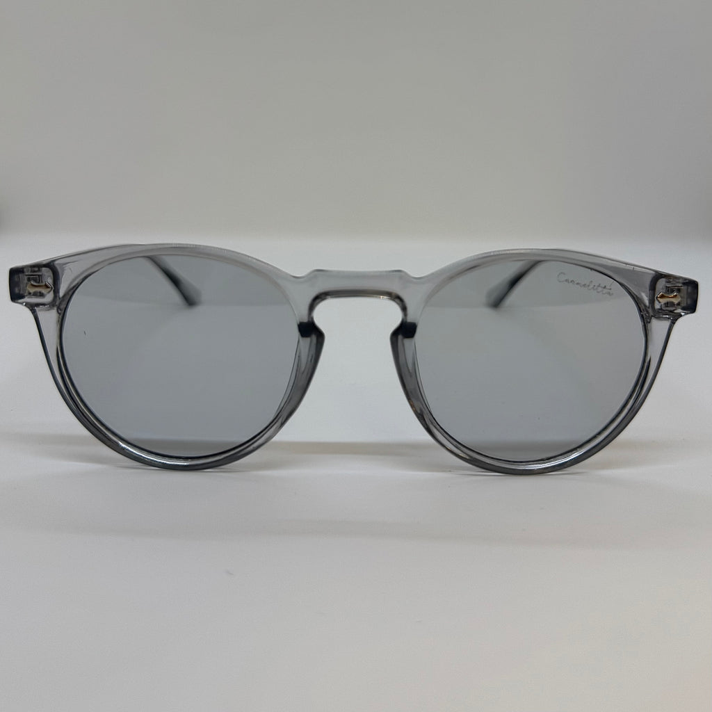 Óculos com hastes em acetato cinza translúcido com lente cinza clara.