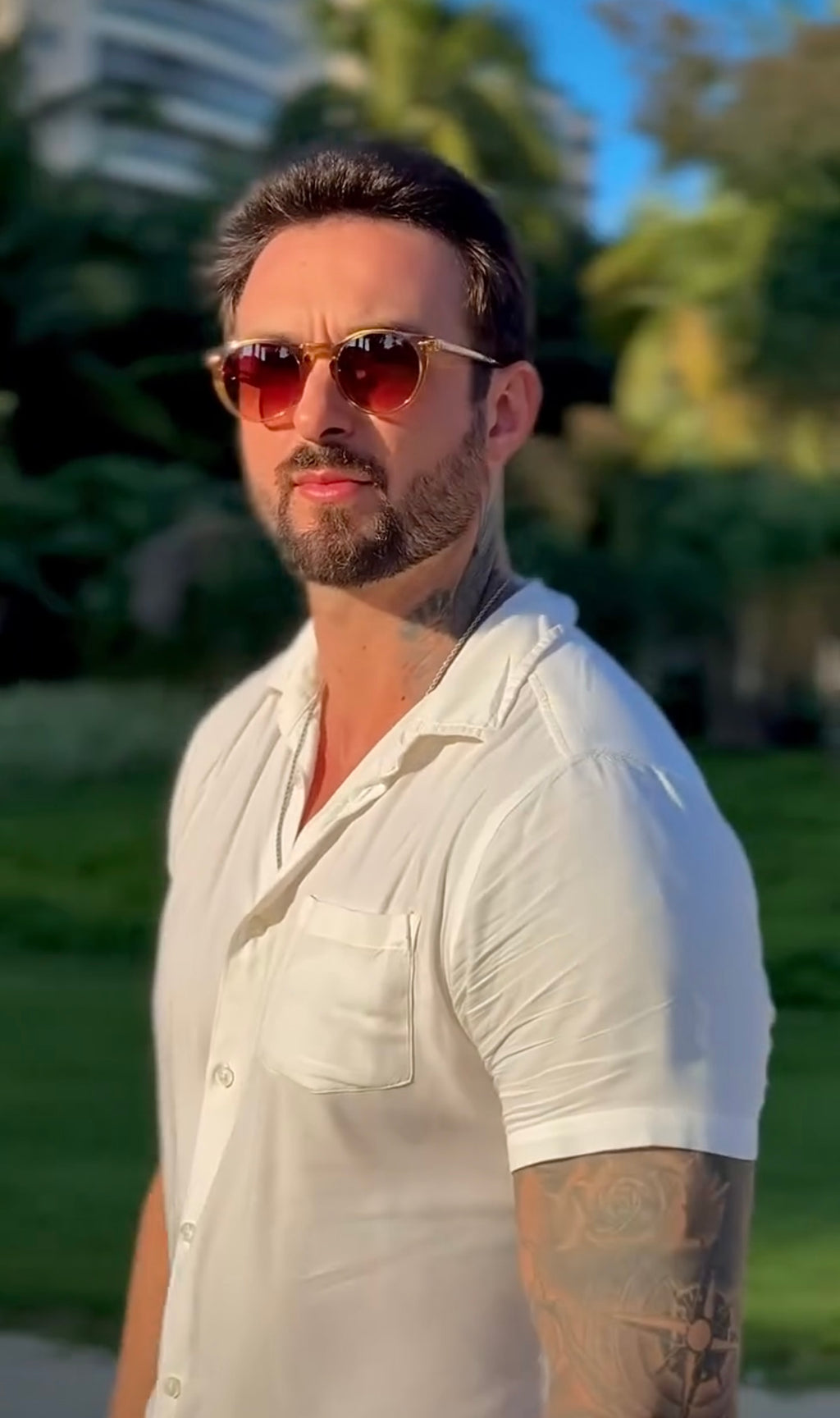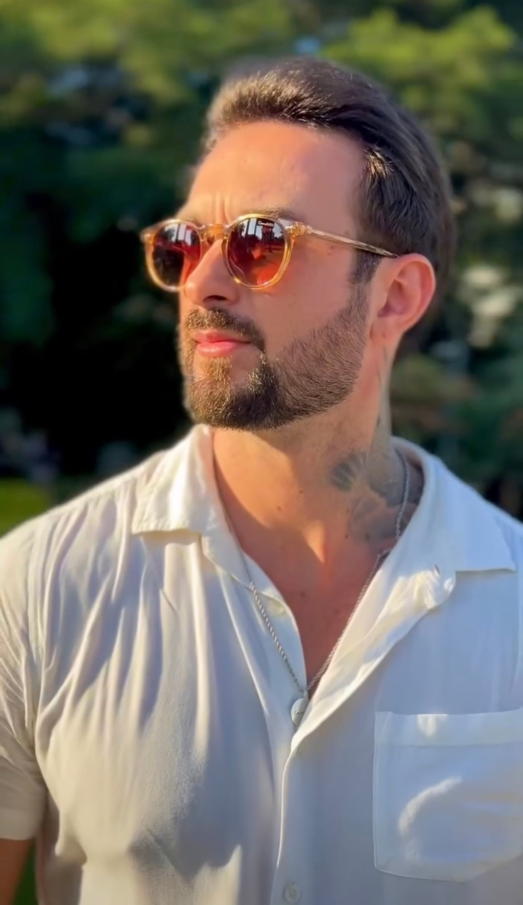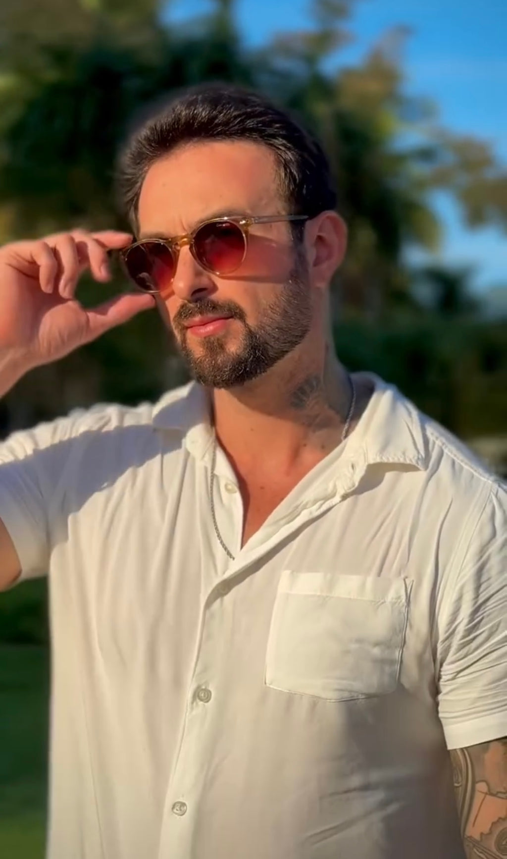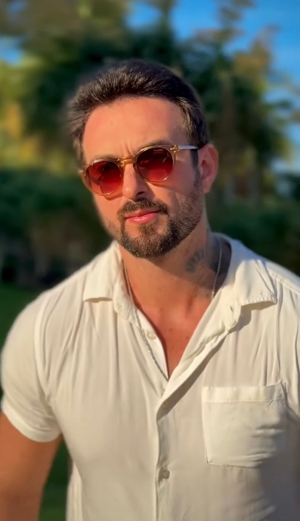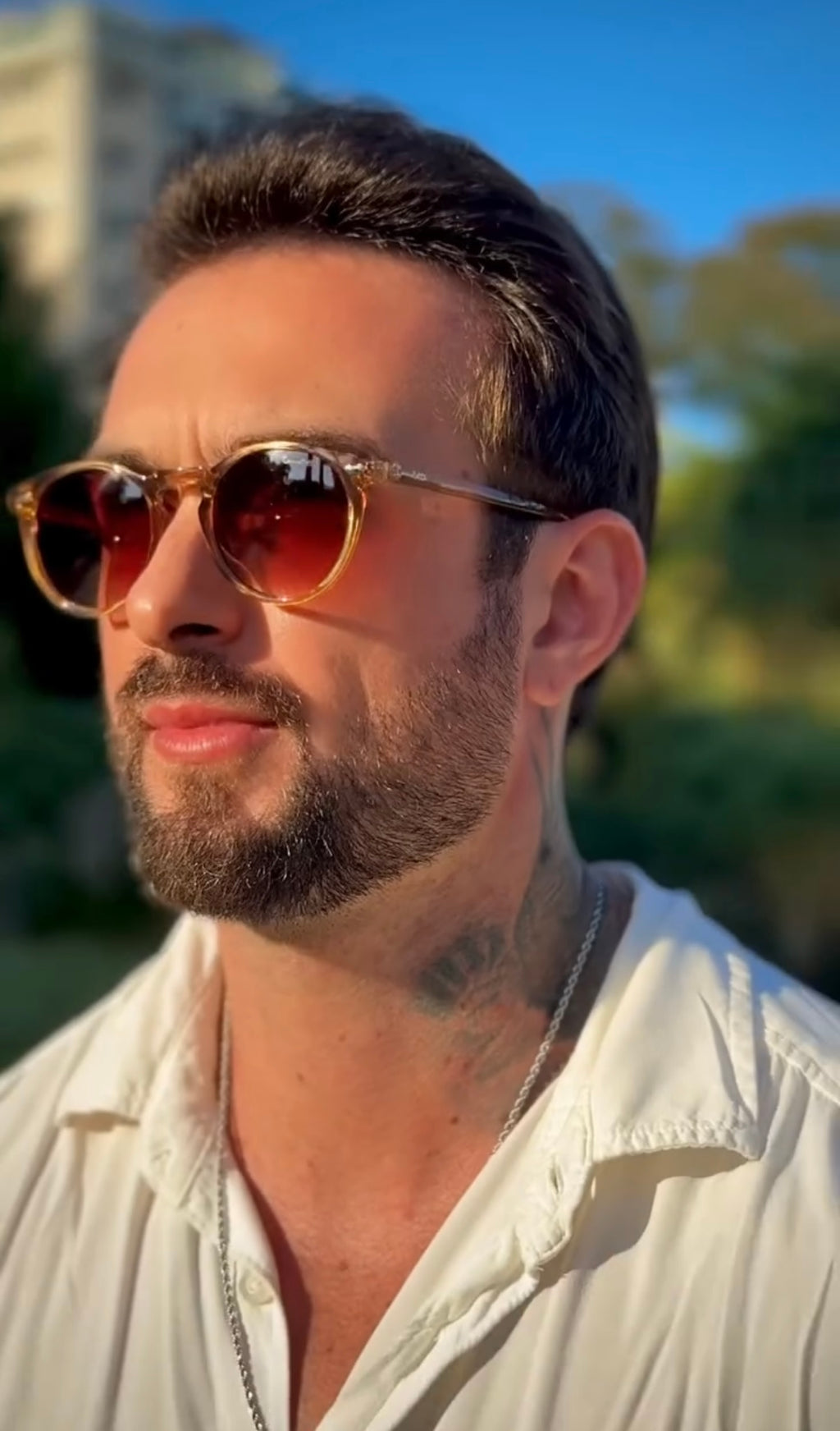Óculos com hastes em acetato rose translúcido e lente marrom degrade.