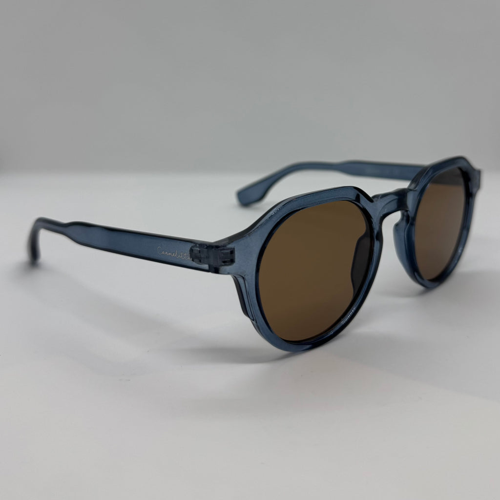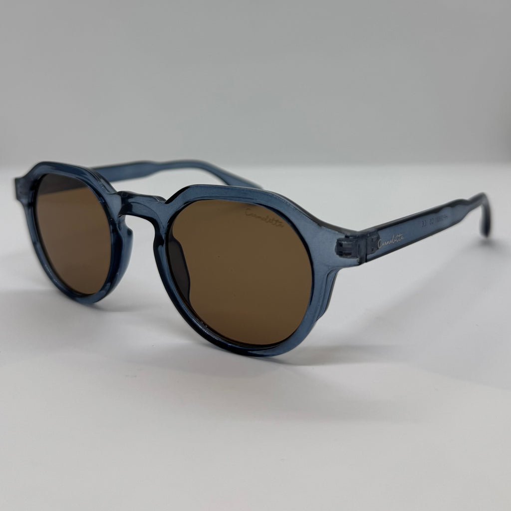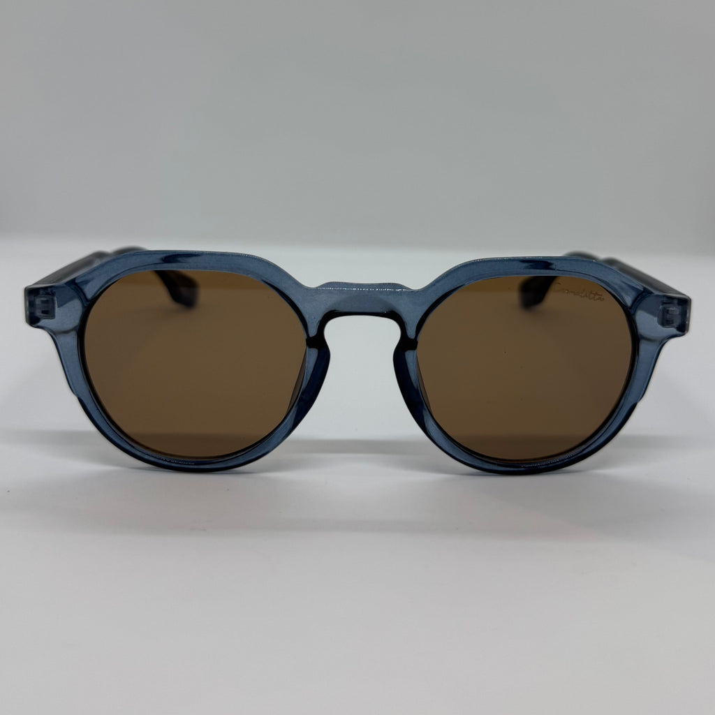 Óculos com hastes em acetato azul translúcido com lente marrom.