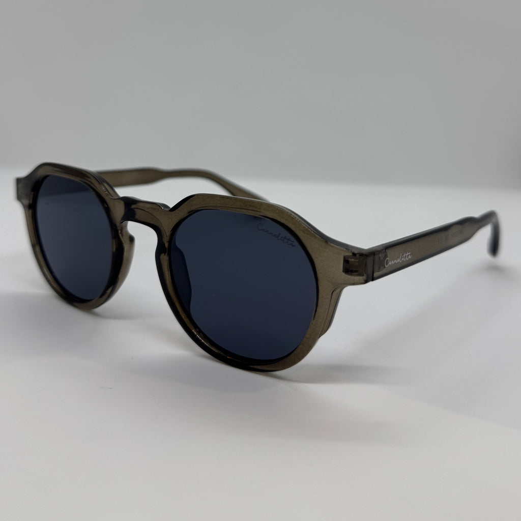 Óculos com hastes em acetato cinza translúcido com lente preta.