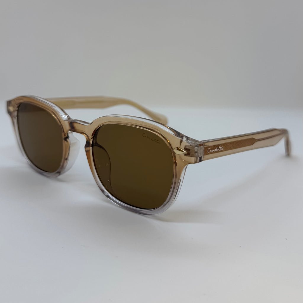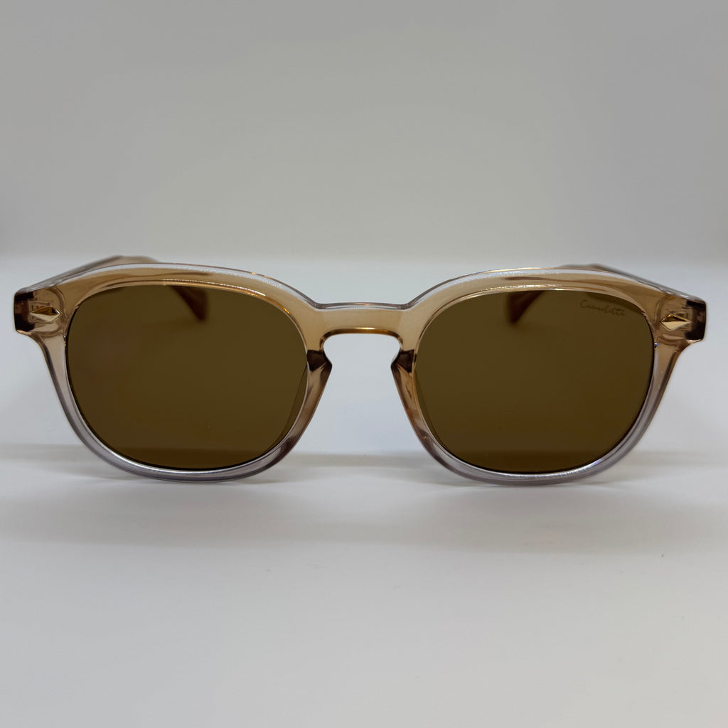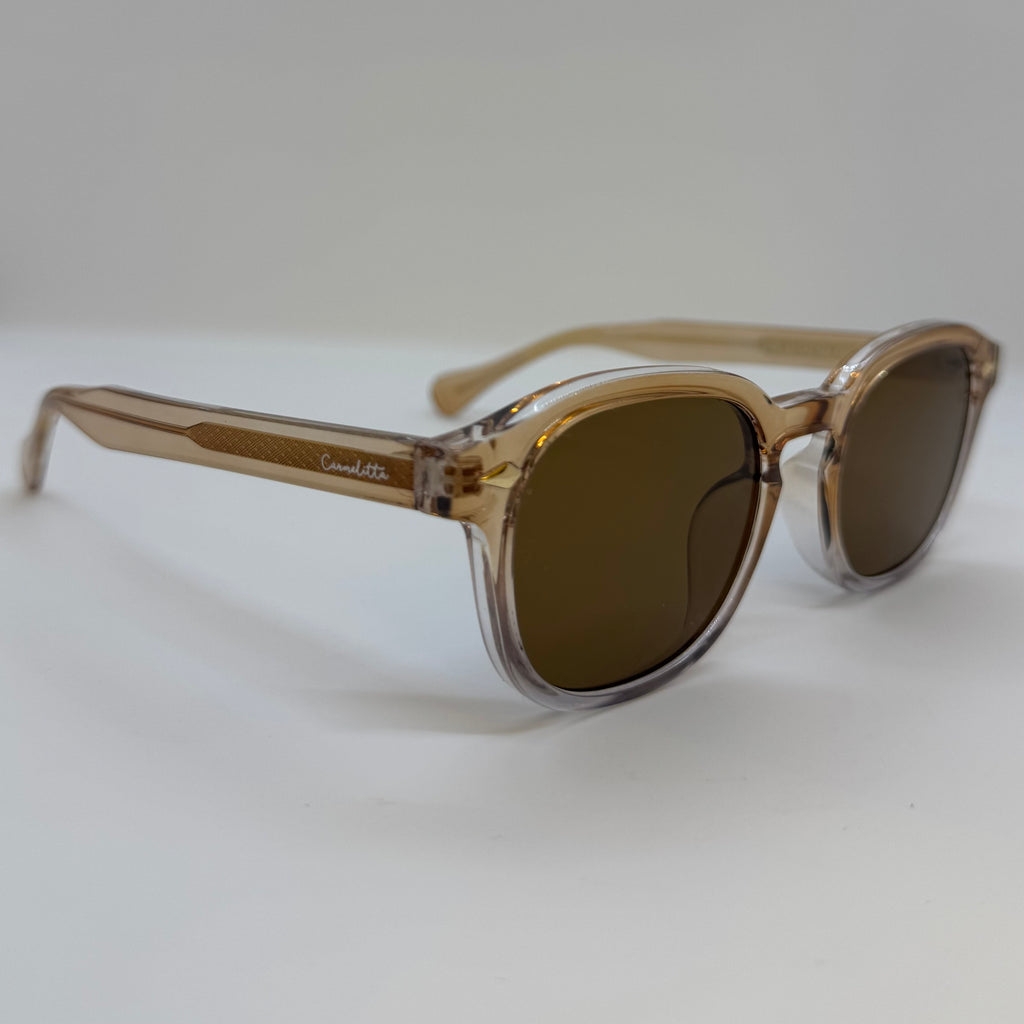 Óculos com hastes e frente em acetato marrom translúcido e lente marrom.