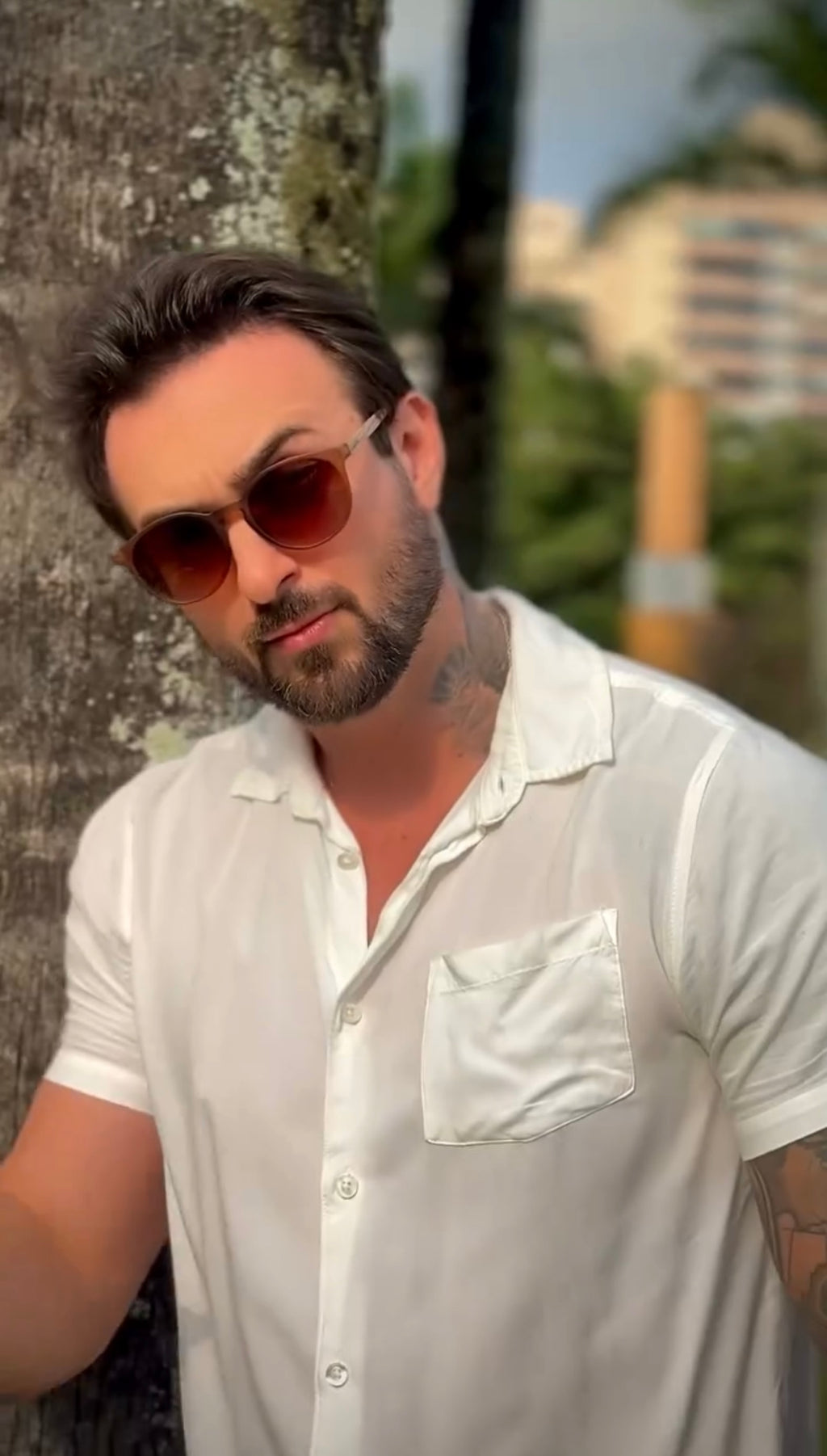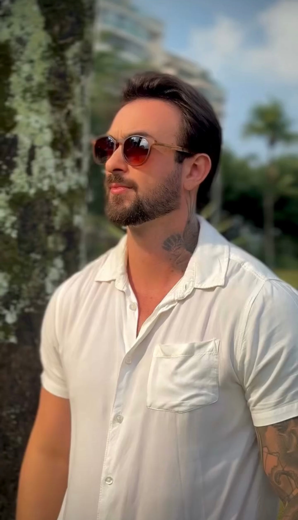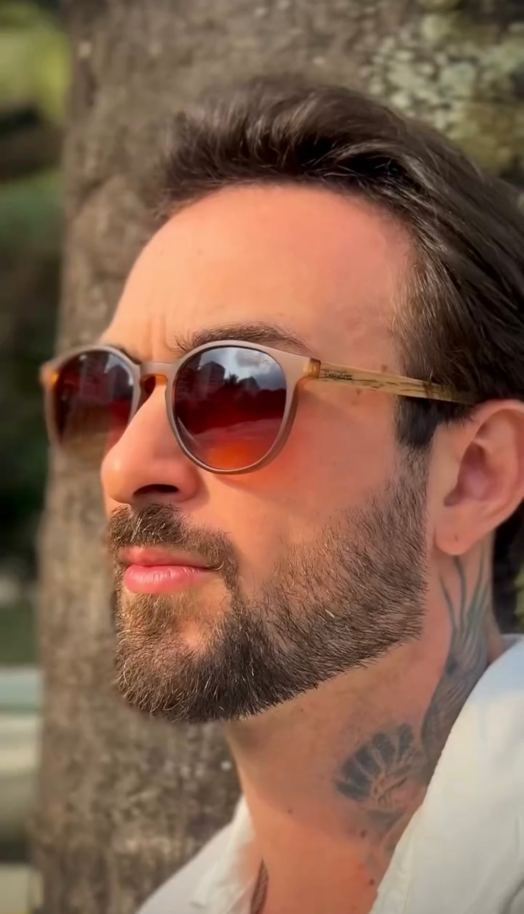 Óculos com hastes em bambu, frente em acetato marrom fosco com lente marrom degrade.