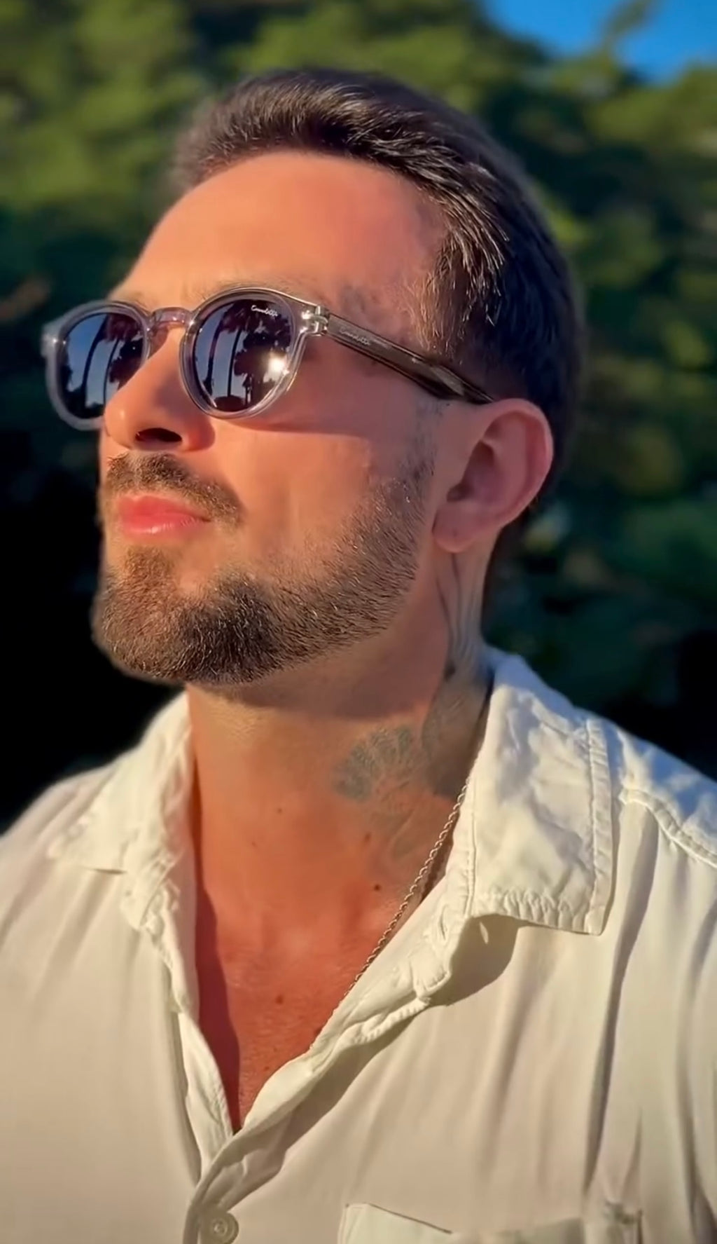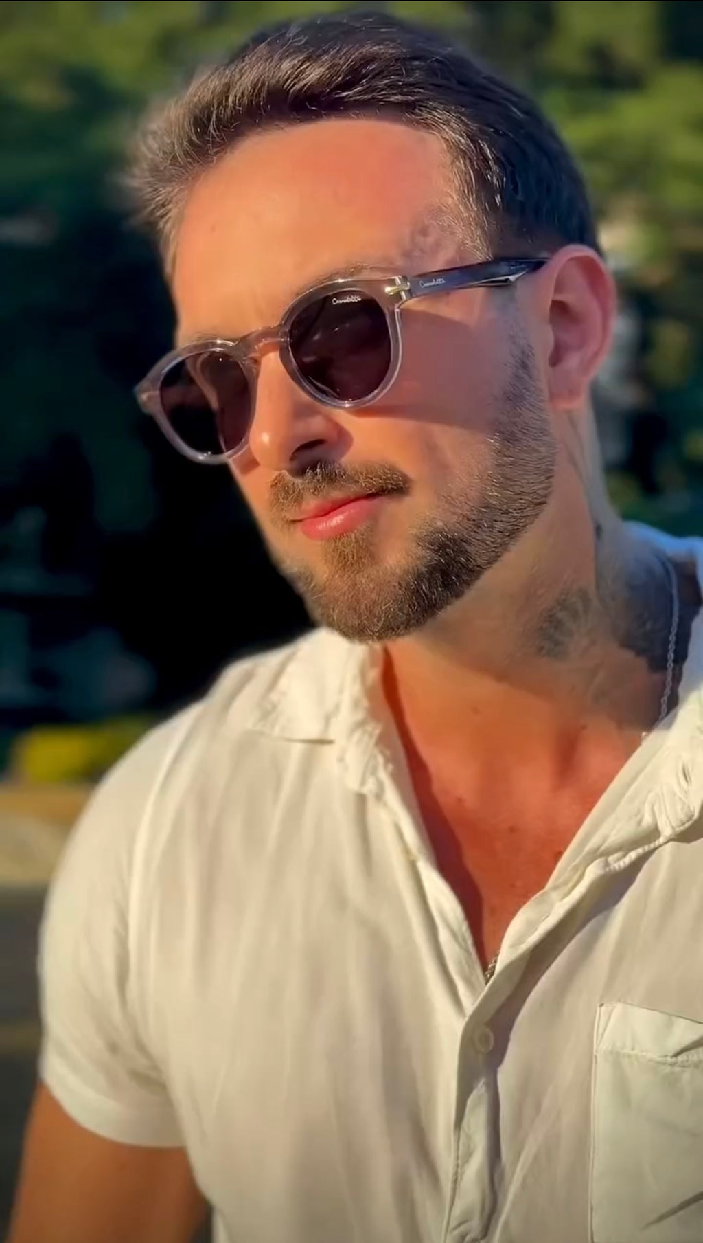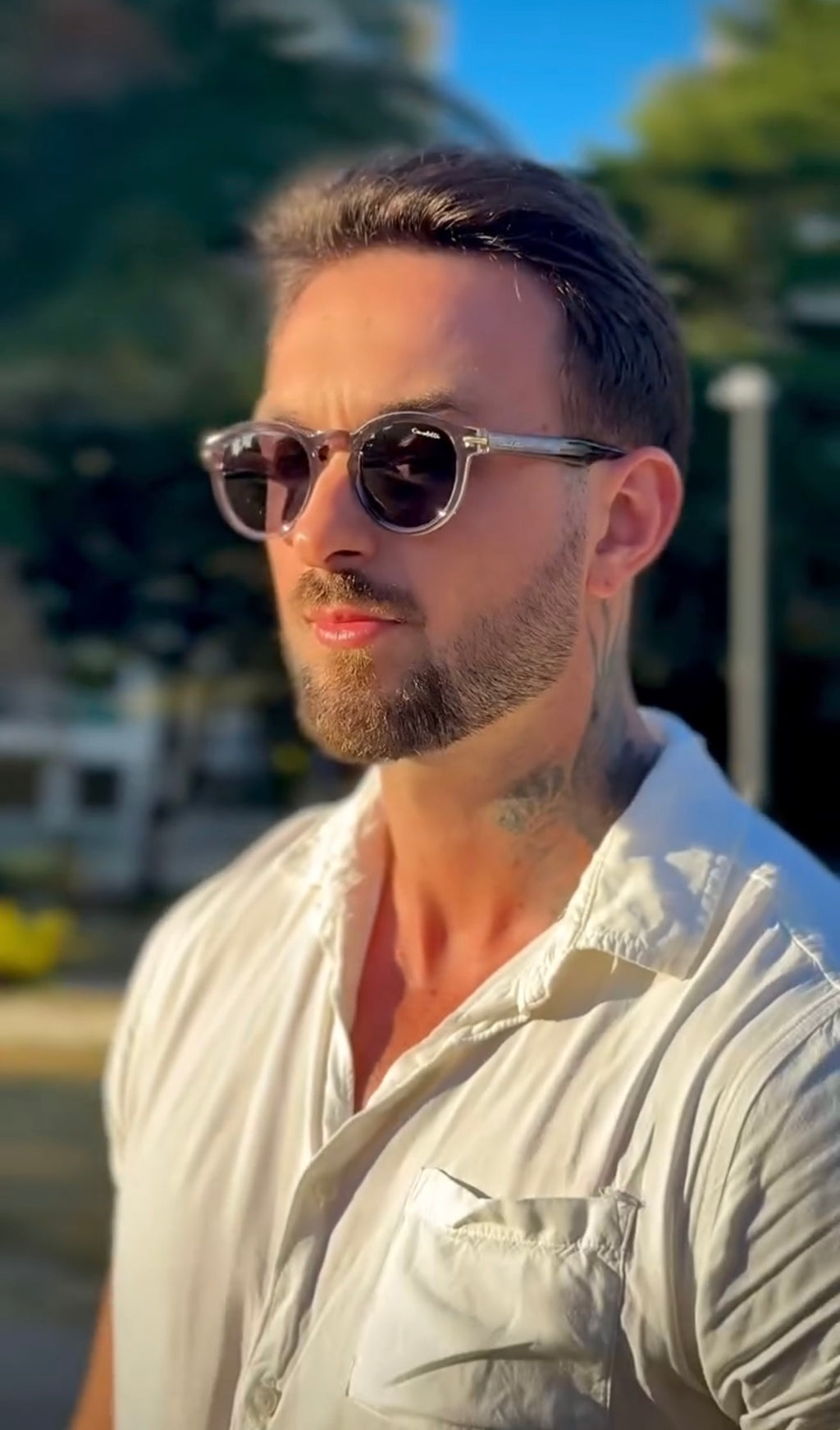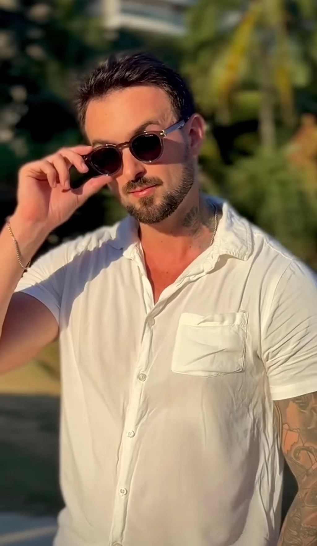 Óculos com hastes em acetato cinza translúcido com lente preta.