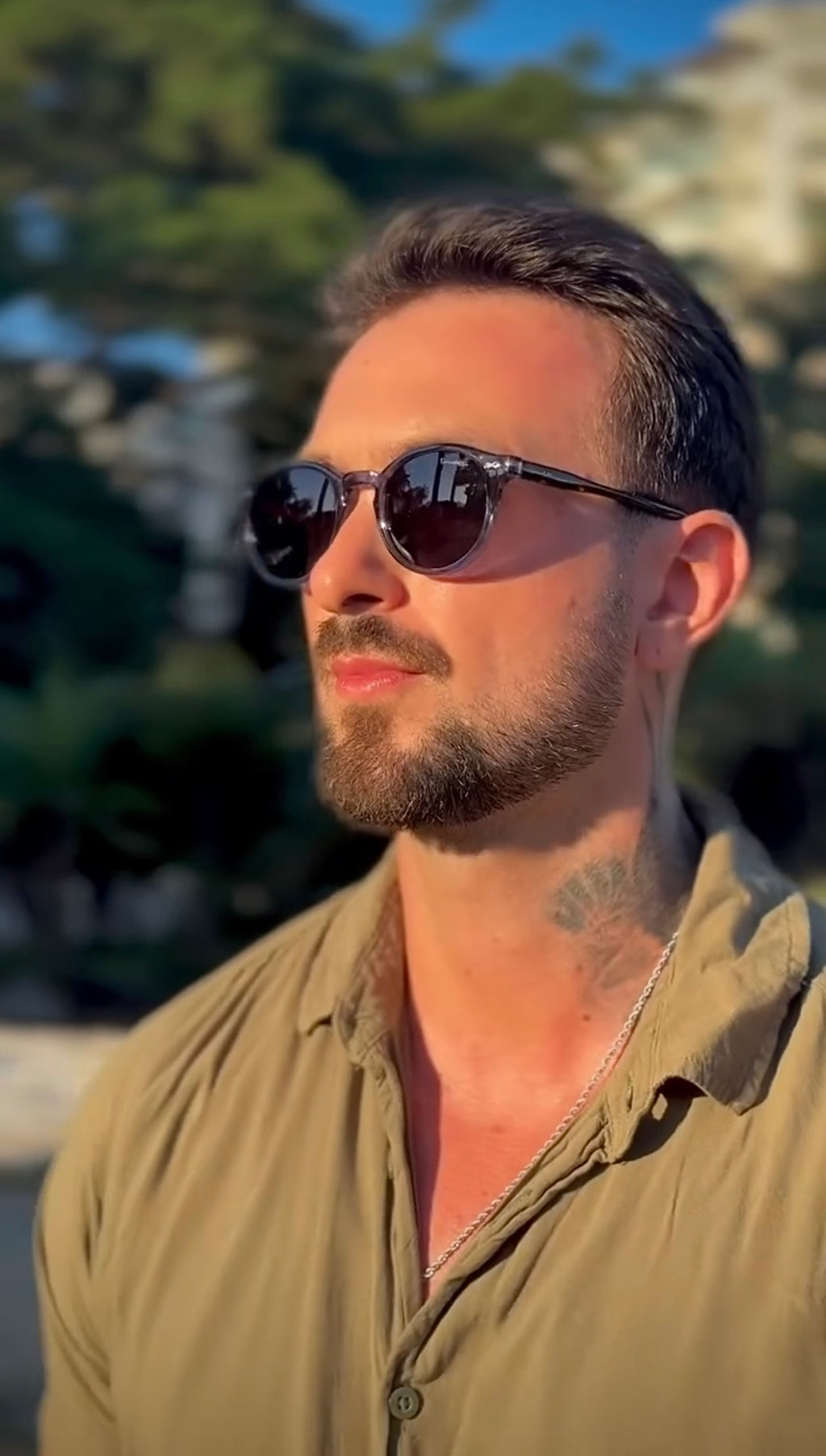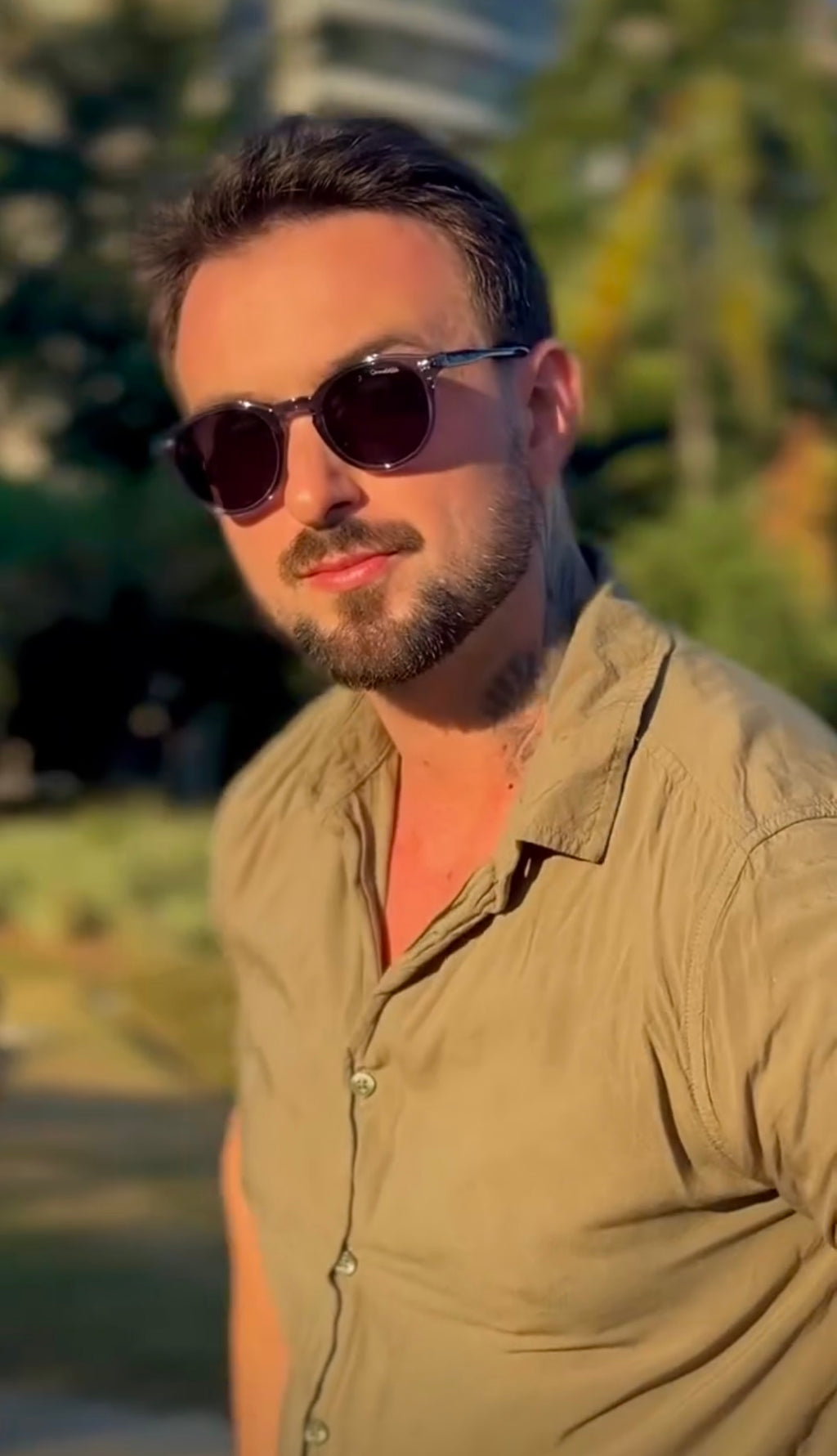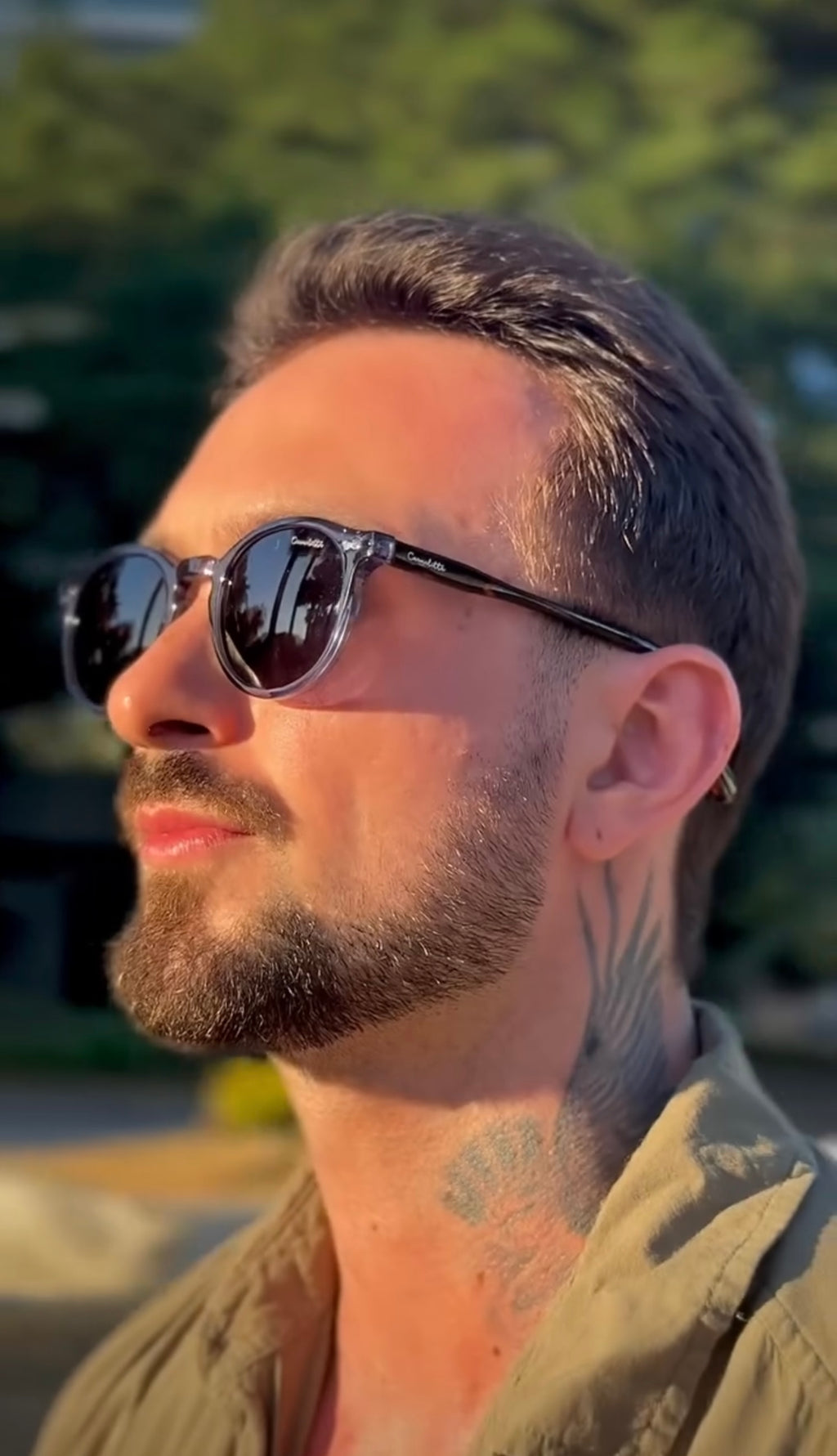Óculos com hastes tartaruga, frente em acetato azul translúcido com lente preta.