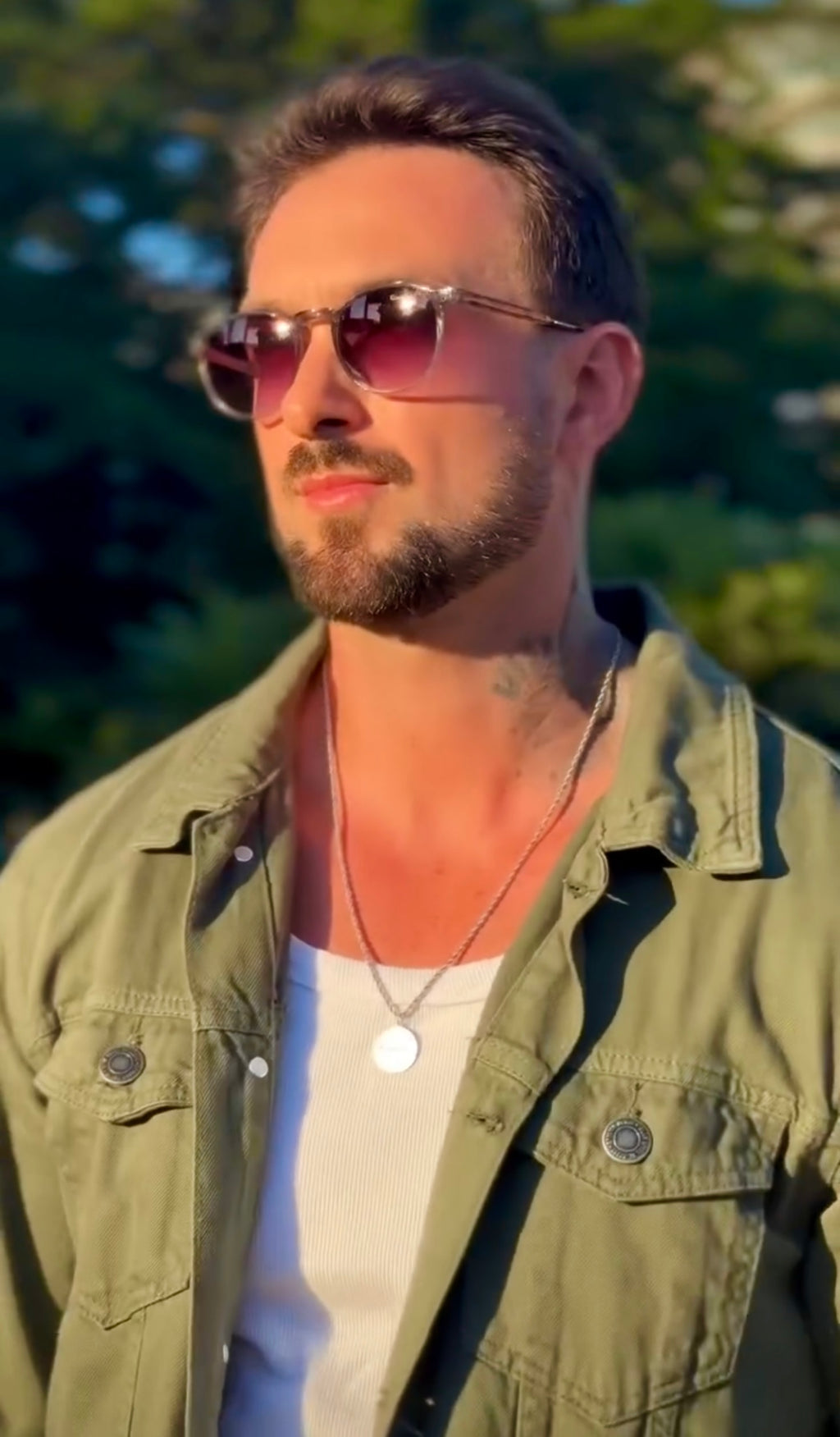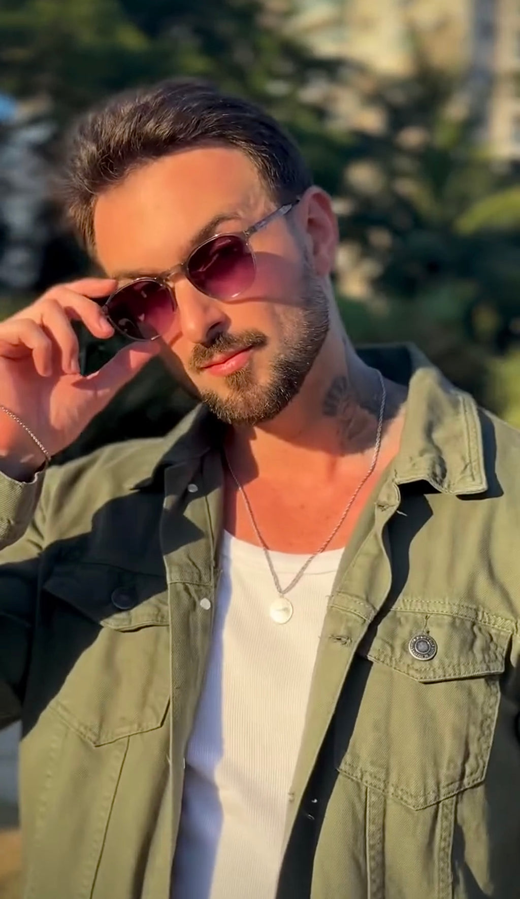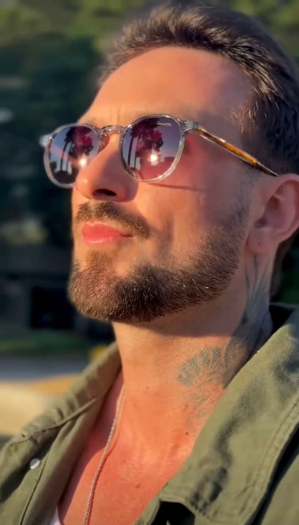 Óculos com hastes em acetato na cor tartaruga, frente na cor cinza translúcido e lente roxa degrade.