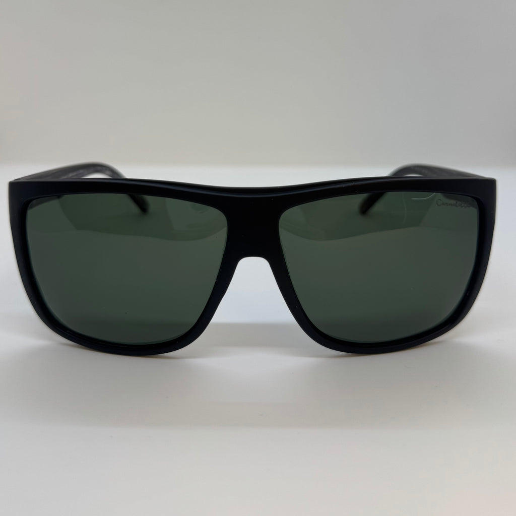 Óculos com haste em bambu escuro, frente em acetato preto com lente verde polarizada.