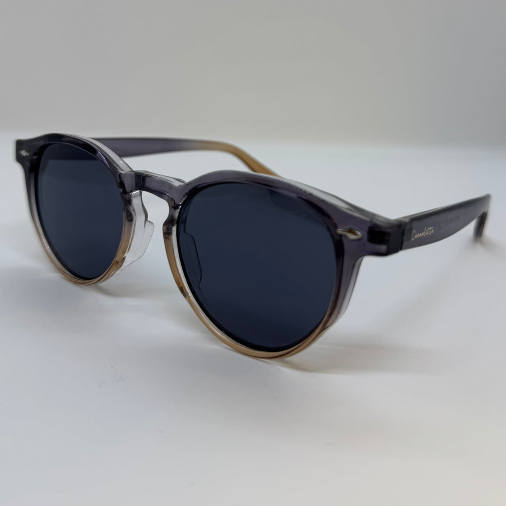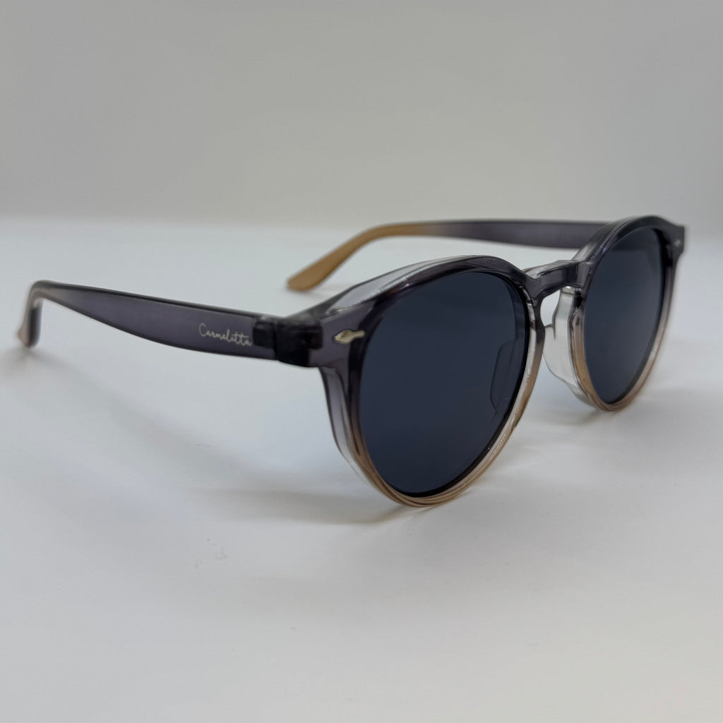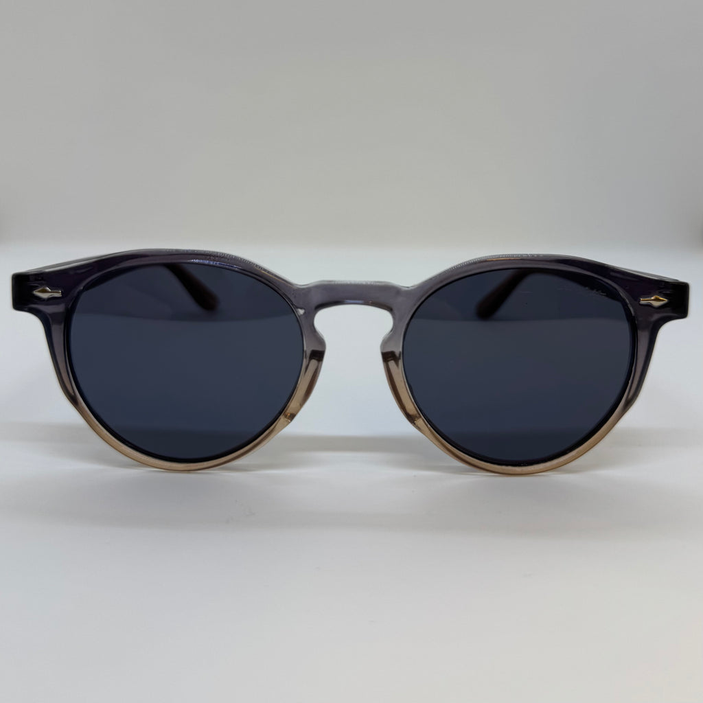 Óculos com hastes em acetato cinza degrade com lente preta.