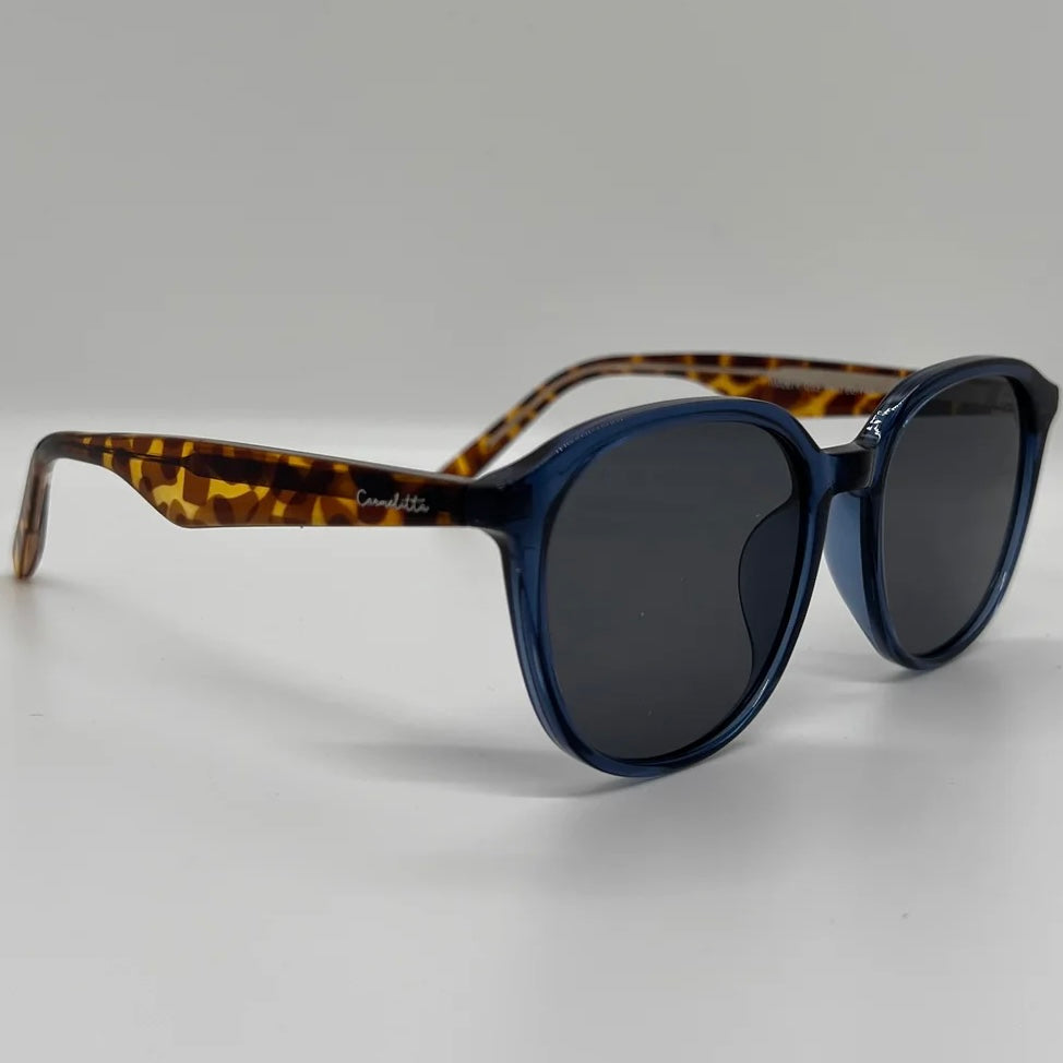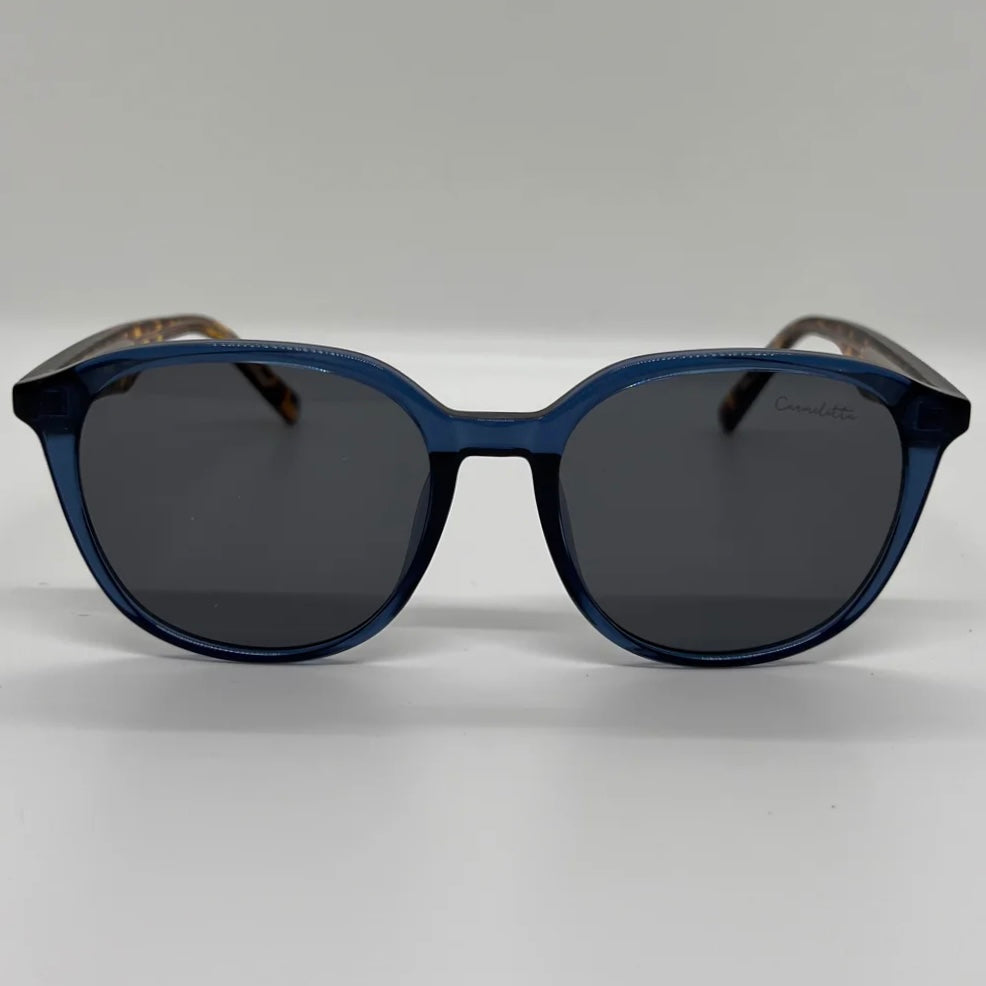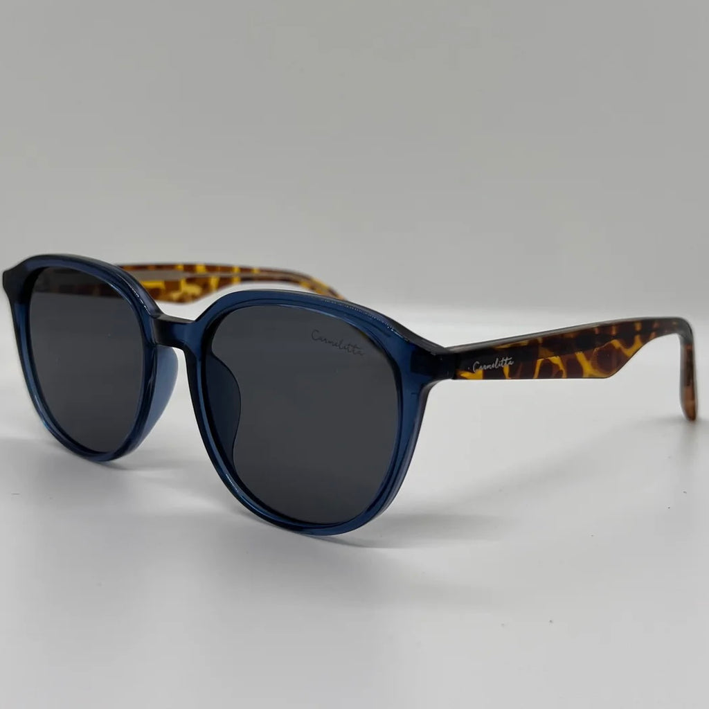 Óculos com hastes em acetato, frente azul e lentes acinzentadas