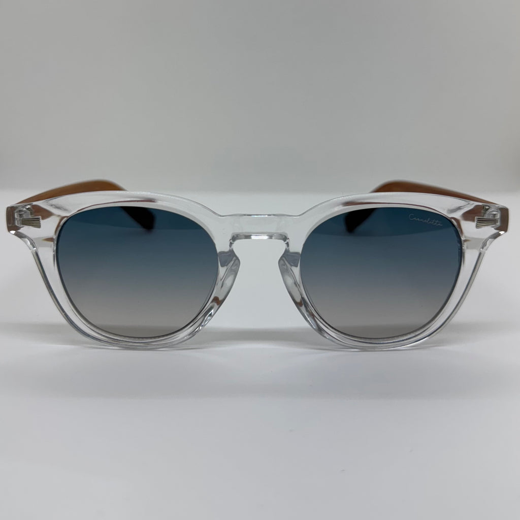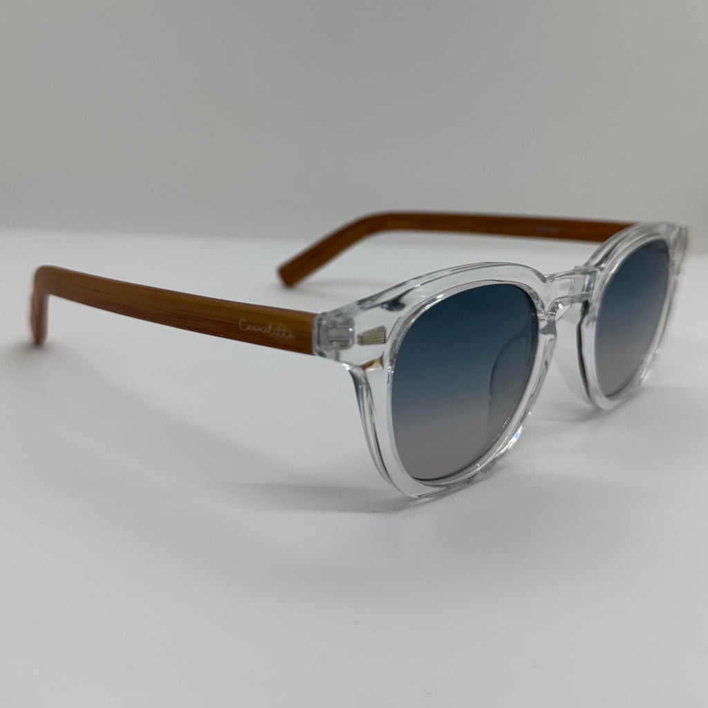 Armação com hastes em bambu, frente em acetato transparente e lente azul degrade.