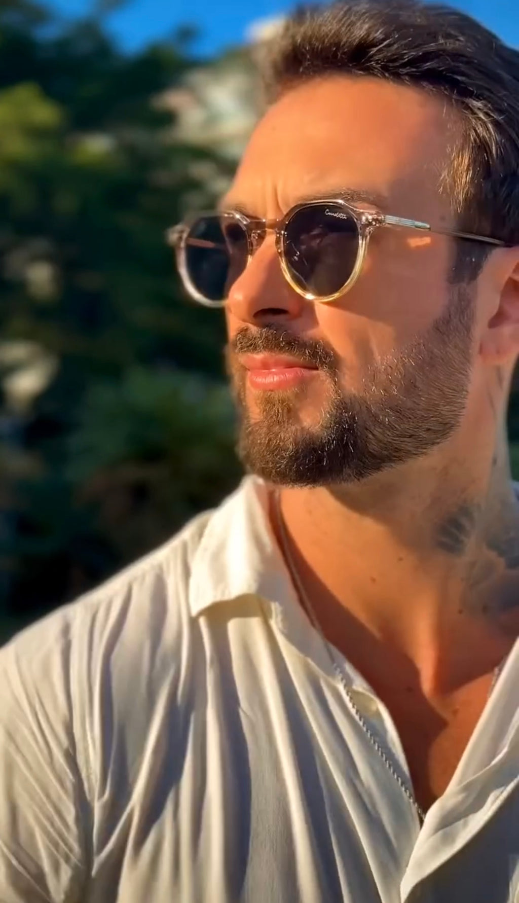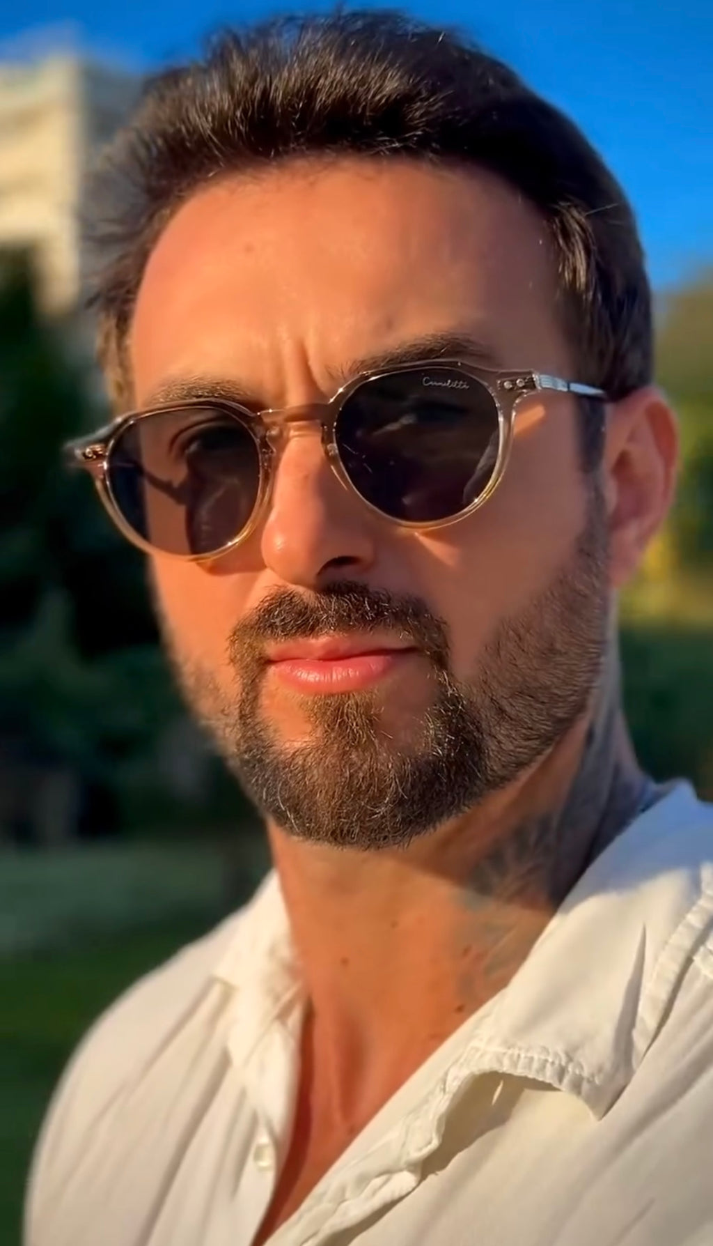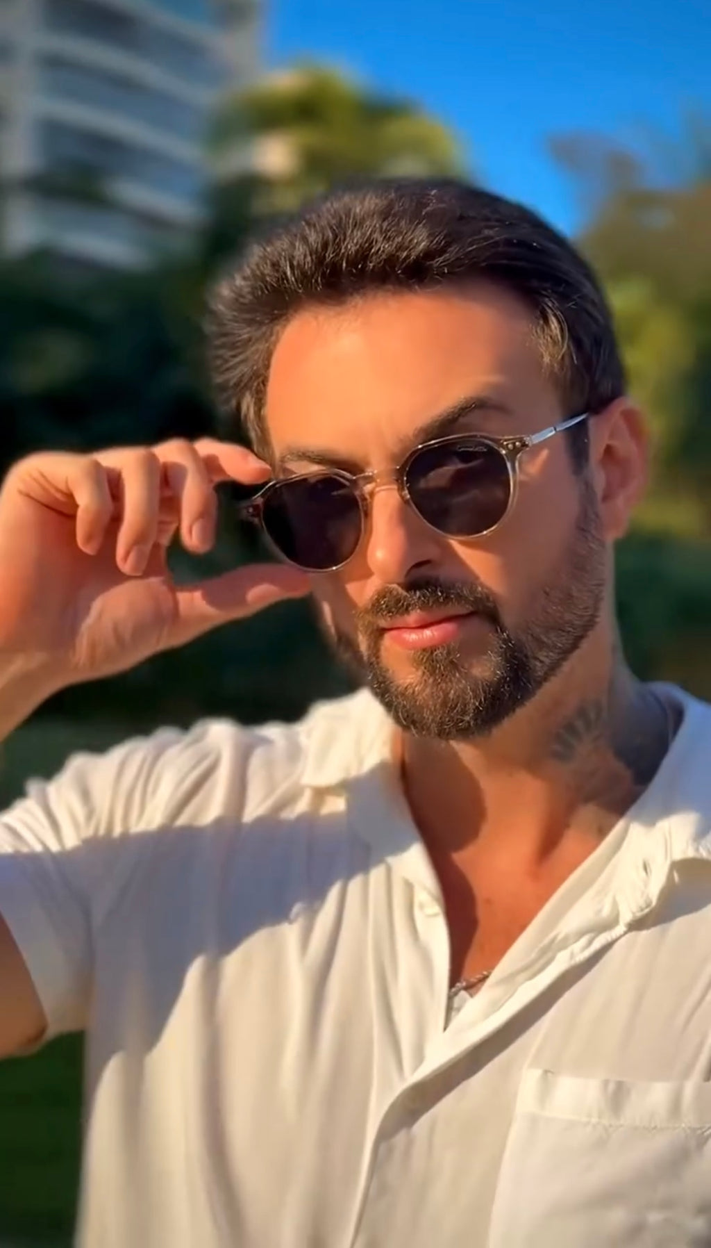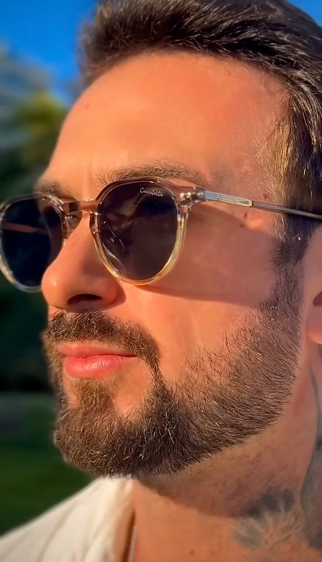 Óculos com hastes em acetato cinza degrade e lente fosca.