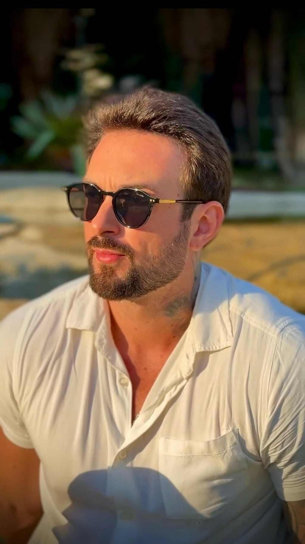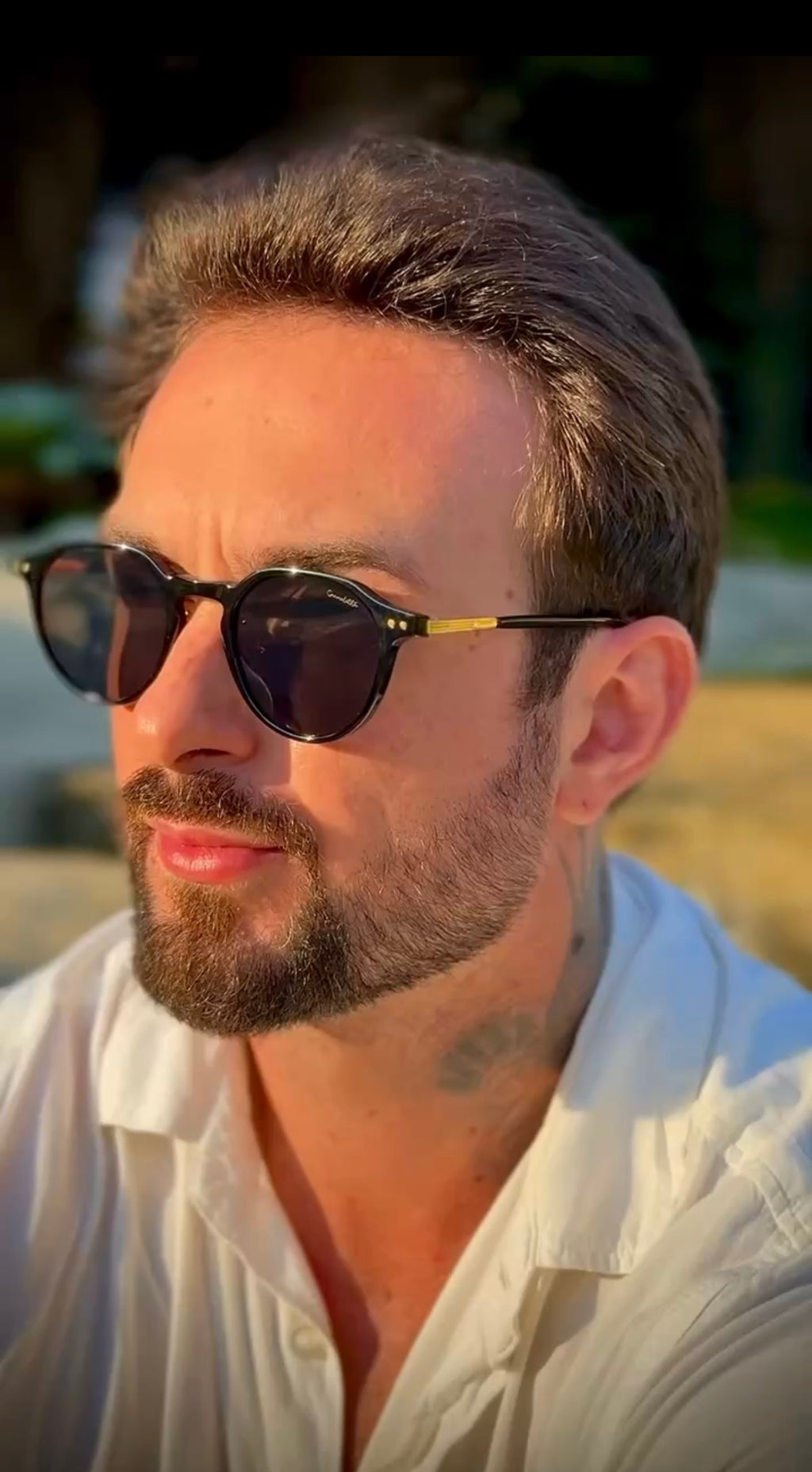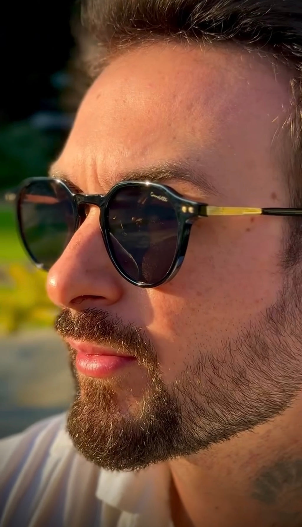 Óculos com hastes em acetato preto com detalhes dourados e lente preta.