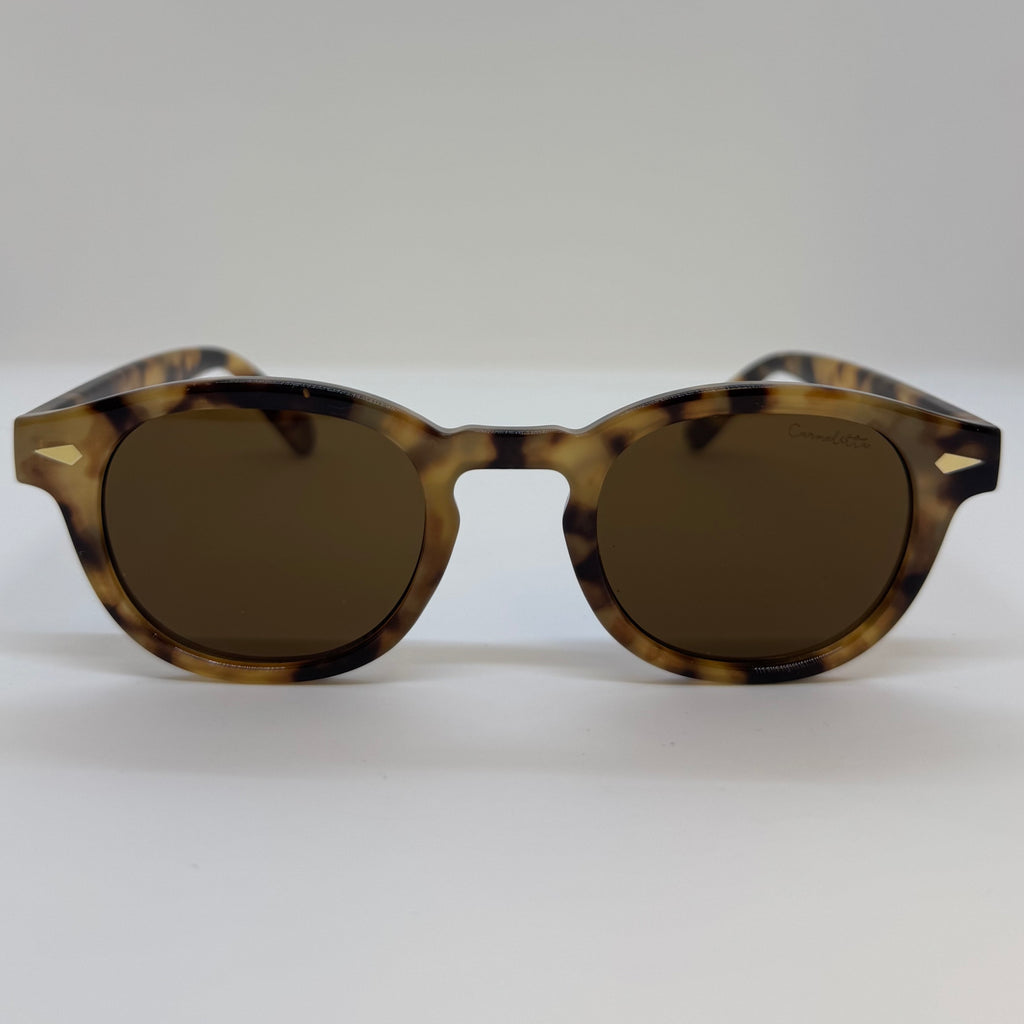 Ele combina tons de marrom claro, bege e preto mesclados no acetato, criando esse efeito marmorizado característico.