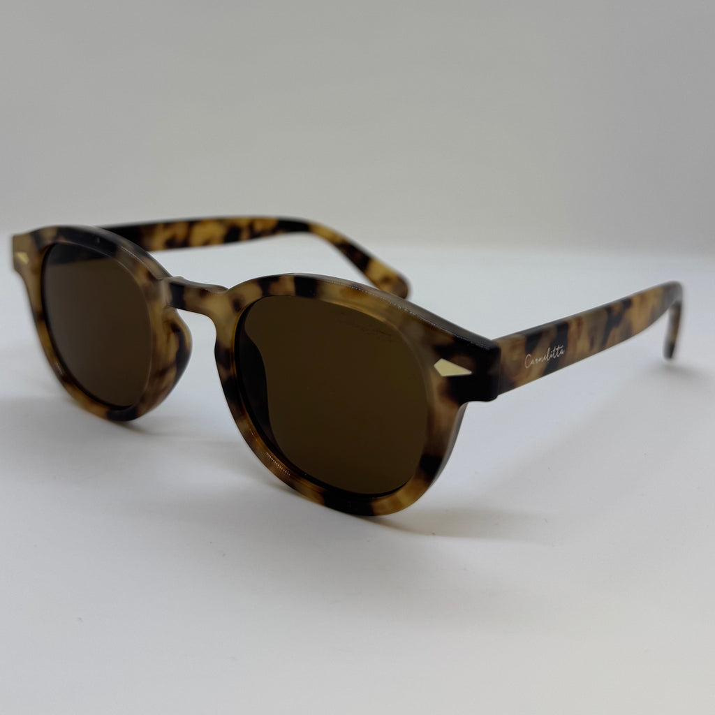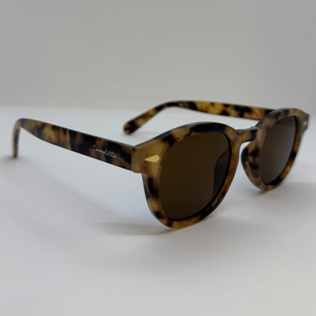 As lentes são marrons escuras, o que harmoniza perfeitamente com a armação quente e elegante.