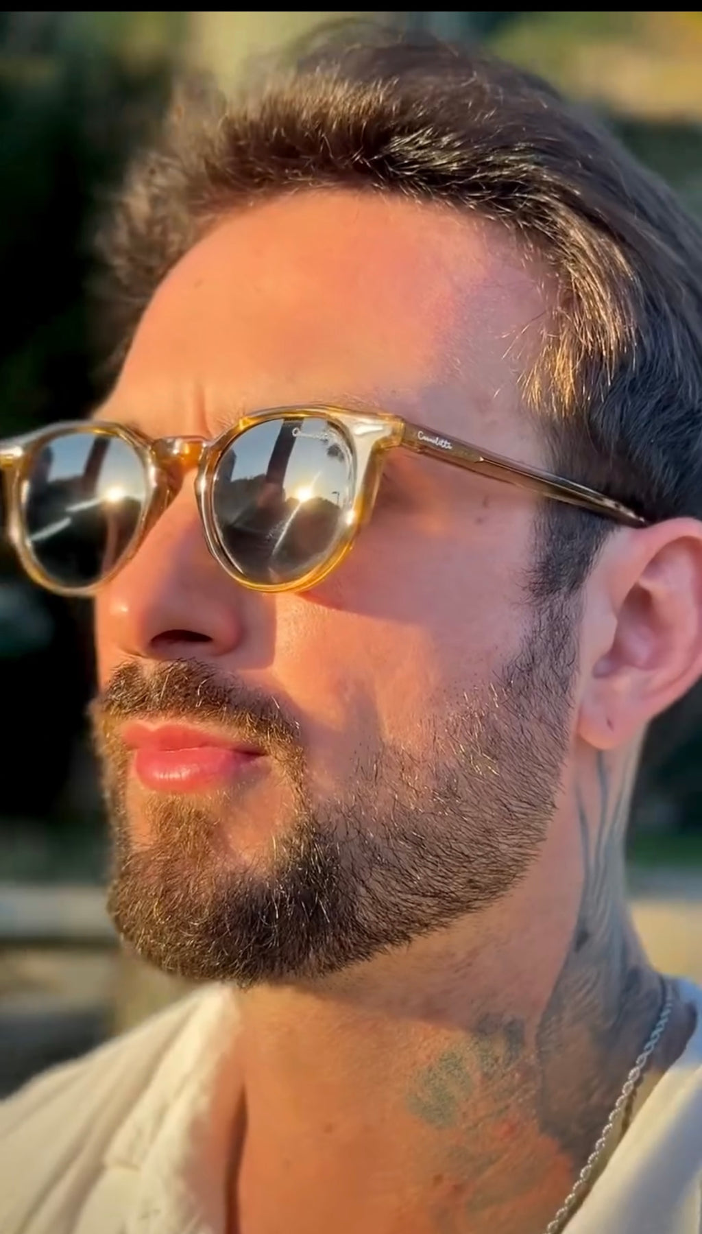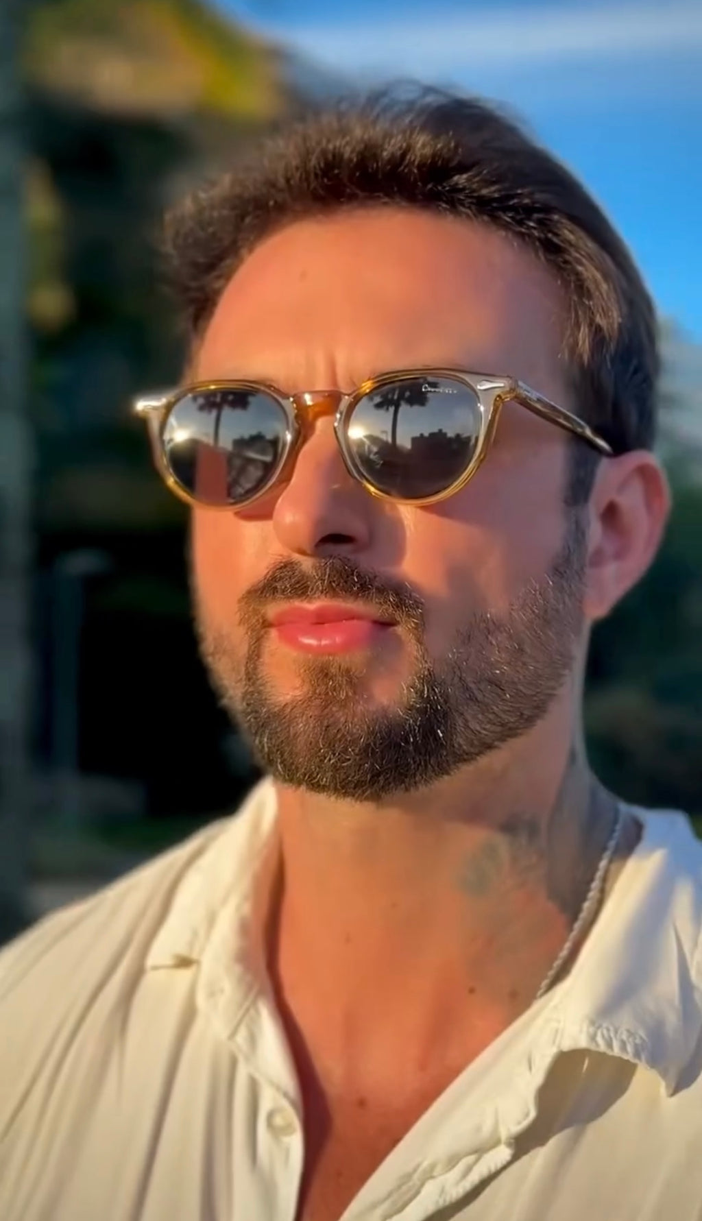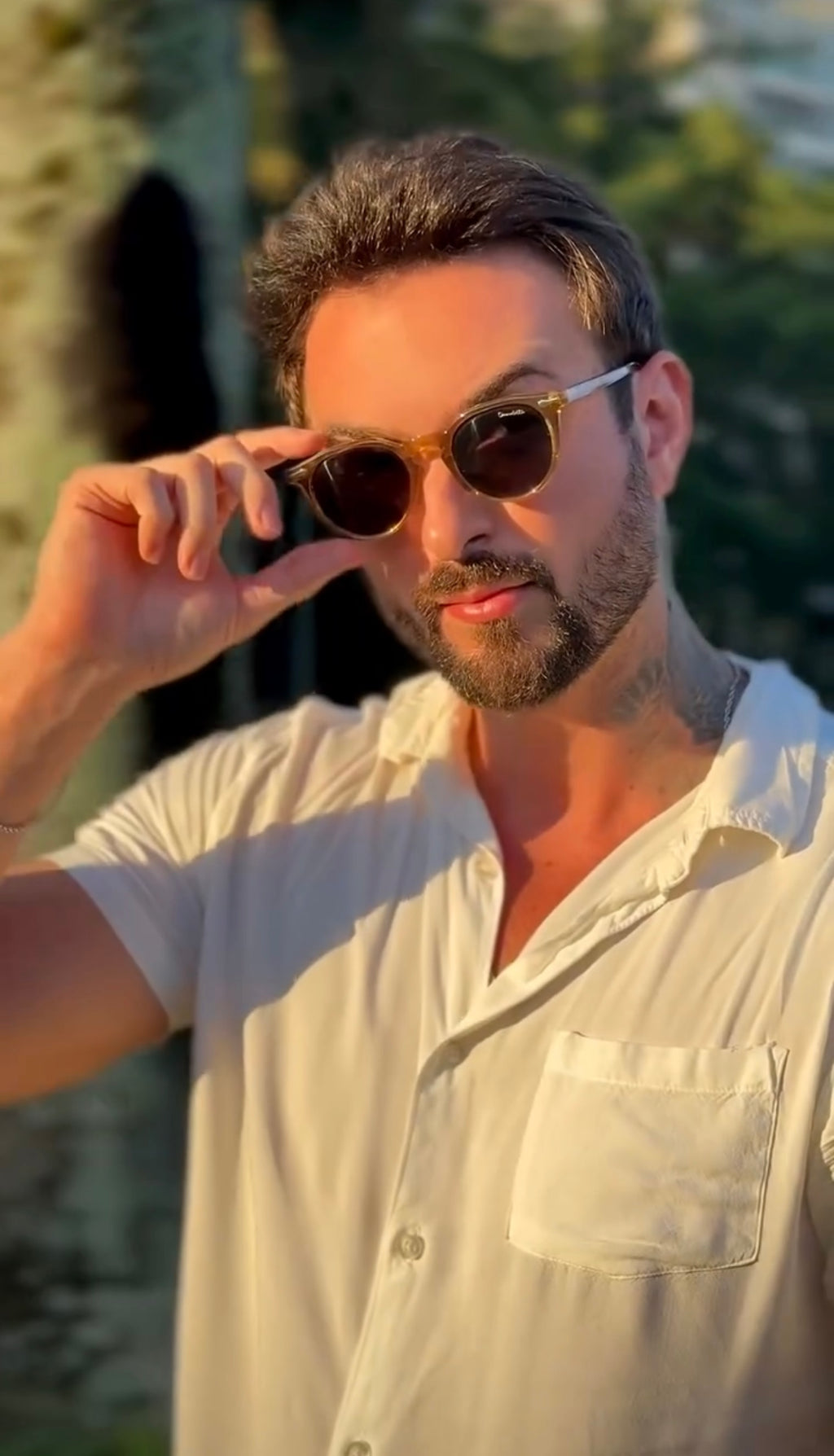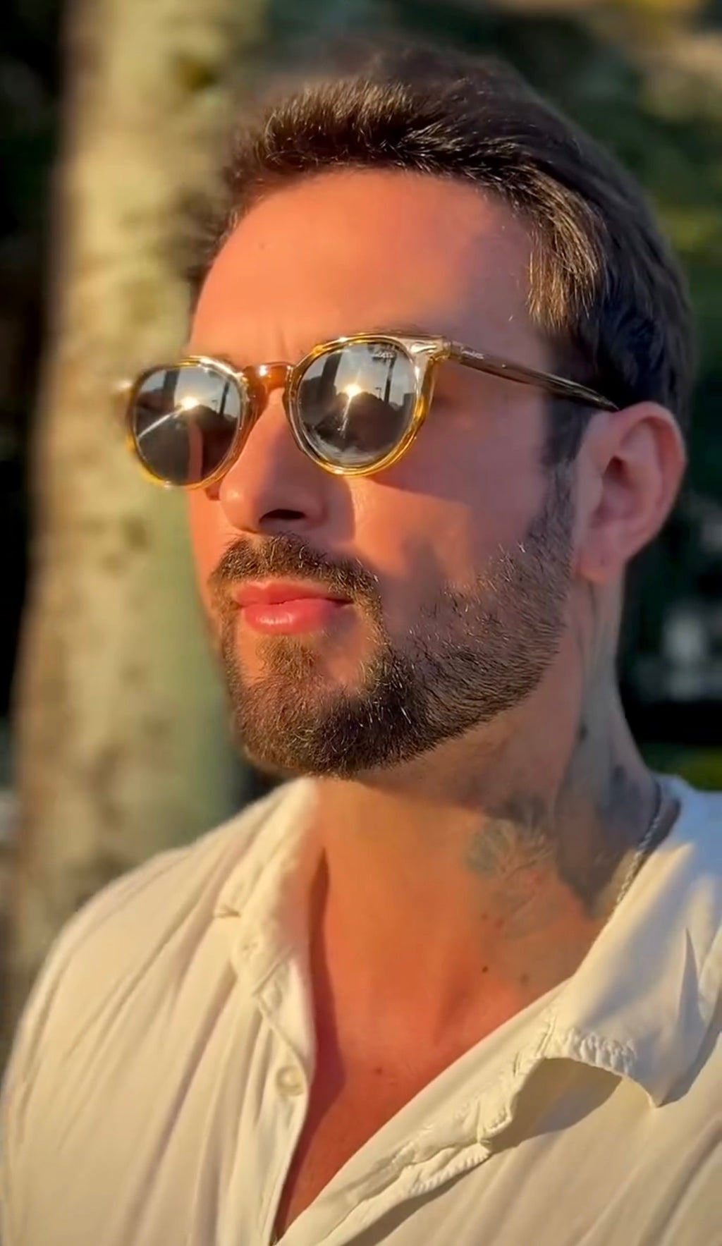 Óculos com hastes em acetato marrom translúcido com lente preta polarizada.