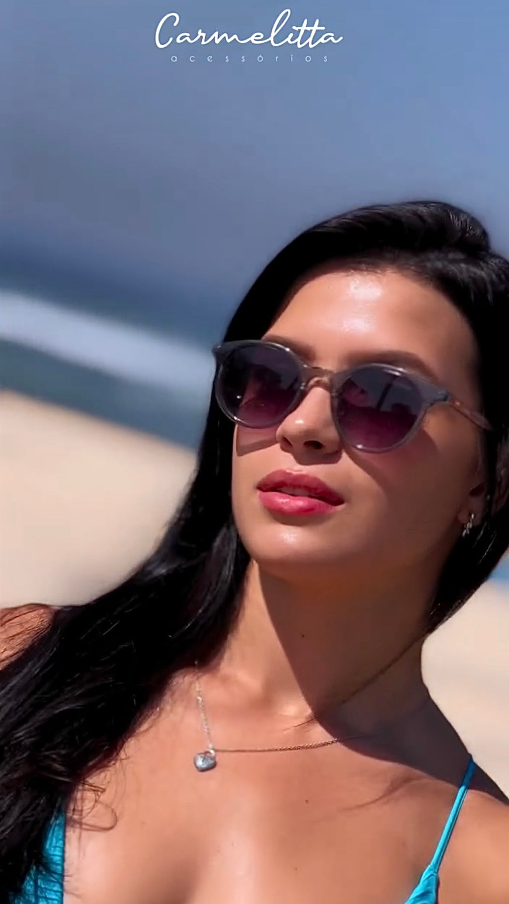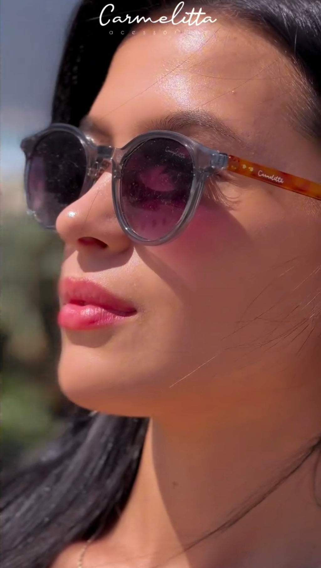 Óculos com hastes em acetato jaguar, com frente cinza e lente roxa degrade.