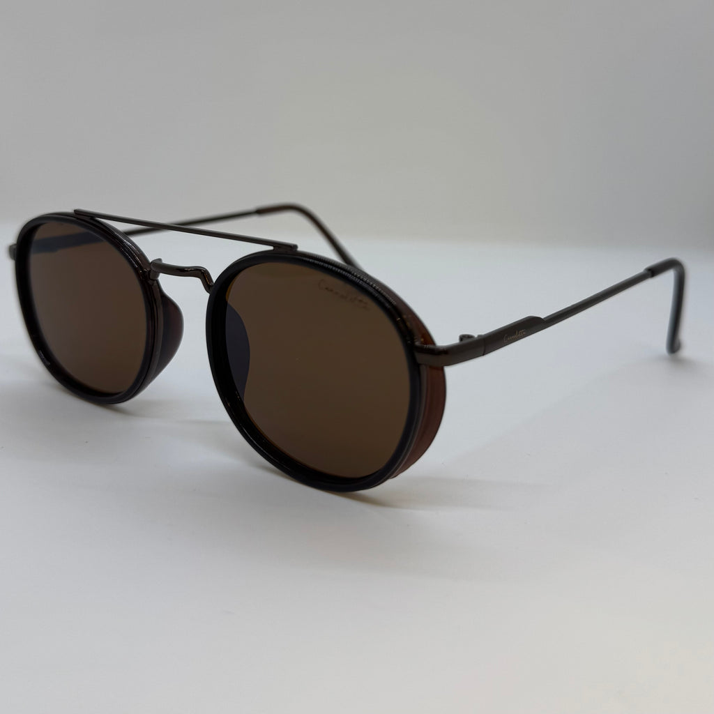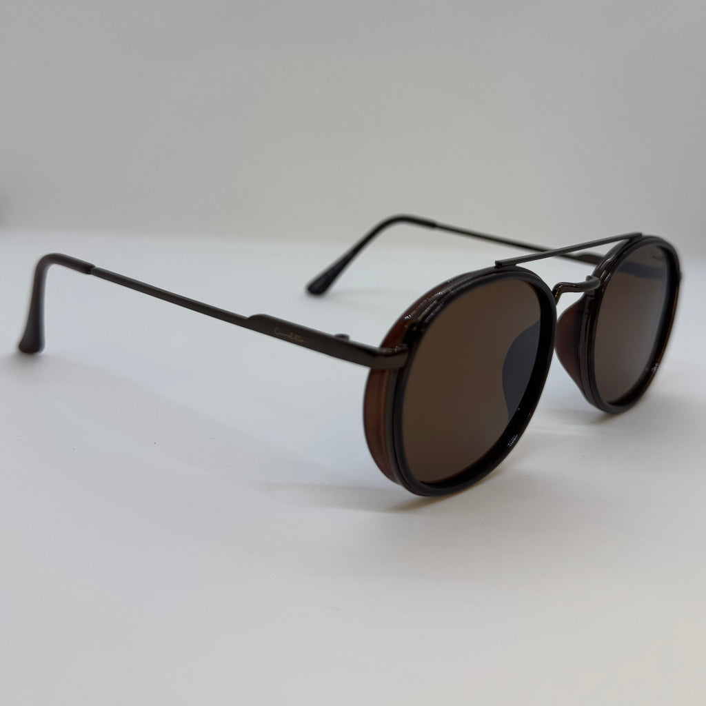 Óculos com metal bronze e acetato marrom com lente marrom.