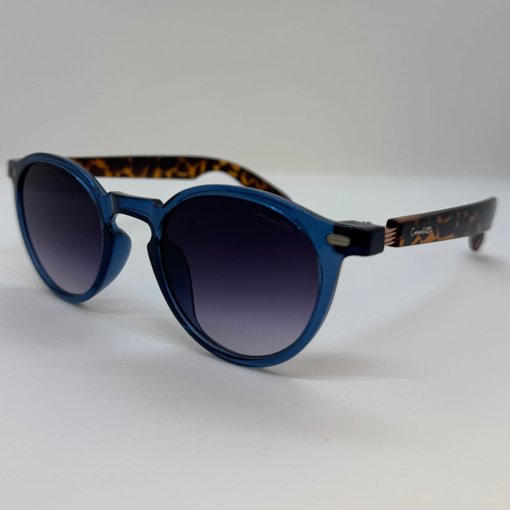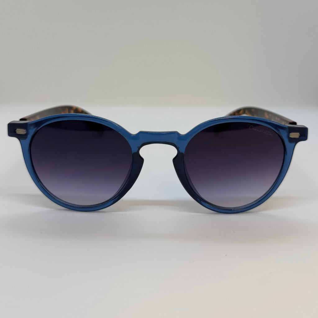 Óculos com hastes tartaruga, detalhes dourado, frente em acrílico azul e lente roxa degrade.