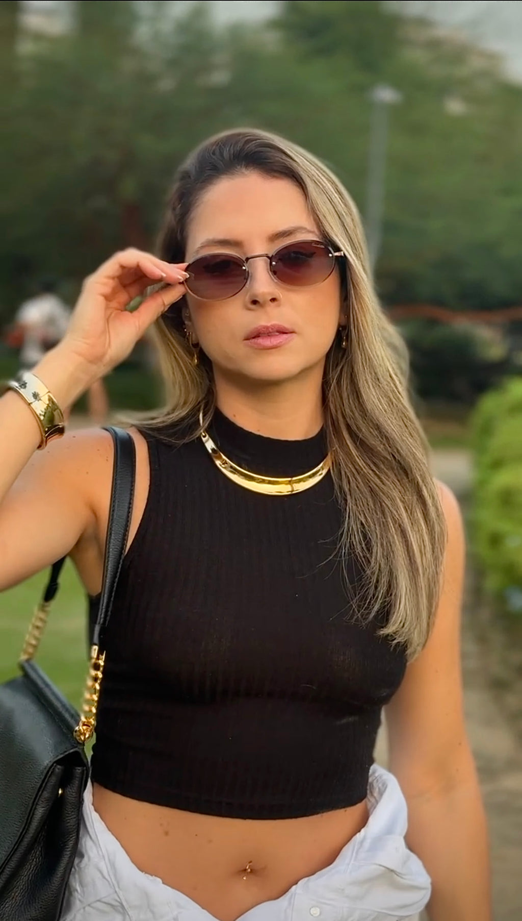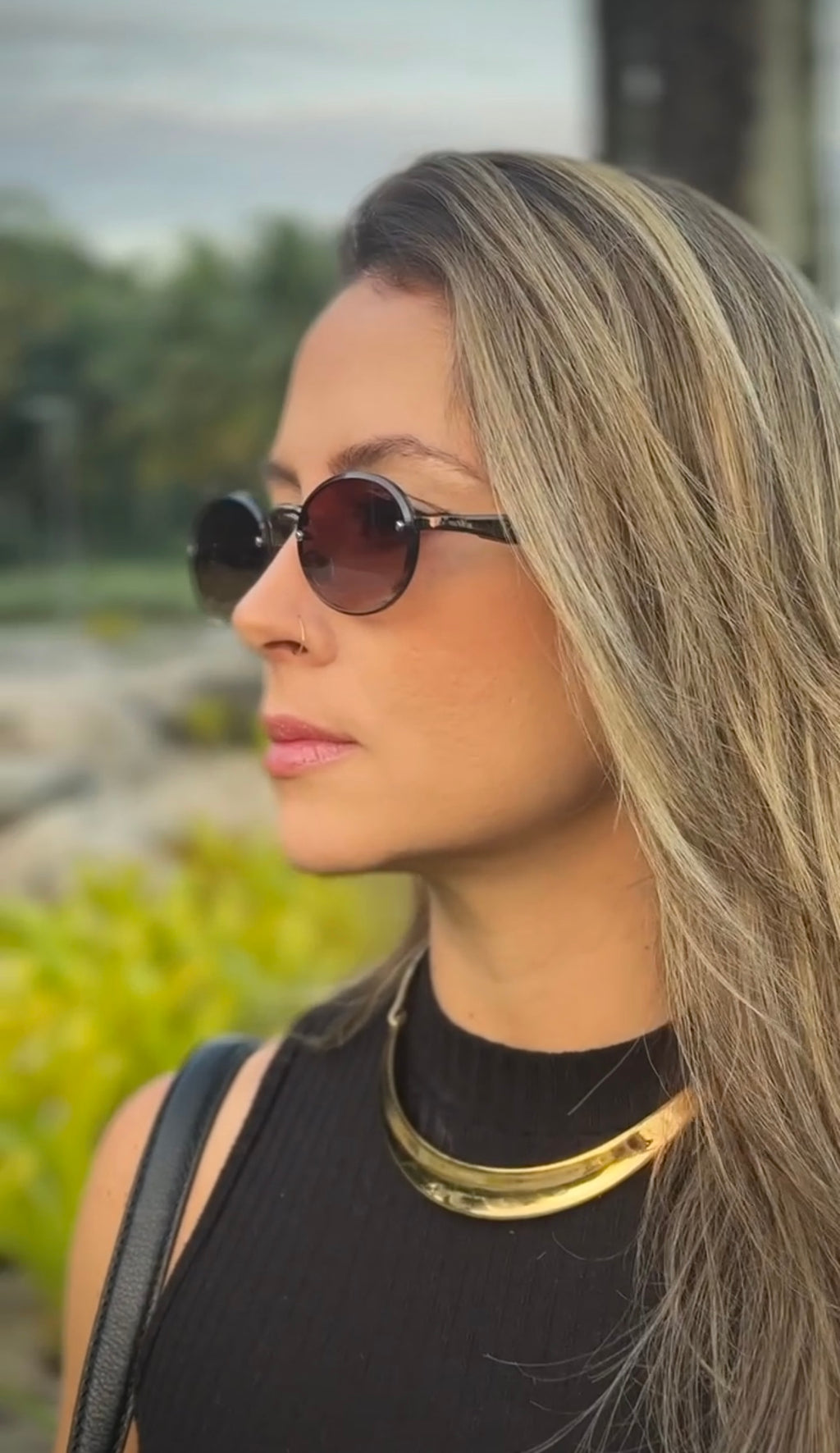 Óculos com hastes em acetato preto, frente em metal preto com lente roxa degrade.