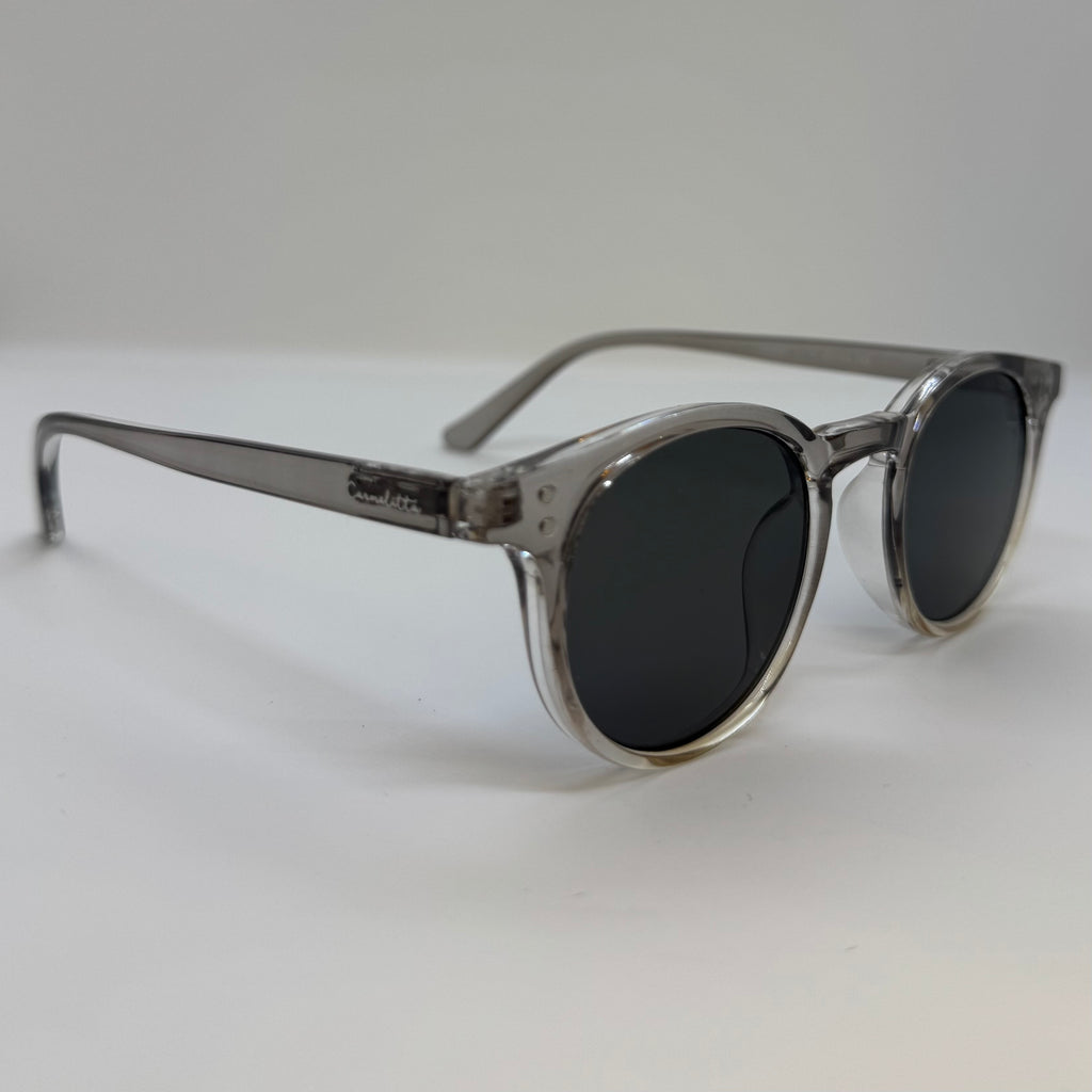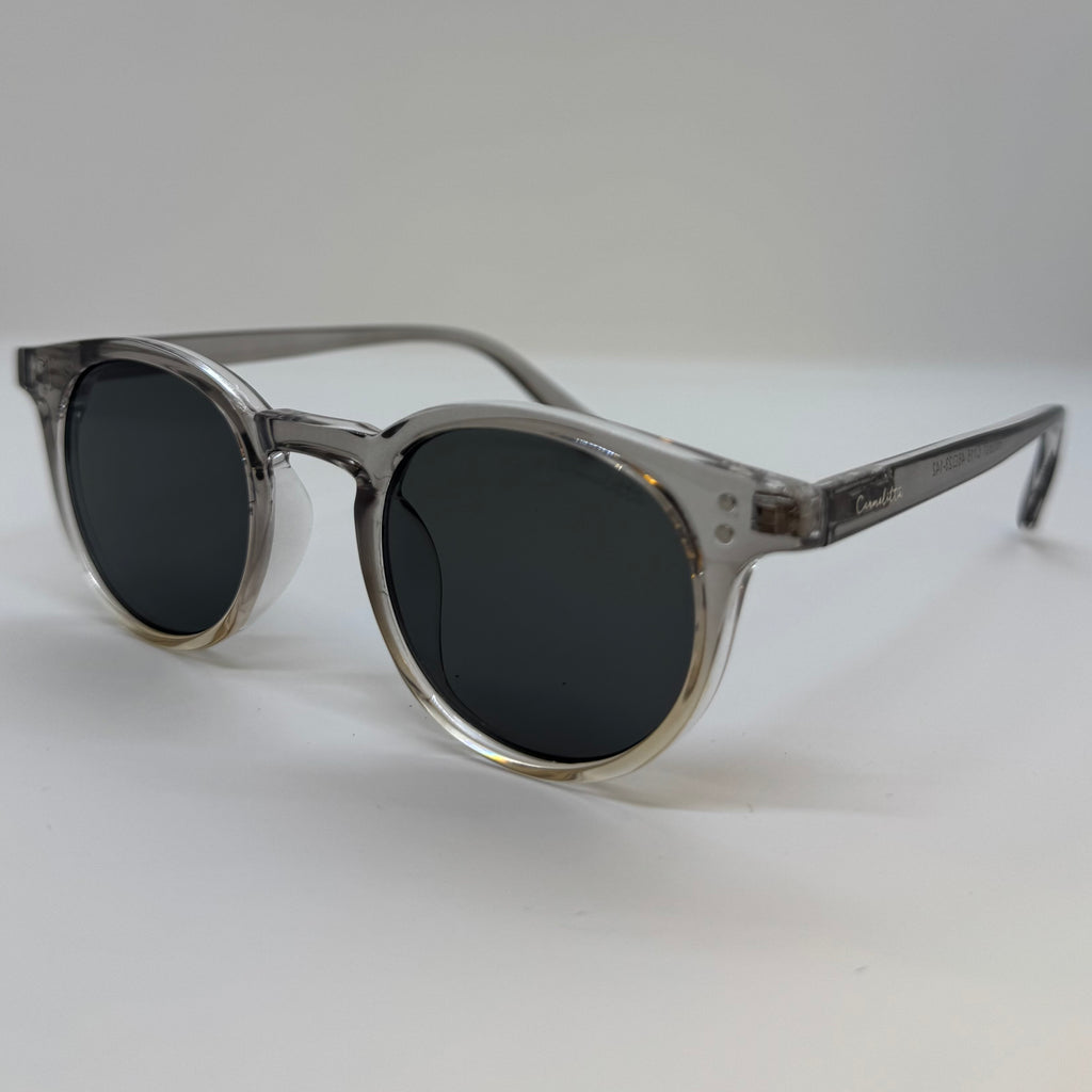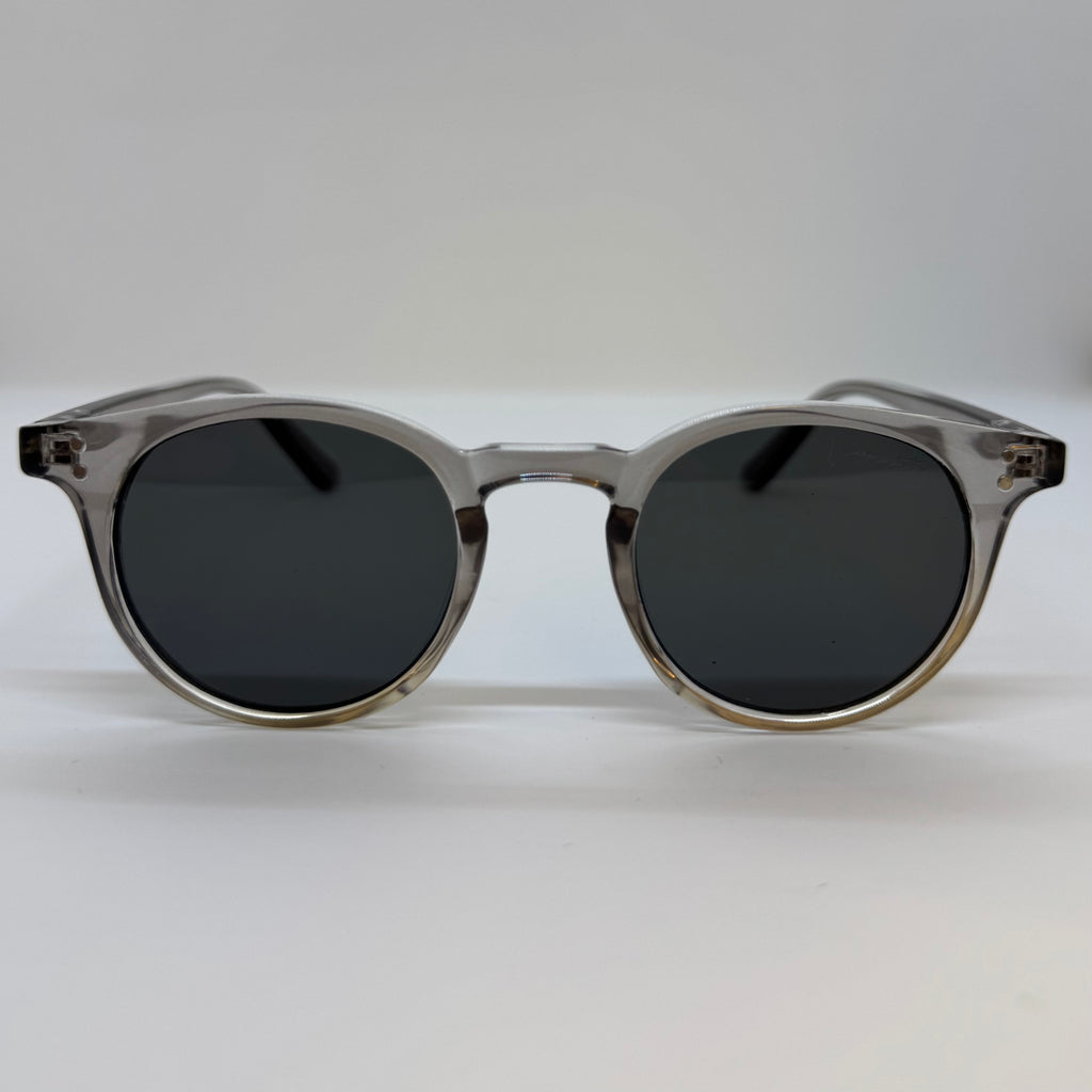 Óculos com hastes em acetato cinza degrade com lente preta.