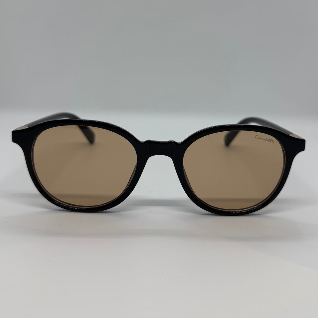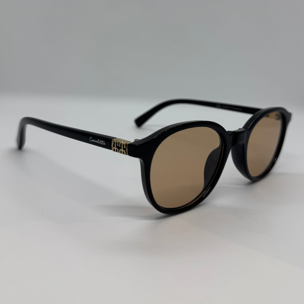 Óculos com hastes em acetato preto com lente marrom.