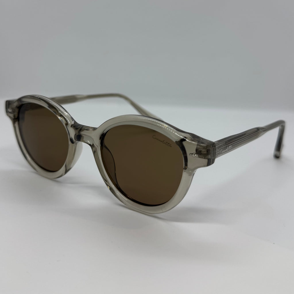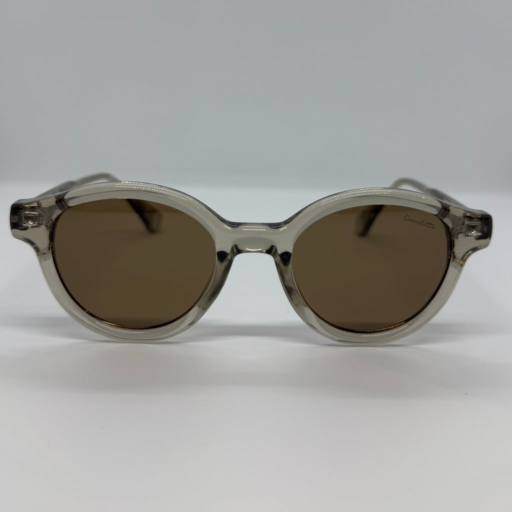 Óculos com hastes em acetato areia translúcido com lente marrom polarizada.
