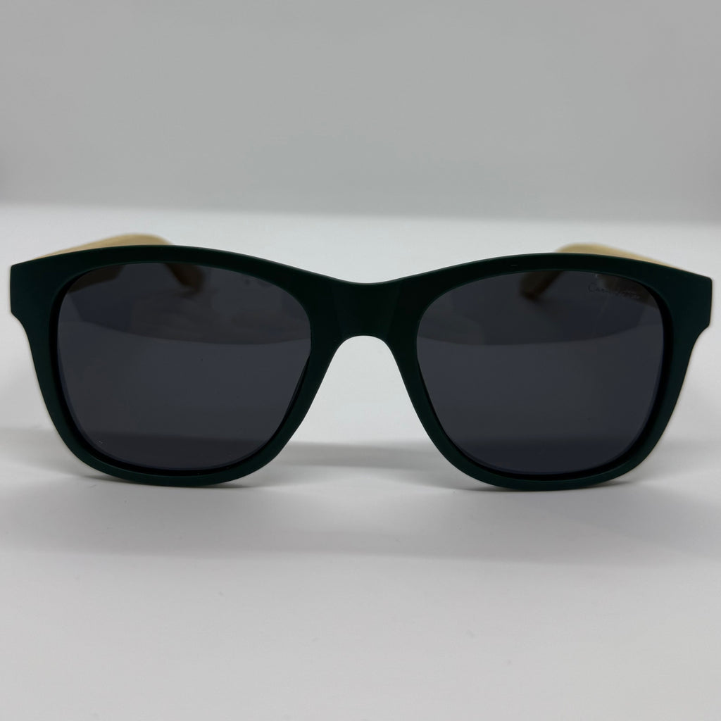 Óculos com armação frontal em acetato verde militar, leve e resistente, hastes de madeira natural polida com detalhe minimalista metalico prateado perto da dobradiça, lentes preta, e possui um design moderno com contraste em preto e madeira natural.