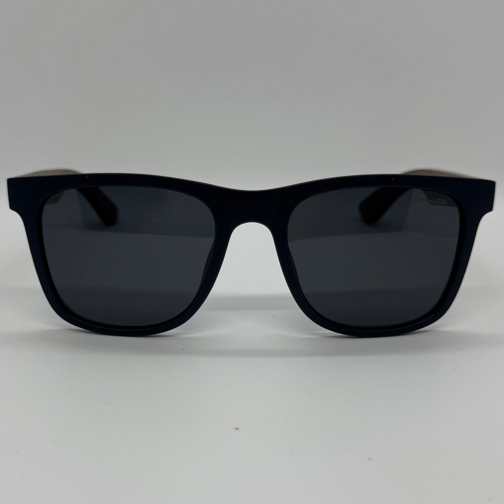 Óculos com hastes em bambu escuro, frente em acetato preto e lente preta polarizada.