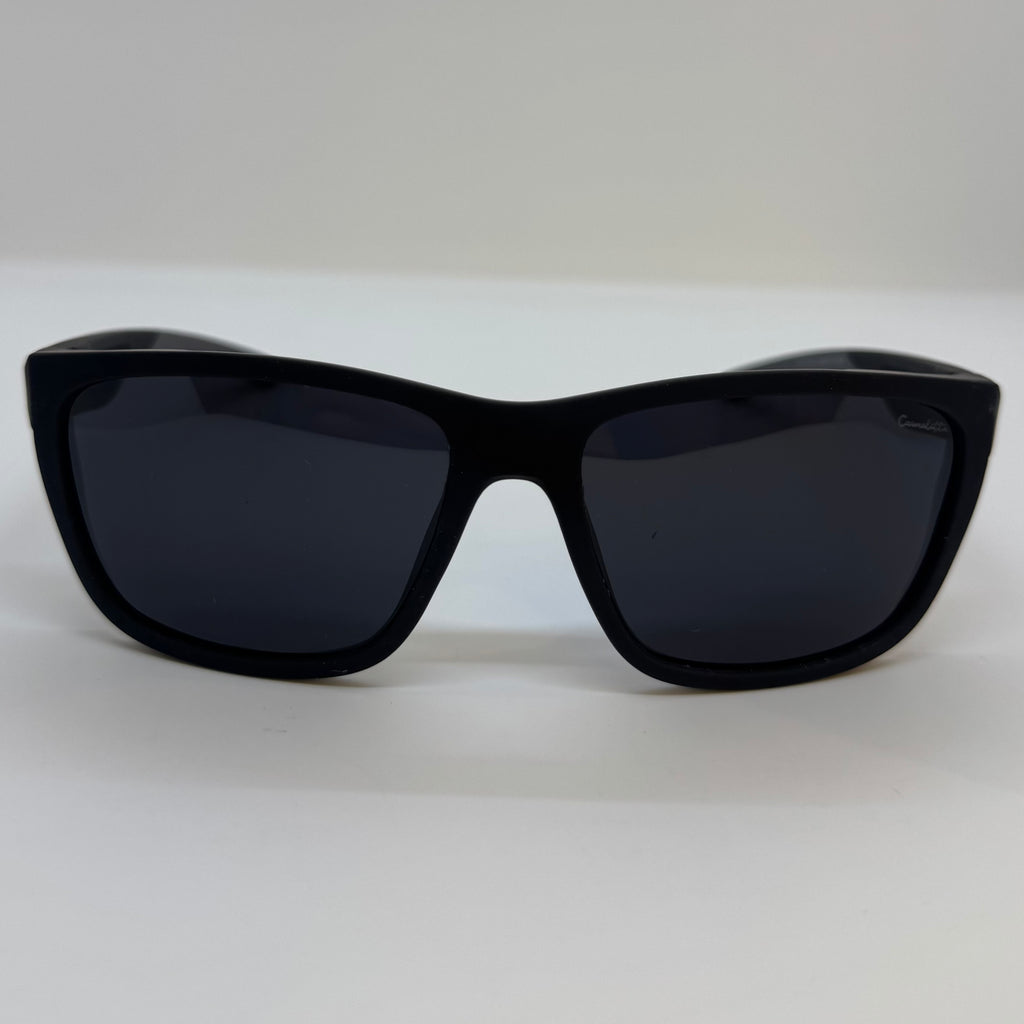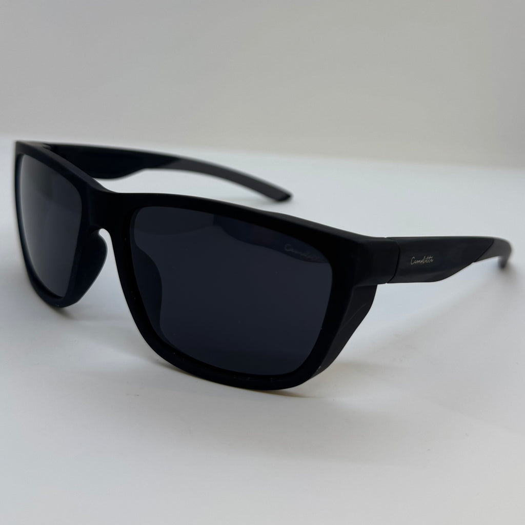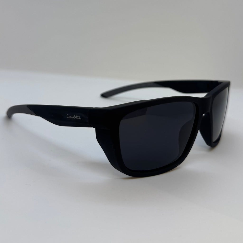 Óculos com hastes em acetato preto semi fechada com lente preta.