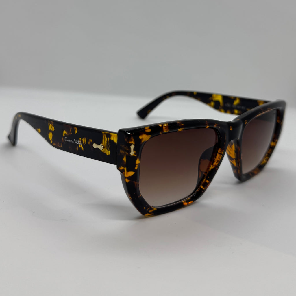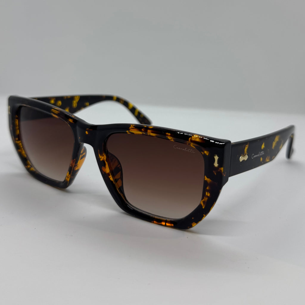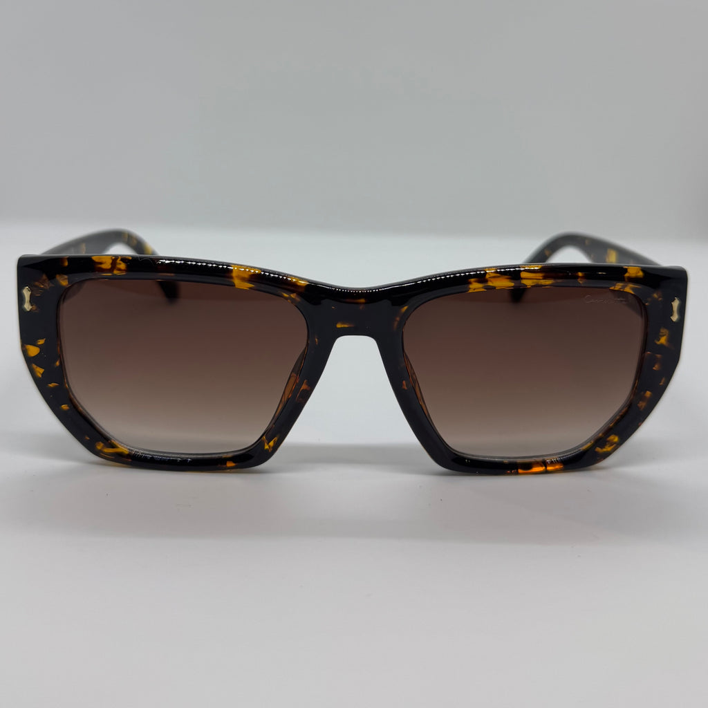 Óculos com hastes tartaruga translúcido com lente marrom degrade.