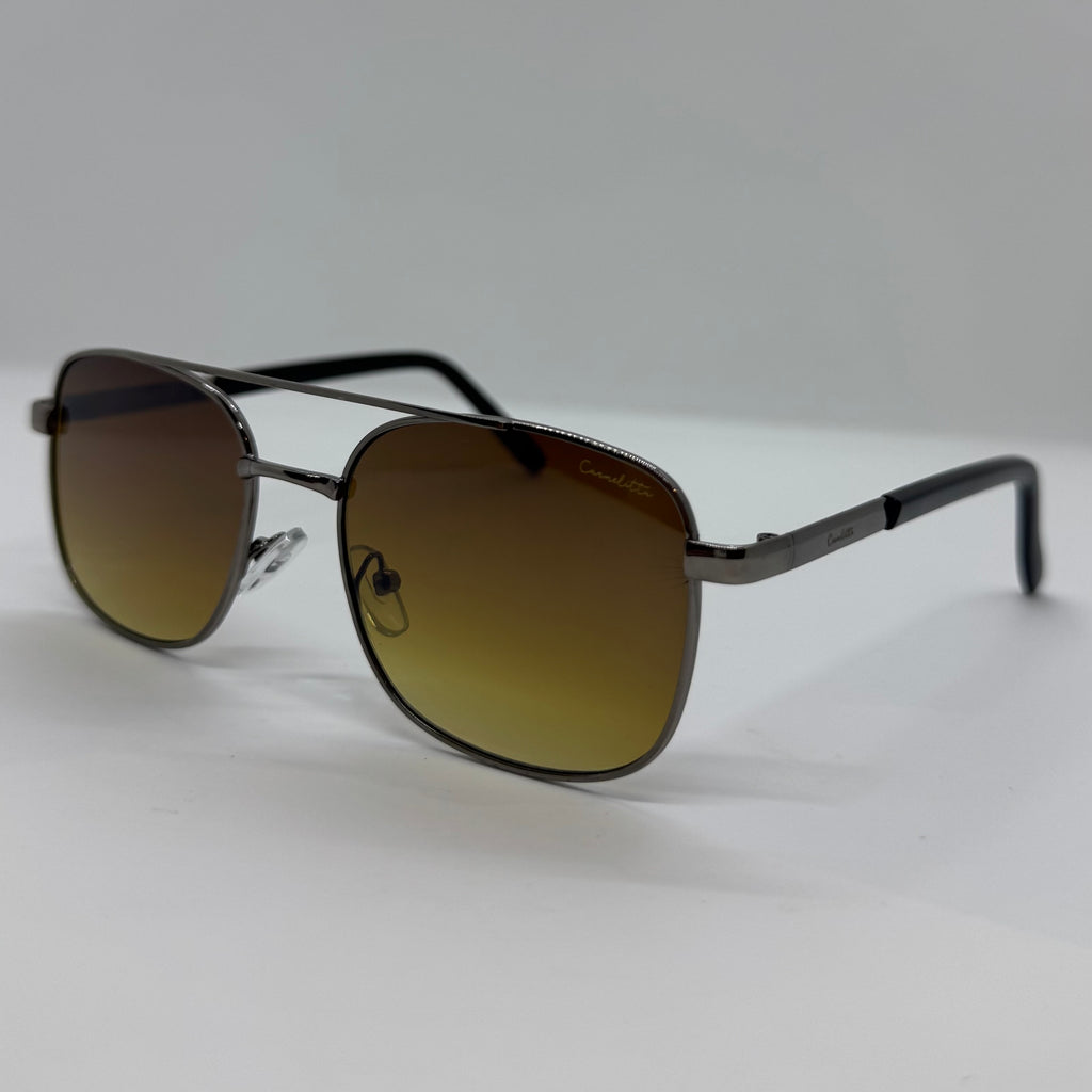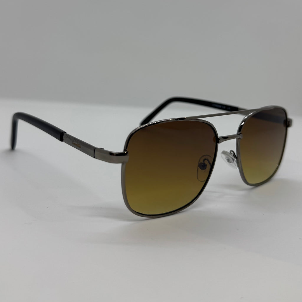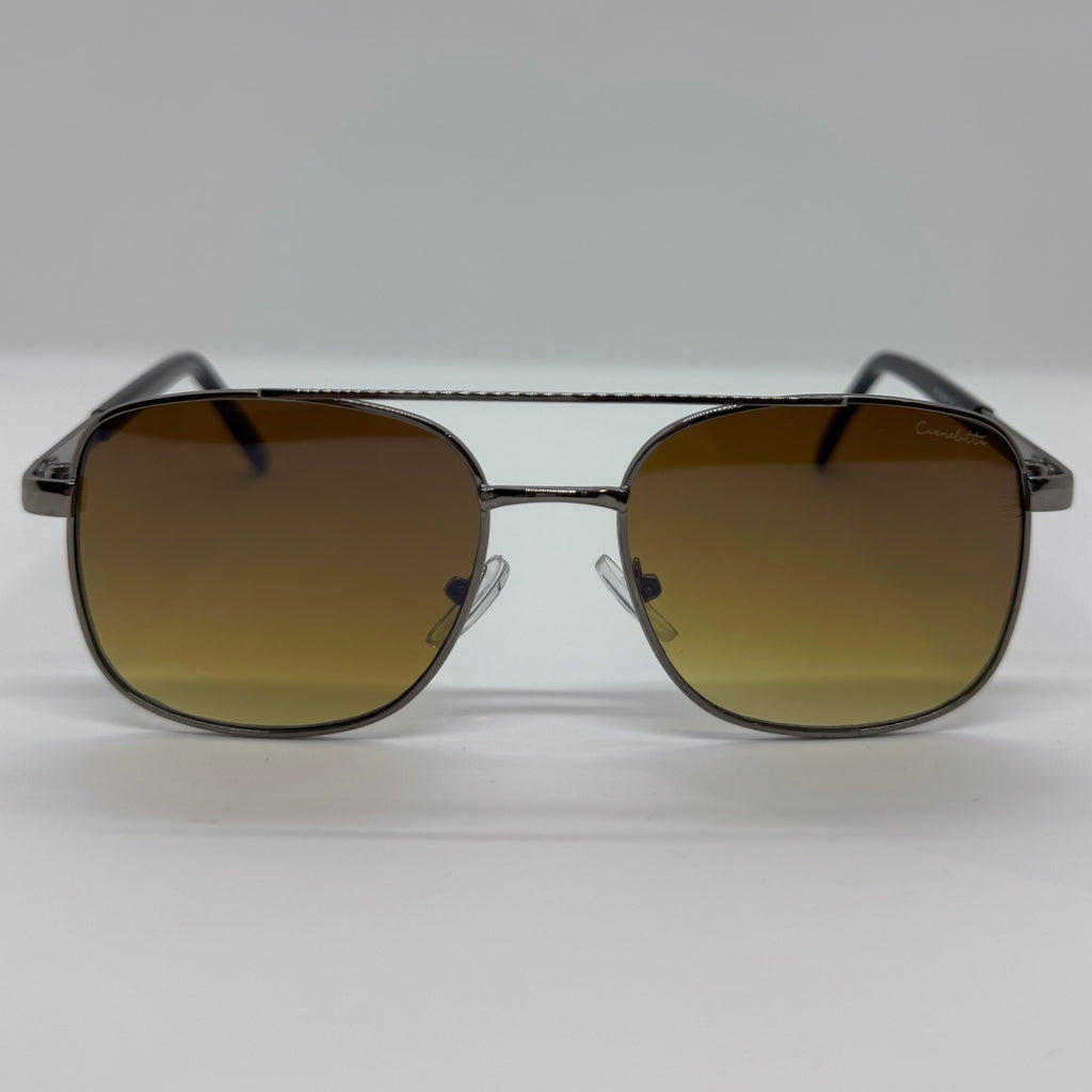 Óculos com hastes em metal bronze com lente marrom degrade.