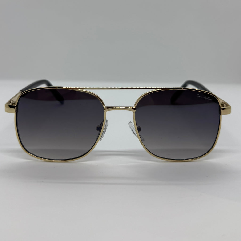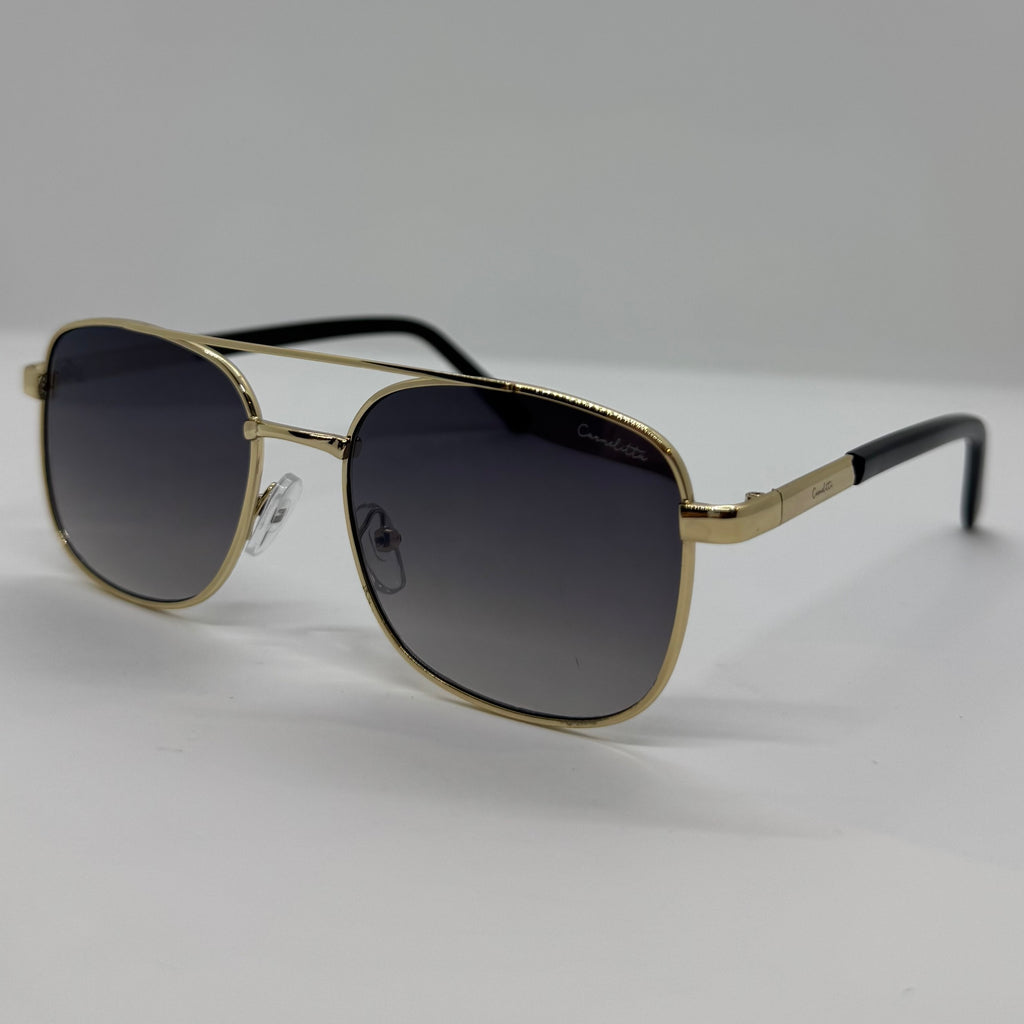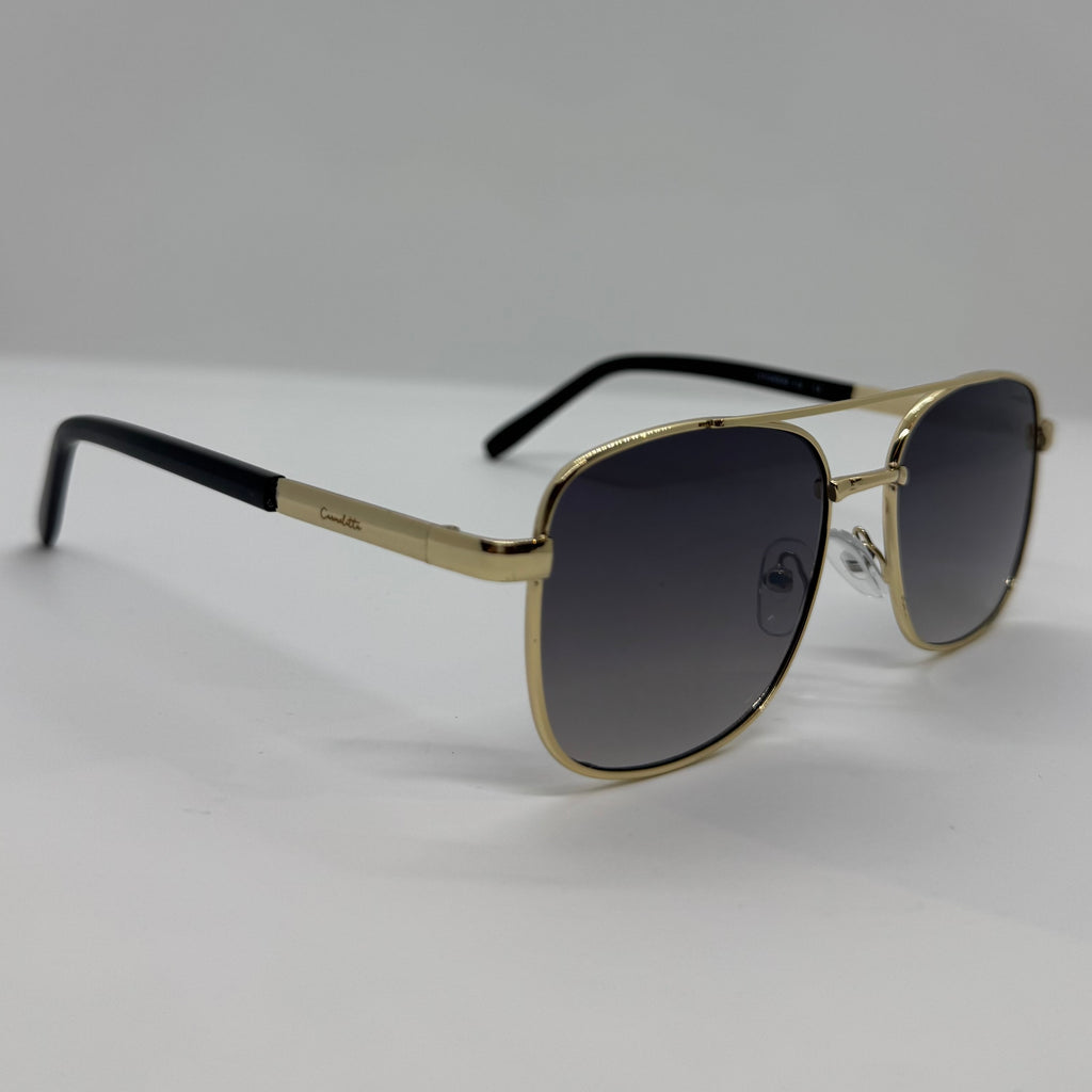 Óculos com hastes em metal dourado com lente roxa degrade.