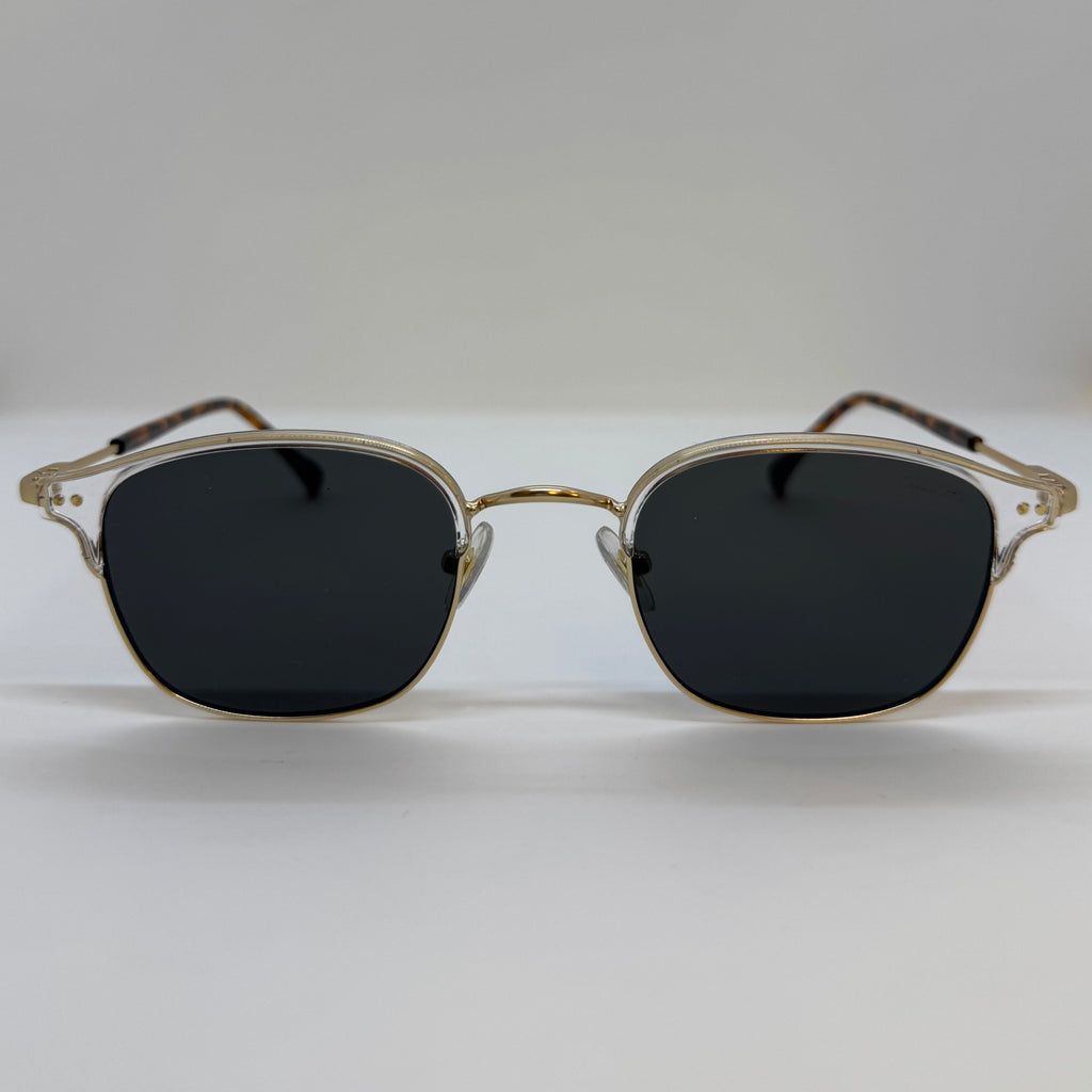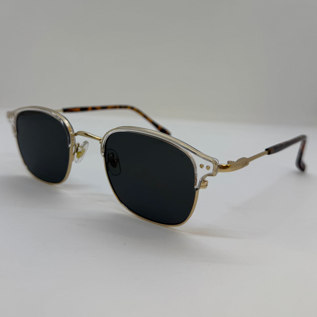 Óculos com hastes em acetato tartaruga e frente transparente com lente preta.