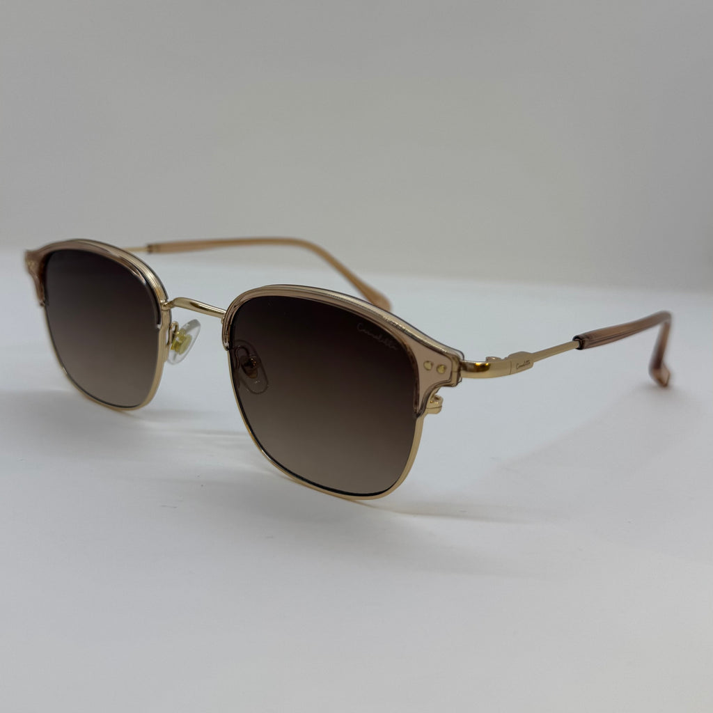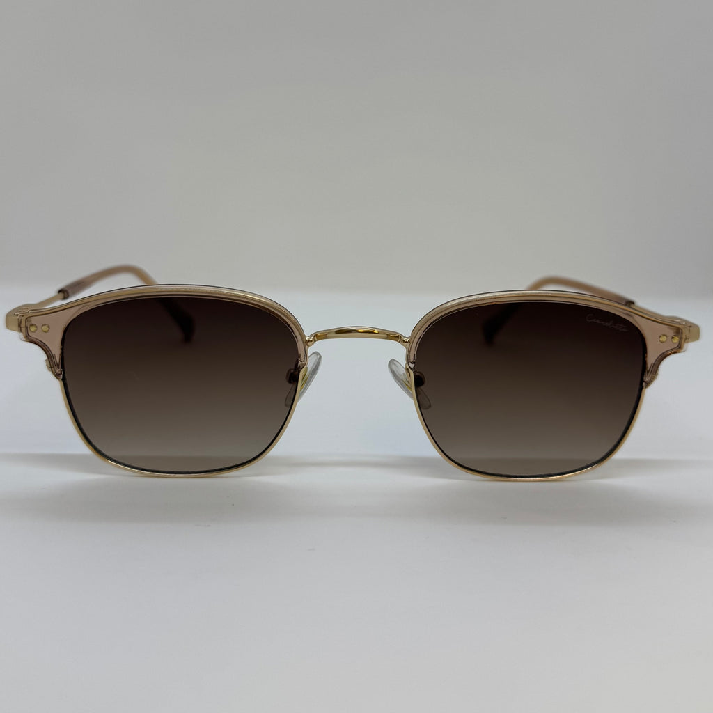 Óculos com hastes em metal com frente em acetato rose translúcido e lente marrom degrade.