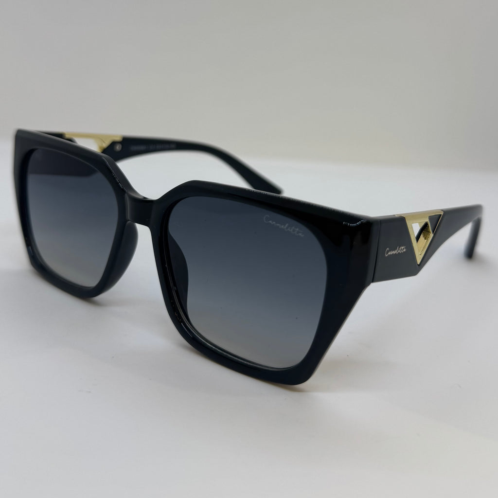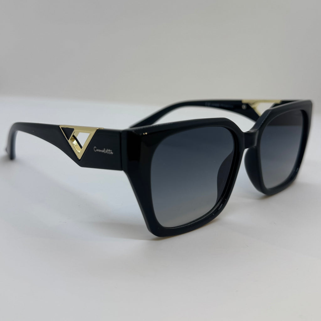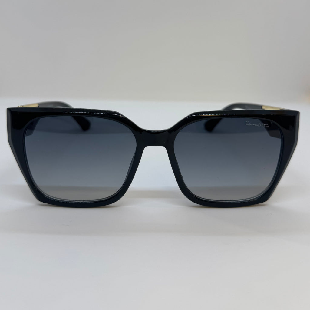 Óculos com hastes em acetato preto com detalhes dourado e lente roca degrade.