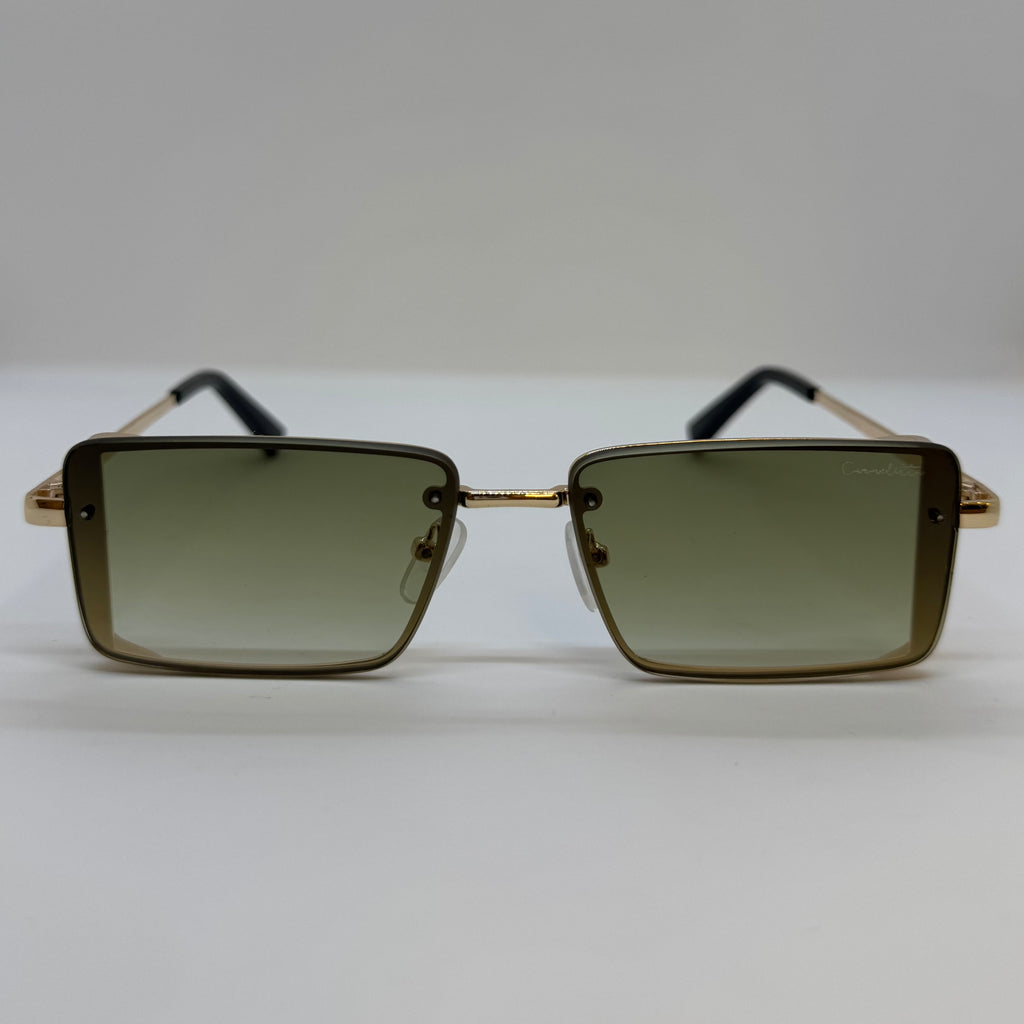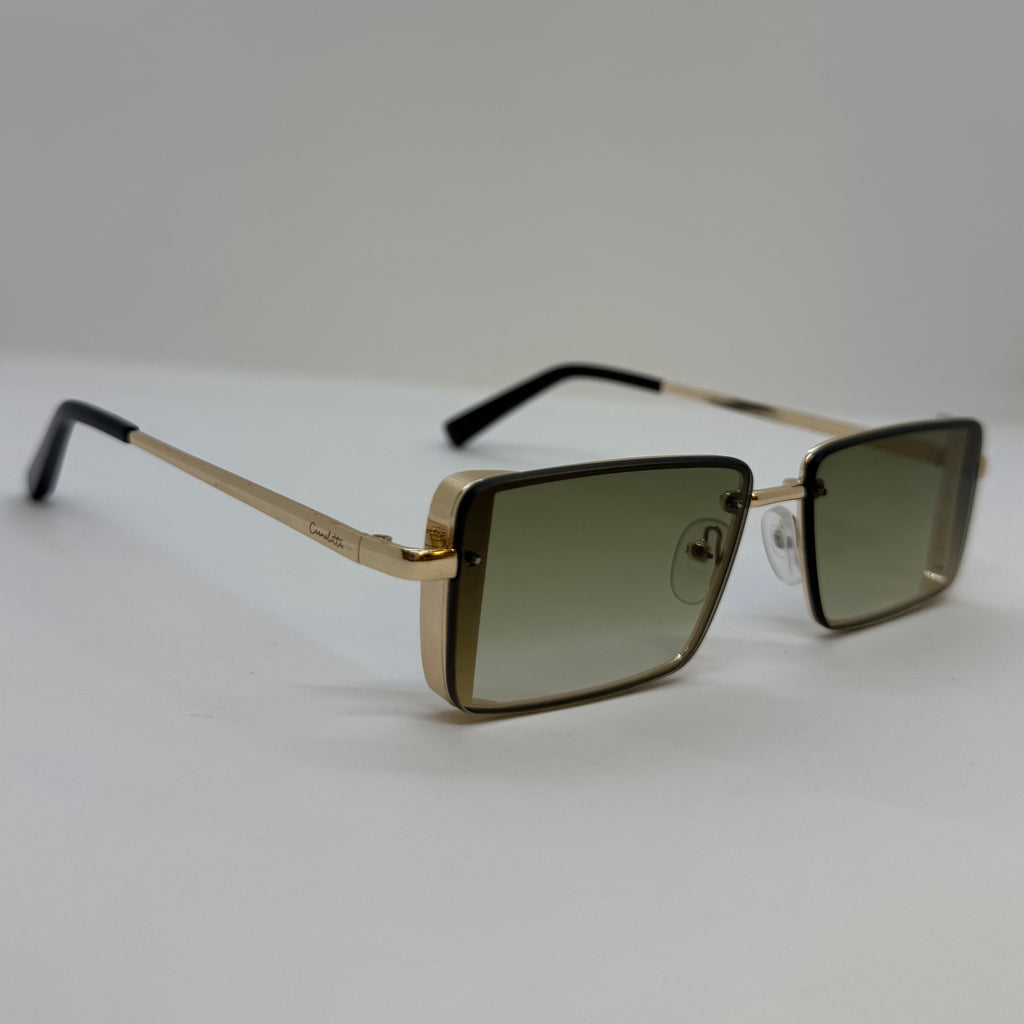 Óculos com hastes em meta dourado com lente verde degrade.