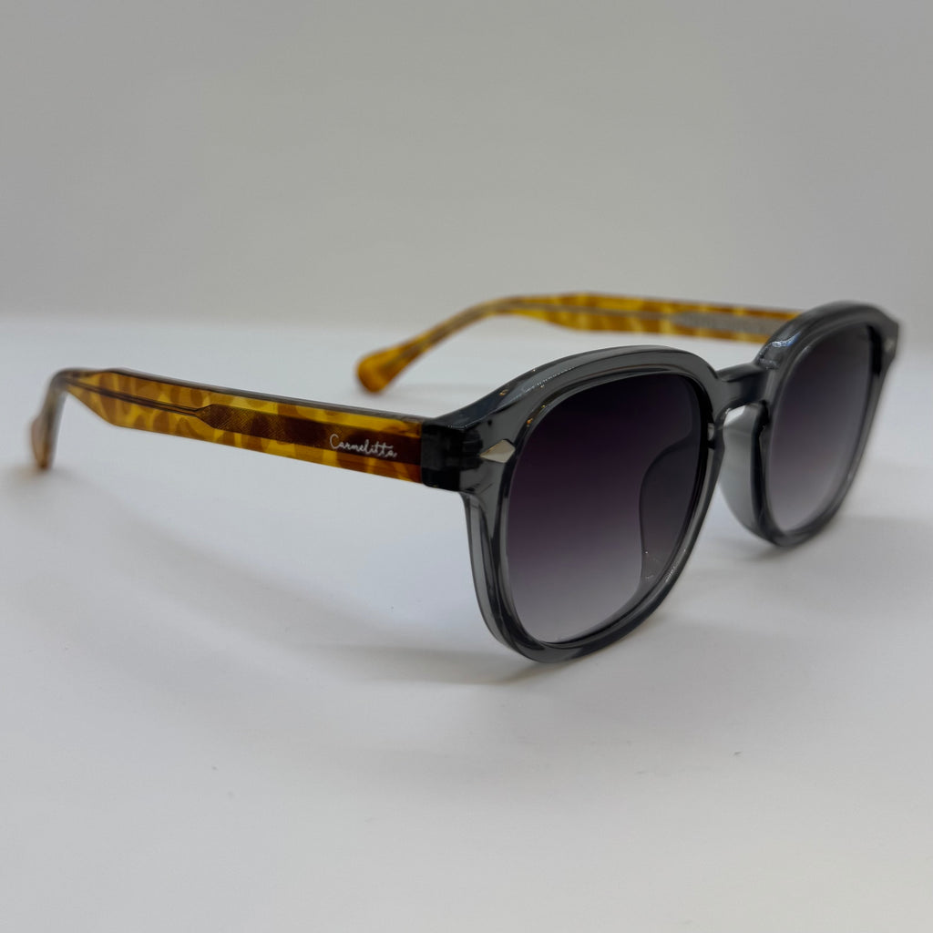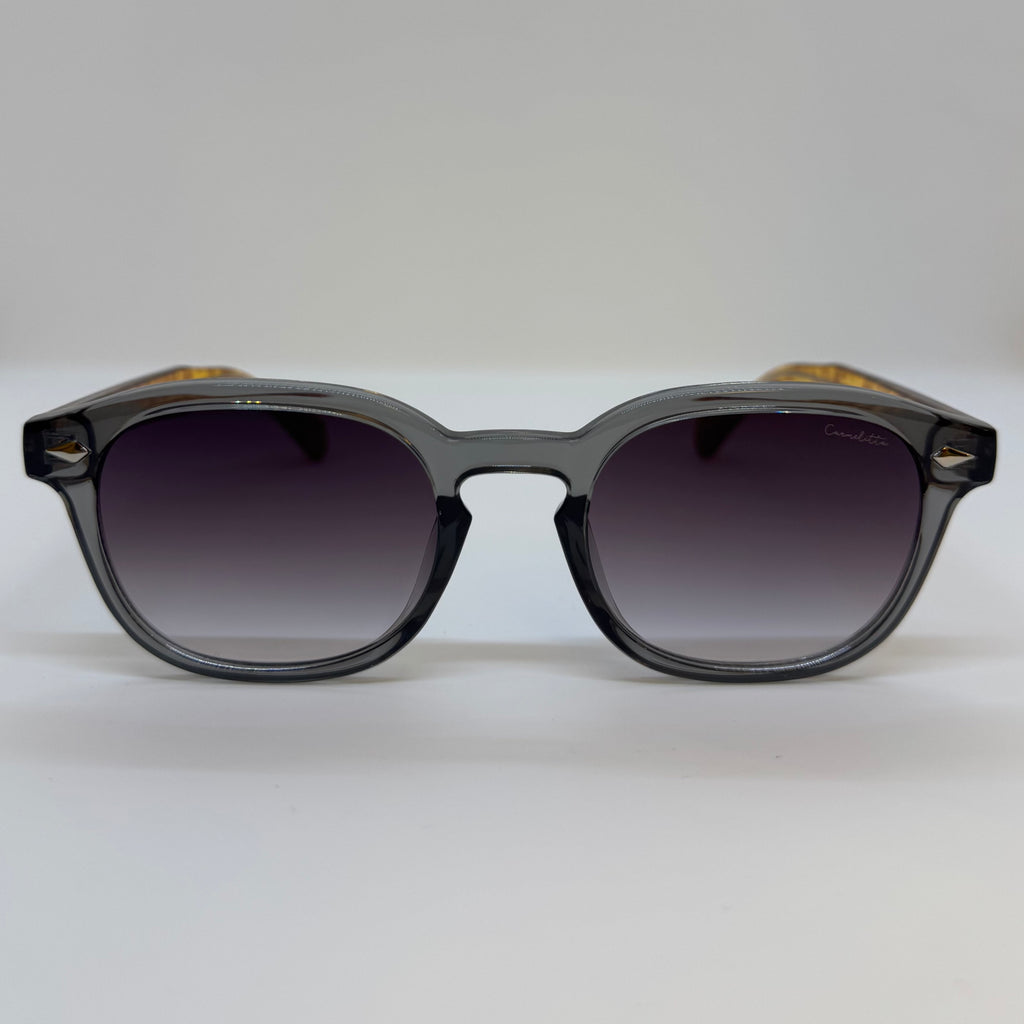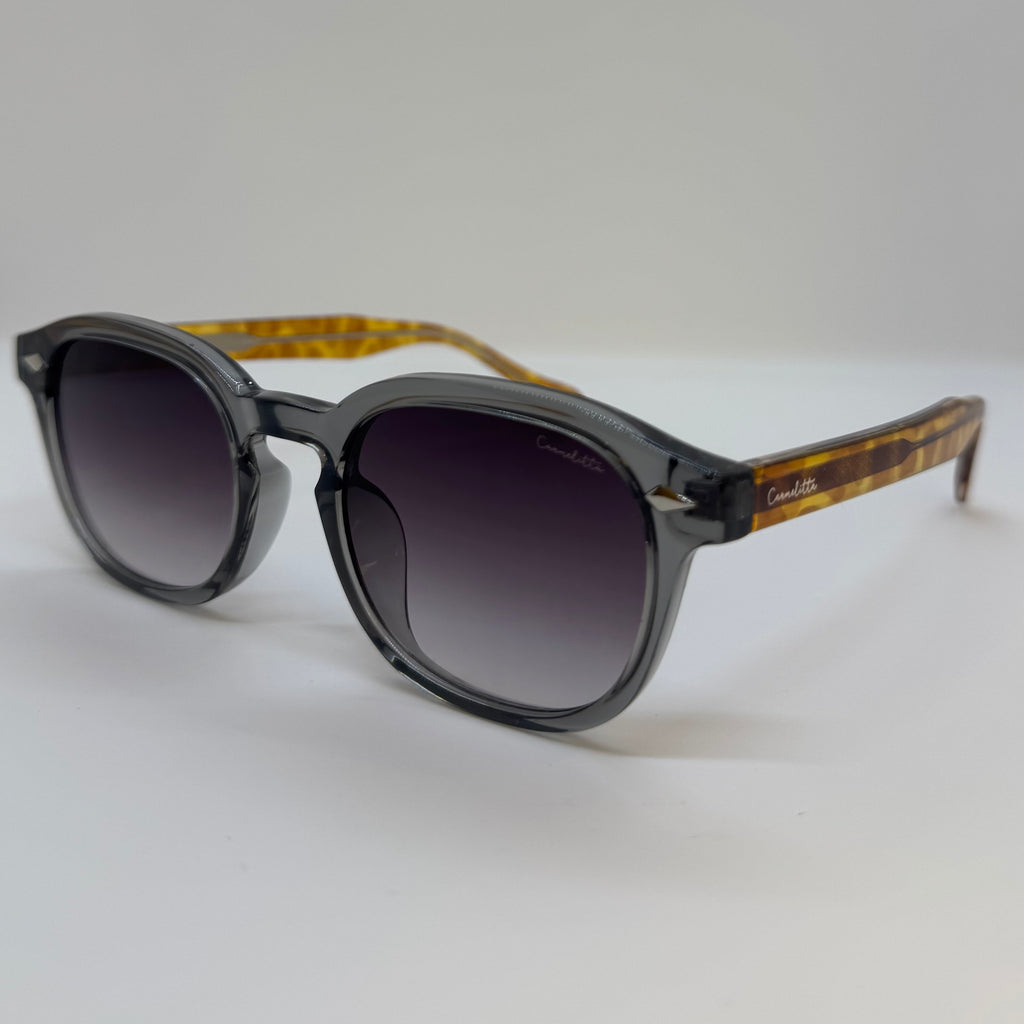 Óculos com hastes em jaguar, frente na cor cinza e e lente roxa degrade.