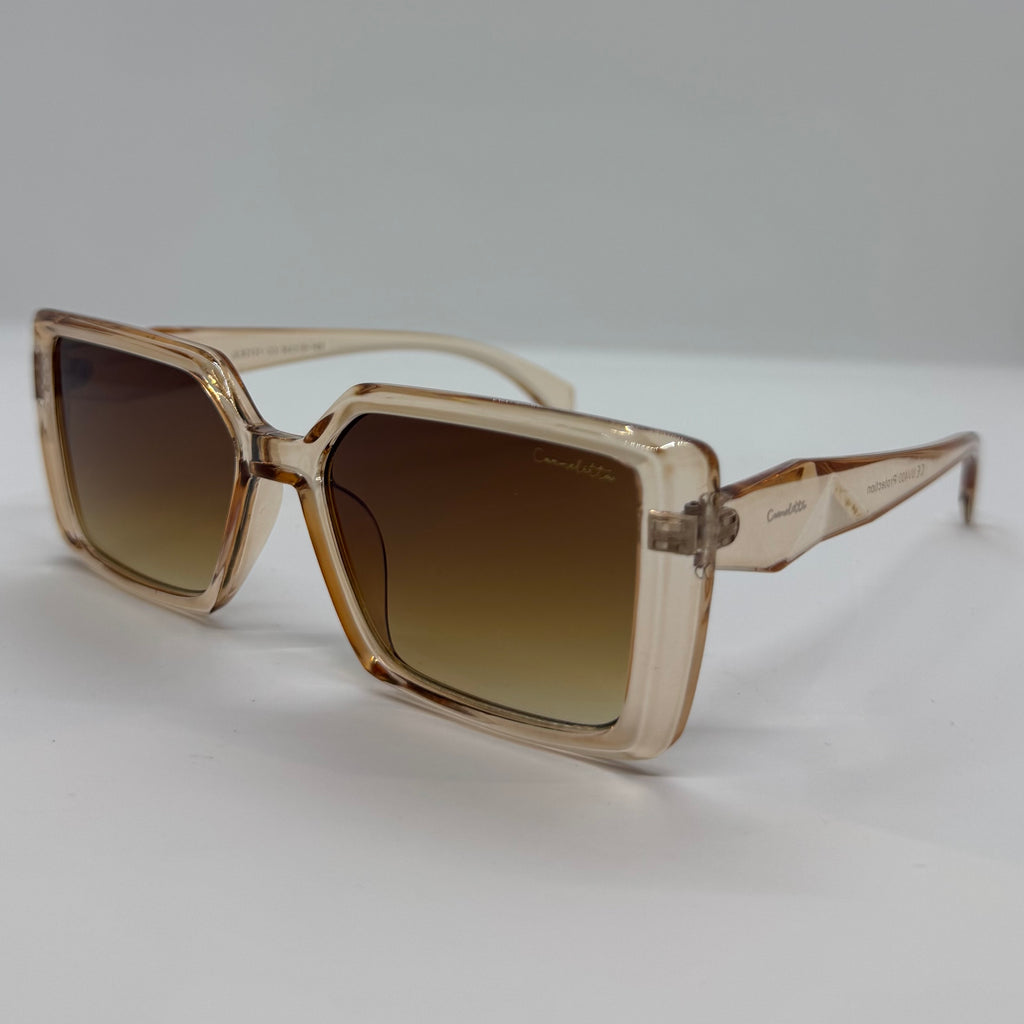Óculos com hastes rose translúcido com lente marrom degrade.