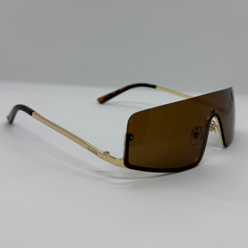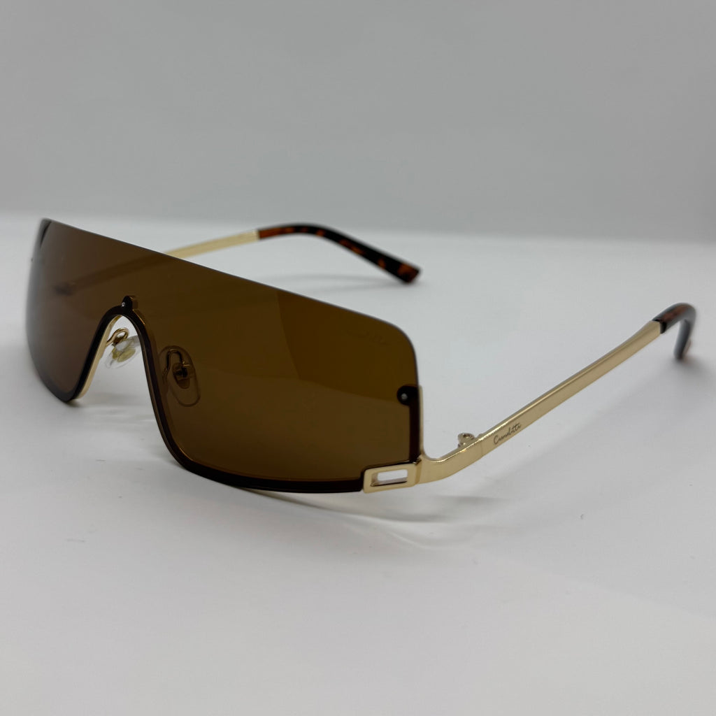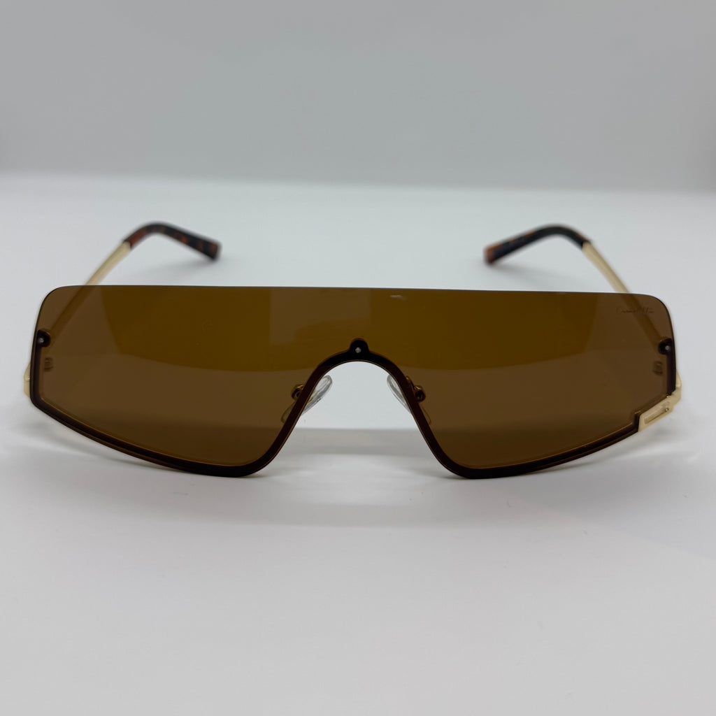 Óculos de sol com design escultural e ultra contemporâneo, composto por lente única contínua em tom marrom, que cria um visual imponente e futurista. A frente tem linhas angulares e acabamento limpo, transmitindo força e sofisticação.